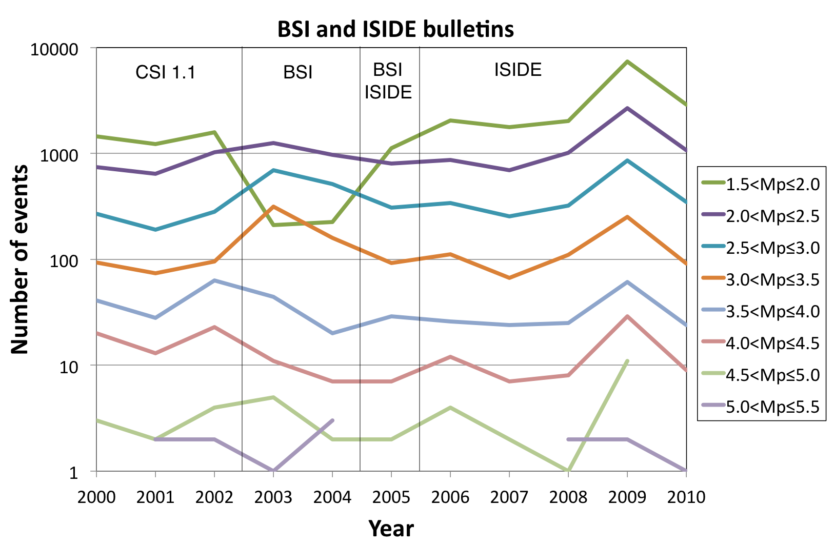 ▲ Figure S3. Number of earthquakes per year within various magnitude thresholds for BSI and ISIDE on-line bulletins. The last three years (from 2000 to 2002) of CSI 1.1 catalog are also reported for comparison.