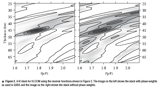 In addition to this stacking idea based on predicted arrival times, we also make use of phase weights for the stacks (Schimmel and Paulssen, 1997). This is a nonlinear stacking technique that weights the straight amplitude stack by the square of a sum of unit magnitude complex values constructed from the instantaneous phase of the receiver function. In areas where the receiver functions have similar phases, these complex values will sum constructively, yielding a multiplication factor close to unity. In areas where the phase varies greatly across the receiver functions, they will sum destructively, yielding a multiplication factor near zero. Thus, this technique greatly sharpens the stacks for coherent signals and dampens incoherent signals at the little expense of calculating the Hilbert transform of the receiver functions. Figure 3 shows a stack for IU.CCM both with and without the phase weighting. The phase-weighted stack does not have local maxima of similar amplitude as the maximum and the global maximum is sharper.