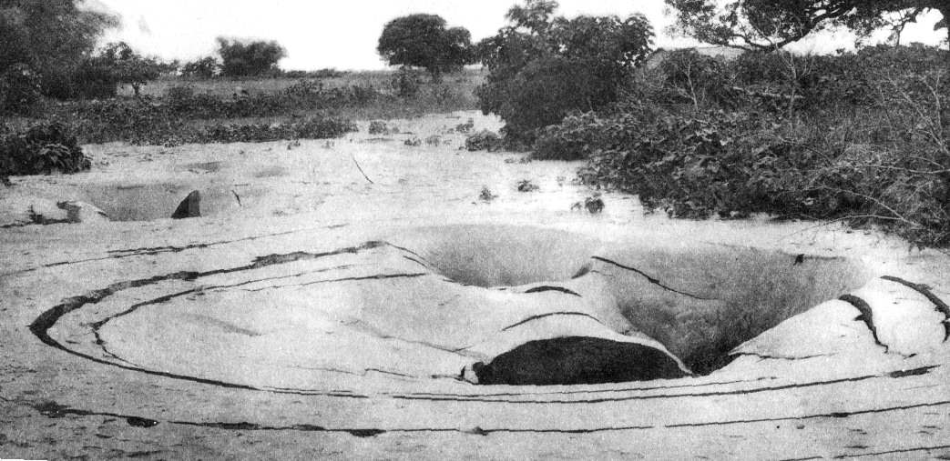 ▲Figure 4b. A sand vent near Rowmari photographed by LaTouche and reproduced by Oldham (1899), Plate 11. La Touche remarks in his report: "Subsequent to the ejection of sand, the surface sank down to a depth proportional to the amount of the material ejected, and several crater-like hollows were formed as the water drained back into the fissure. (Oldham, 1899 p258)