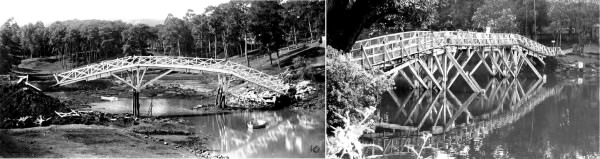 ▲Figure 8. The bridge across the almost empty Ward Lake in Shillong after the 1897 earthquake, and in 2003, reconstructed with lateral stays. The dam holding the waters of the artificial lake burst in the earthquake, killing Mr. J.W. Rossenrode, a retired surveyor and a child.