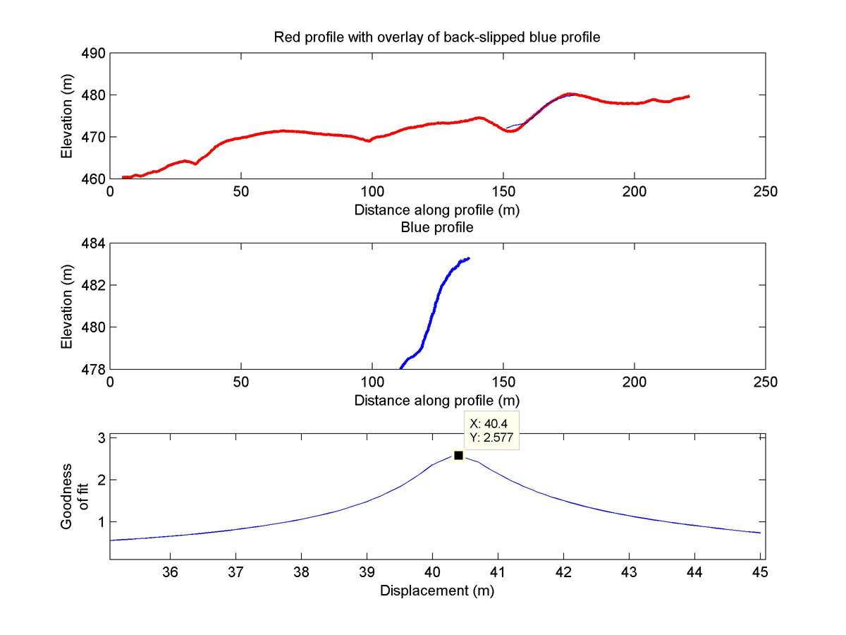 | 20.76km | 40 | 10 | medium | Head and toe of landslide offset by single narrow fault trace. Northwest and southeast edges of ring-shape displaced same amount. |