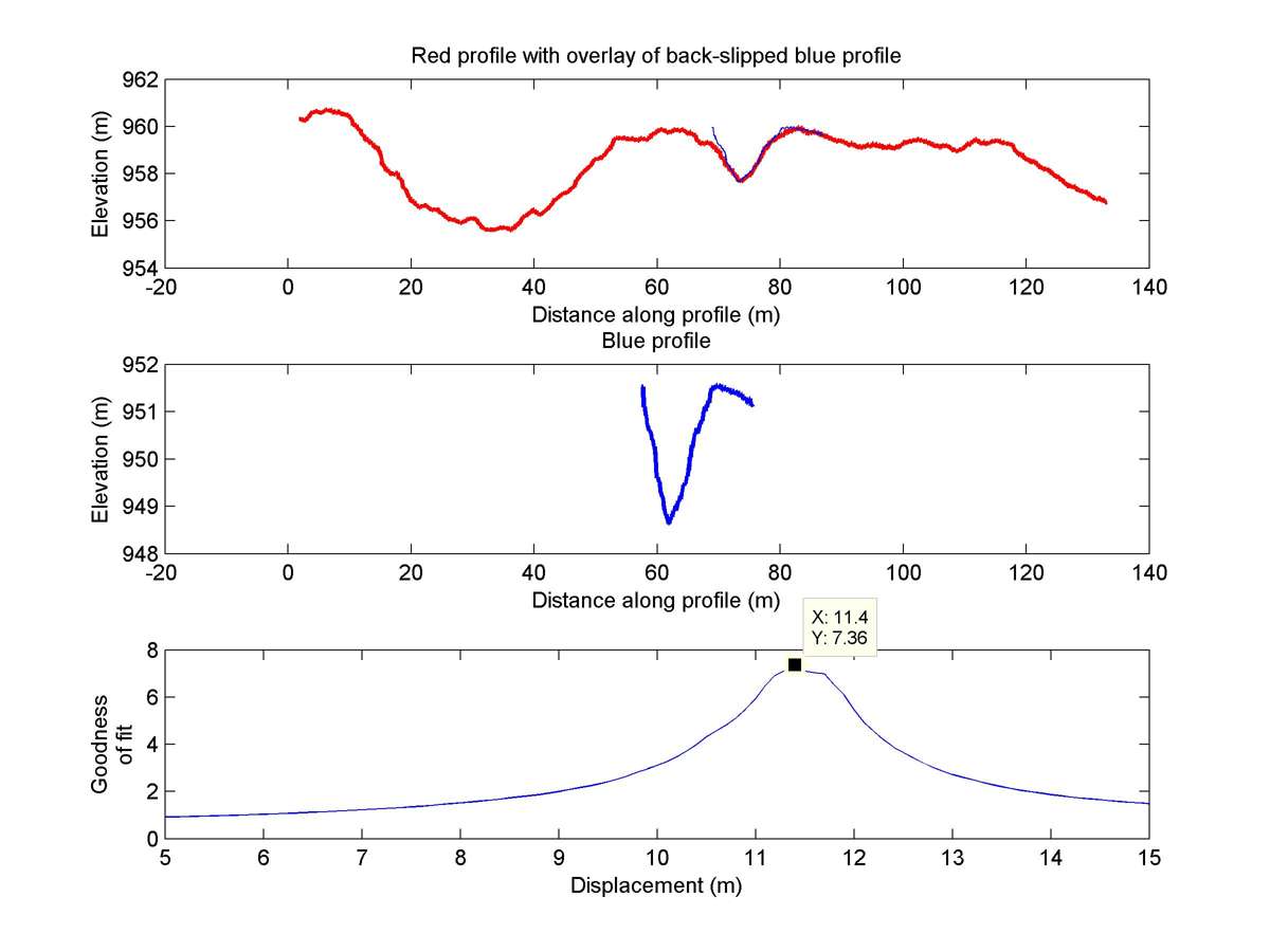 | 34.62160 | -118.29728 | 228.32 km | 11.4 | 10.5 - 13.0 | Moderate-Low | Offset scarp face gully. Offset distinct, but distributed over two fault traces, makes measurement and assessment of pre-earthquake channel morphology difficult. |