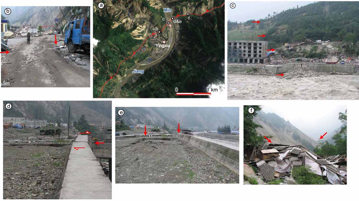 a) is a post-earthquake air photo of Yingxiu (modified from Fu et al., 2008), showing the locations of photos (b-f). b) The scarp to the west of the Yinxiu high terrace remnants and on T1 terrace. It is a gentle warp of 2.2 m high over 24 m-wide fault zone. Looking north. c) Surface rupture offset the concrete road at the Minjiang river west bank (point 239), also cut through multiple levels of terraces, at the location coinciding with a pre-existing geomorphic cumulative scarp. Looking southwest. On the eastern bank of the river, the concrete wall shows the right-lateral horizontal offset (d), across a broad zone of en echelon cracks (e). Looking south. f) Toward the northeast, the fault entered a dry tributary valley, causing extensive collapses along the southern steeply-slope valley wall, but without clear geomorphic scarps.