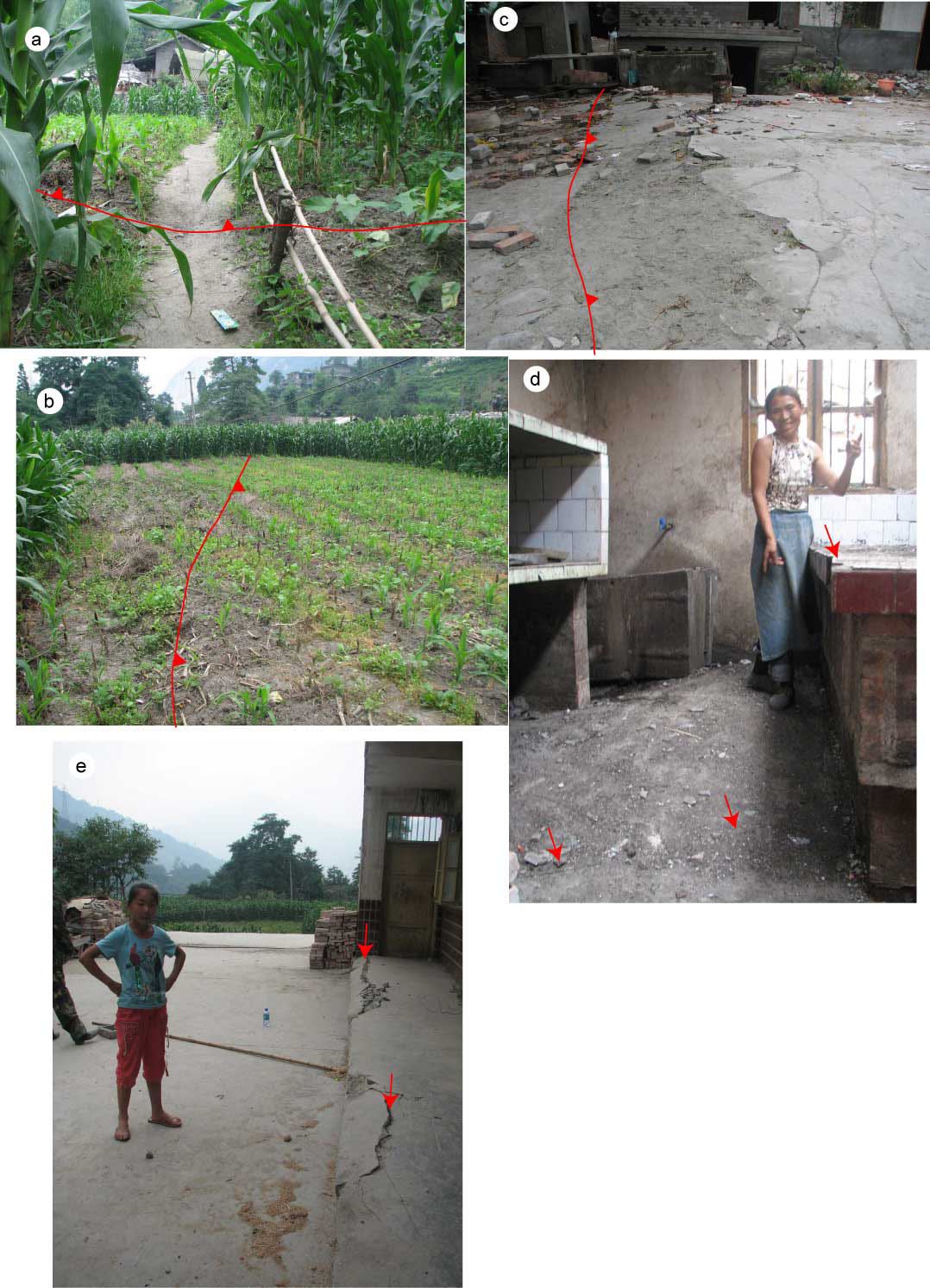 Several lines of evidence argue for a tectonic origin of the ground deformation seen at the Guxi village, Xuankou. The deformation zone, which passed through multiple houses and farm plots, occured in the relatively flat part of the valley, rather than on steep slopes. Along the deformation zone, a variety of deformation occurred, including a) monoclinal scarp (looking south) and b) warping of 18 m in width cut through corn fields with roughly east-west-striking and southeast-side-up. Looking northeast. c) A moletrack-like N38E-trending crack with southeast-side-up vertical separation of 0.2-0.4 m. Looking northeast. d) a house foundation moved ~10 cm southward, looking northeast. e) Inside the house, the kitchen floor was deformed with elongated bulge and hearth being tilted and cracked. In addition, local residents told that the fissuring and warping of their yards, houses and ground surface appeared to increase incrementally with occurrences of felt-sized aftershocks (post-seismic deformation?).