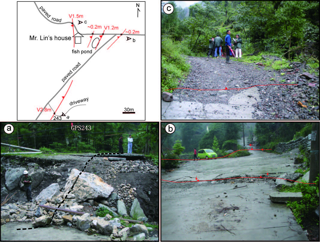 A fault-perpendicular paved road shows that the fault zone consisted of at least 3-4 branches, among which two had relatively large vertical separations of 1.2 m and 1.5 m, and the other two with nominal vertical separation of less than 0.2 m each. Photos (a-c) were taken at different positions to show lateral variation of the fault scarp. View locations and direction for a through c are shown in the mapview sketch of fault zone.