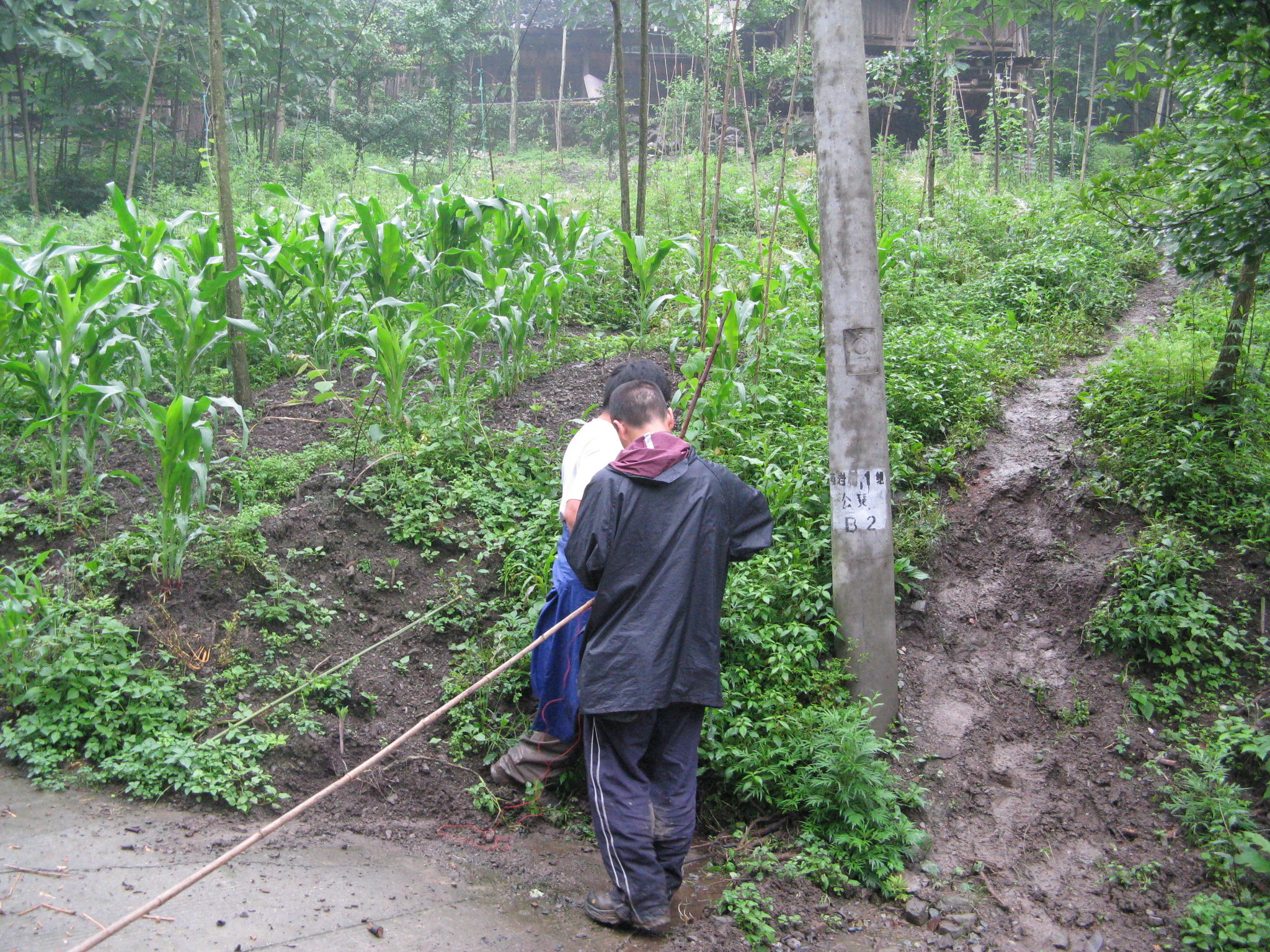 Fault runs parallel to a gulley, and cut through a villager's driveway, and uplifted the NW side by 2.8m. Looking north. Photo taken by J. Liu-Zeng, on June 18, 2008.
