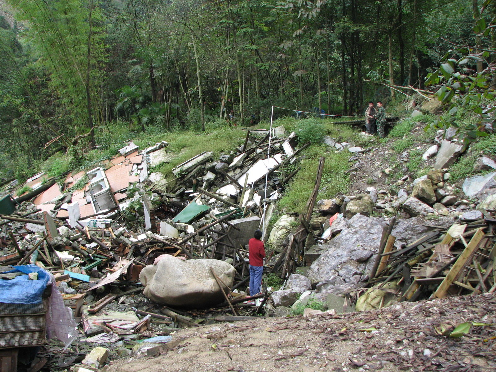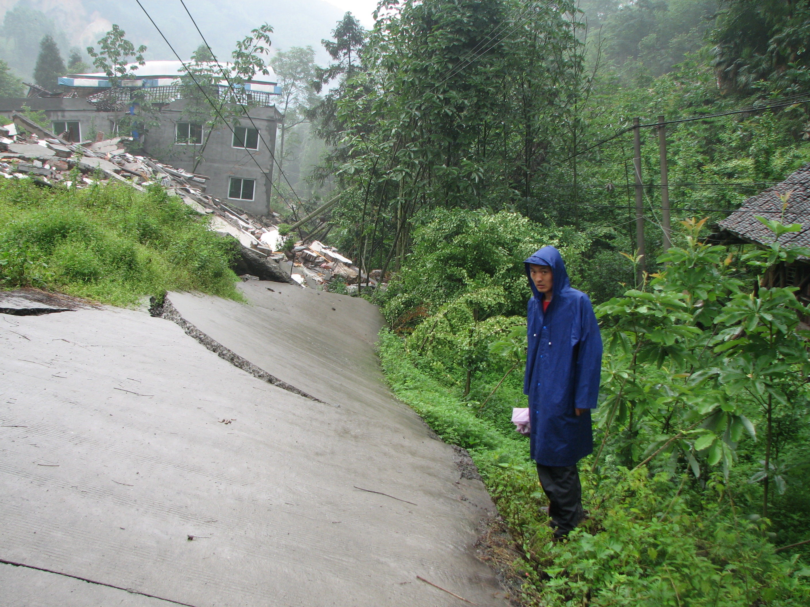 The 5.2m high fault scarp runs almost parallel to a concrete tourist drive road, which was tilted, NW-side up. The wooden-framed storage-room on the footwall still stood and coherent, most of the tiles on the roof did not fall either. Looking northeast. Photo taken by J. Liu-Zeng, on June 18, 2008.