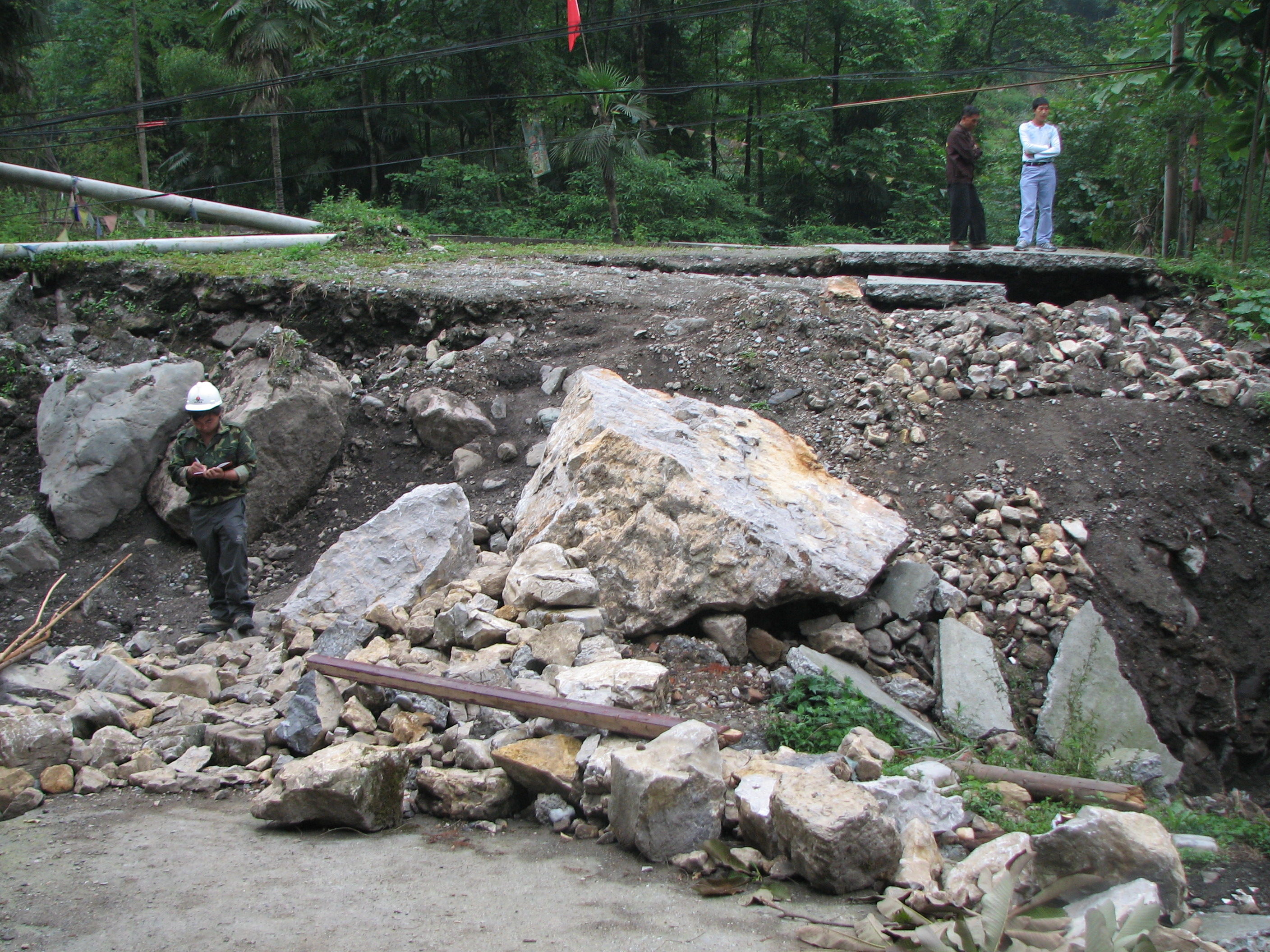 The flat paved road was tilted sideway to nearly vertical. Scarp height is larger than 2.8m. Fault striking N55E. Looking southwest. Photo taken by W. Li, on June 18, 2008.