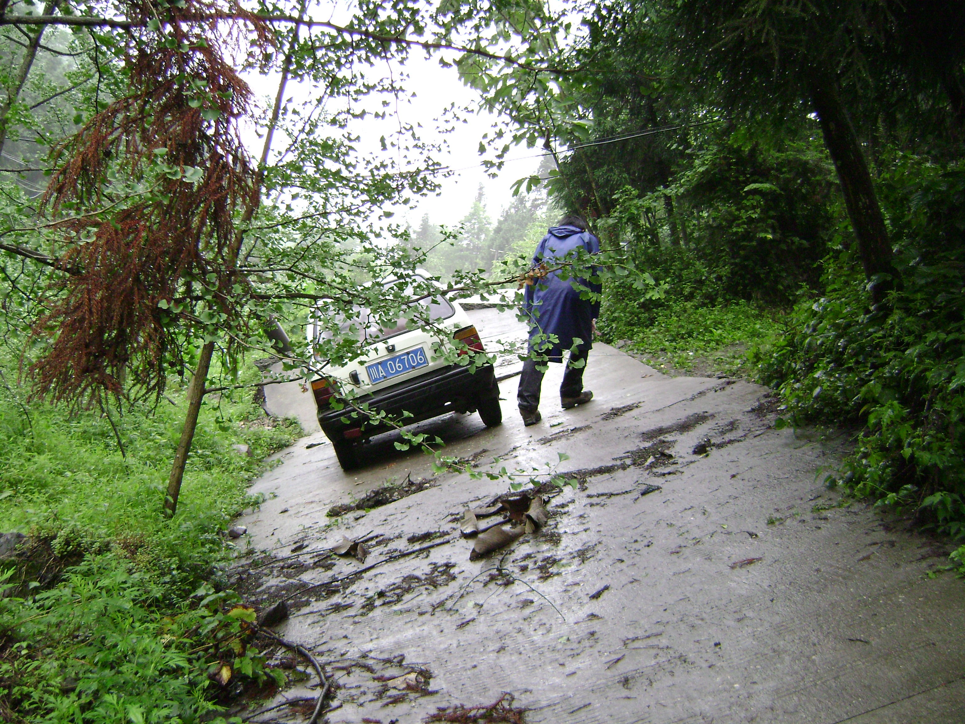 The paved road, which was almost parallel to the fault scarp, was tilted. The abandoned car was not overturned on the tilted road, which possibly suggests the ground uplifting speed at the site was mild. Looking southwest. Photo taken by W. Li, on June 18, 2008.