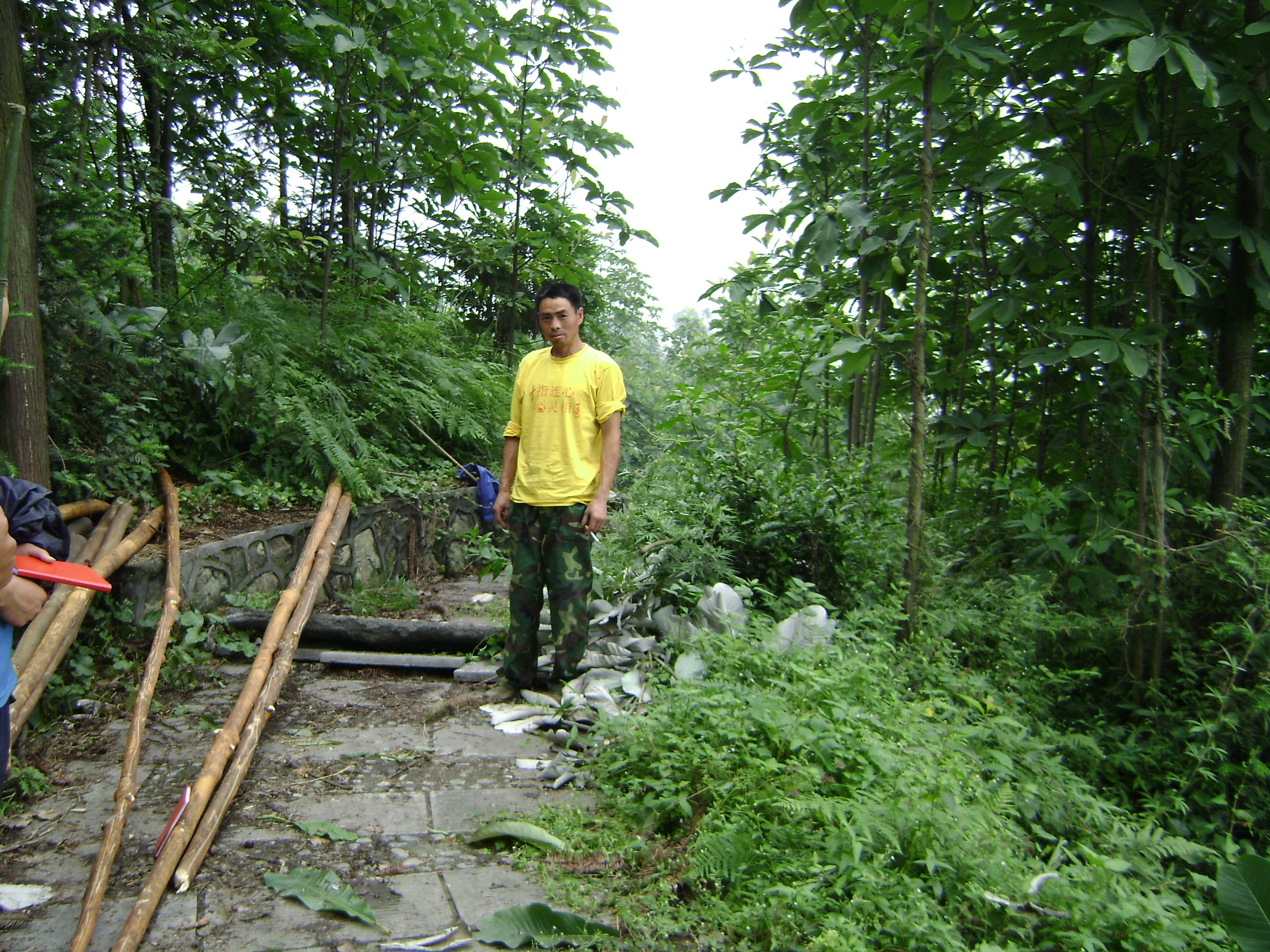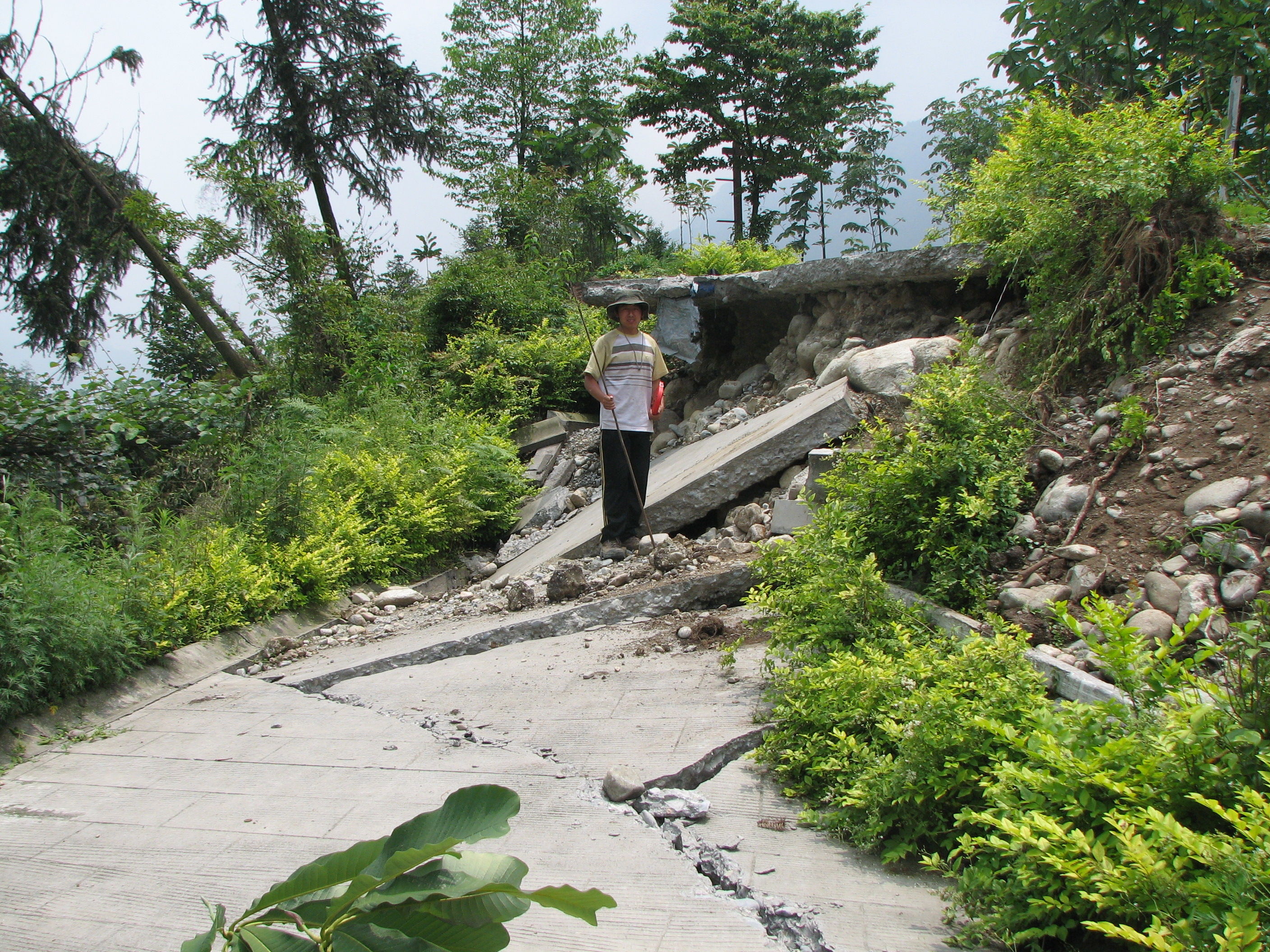 The N55E-striking fault cut through a trail. The concrete blocks stacked, indicating horizontal shortening. Dejiu Liu, a local resident described that the land on the northeast side of the fault zone rose in front of his eyes at the moment of rupturing. Looking southeast. Photo taken by L. Wen, on June 17, 2008.
