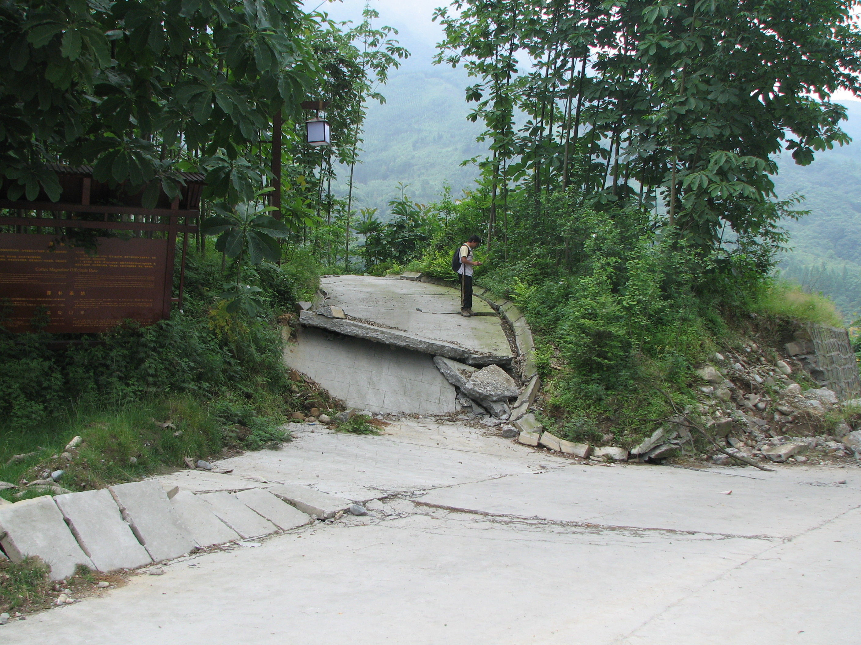 A concrete paved road, which slopes down to the northwest, was offset, southeast side-up. The stacking of concrete slabs suggests compression and shortening. Looking east. Photo taken by J. Liu-Zeng, on June 13, 2008