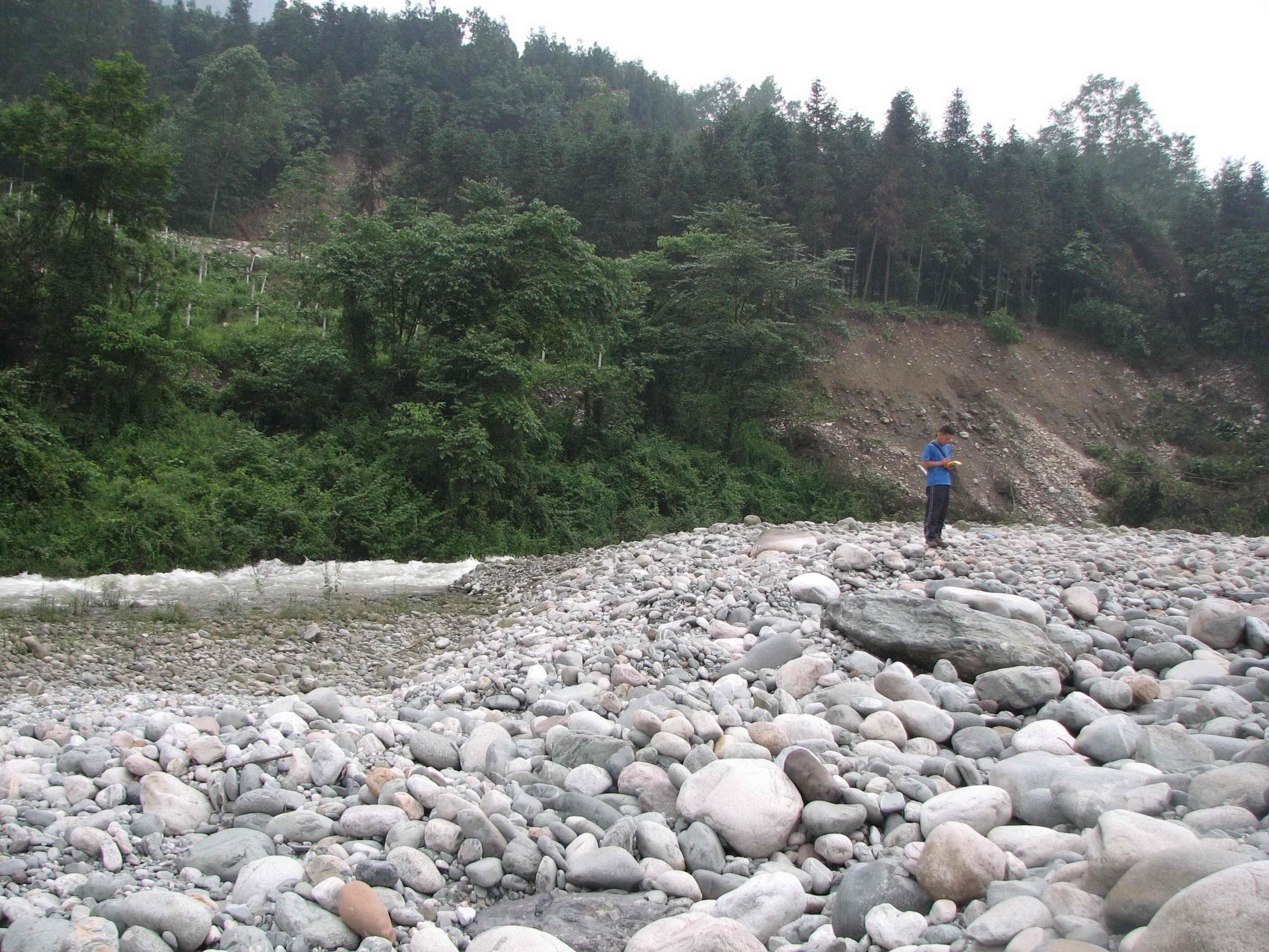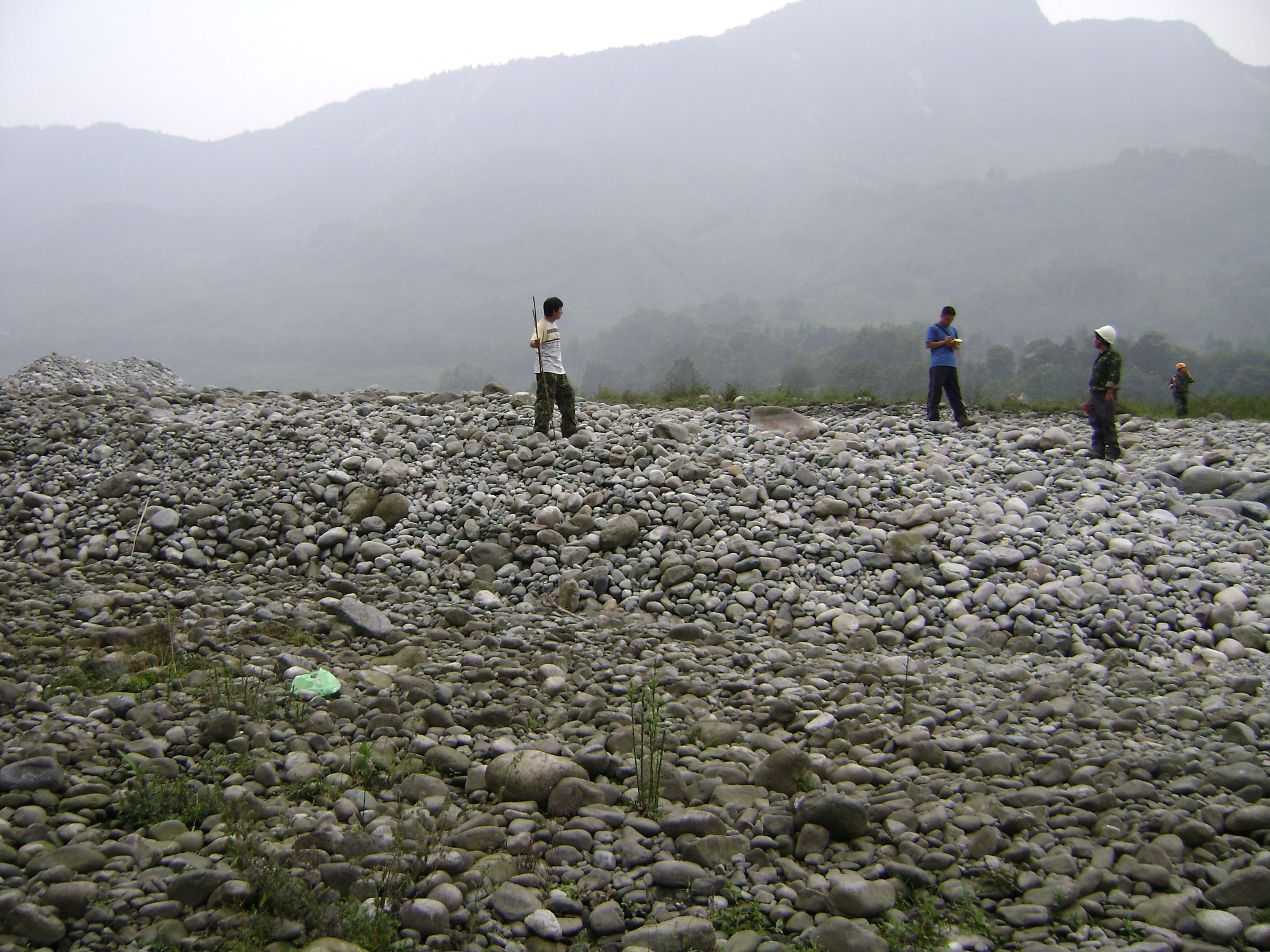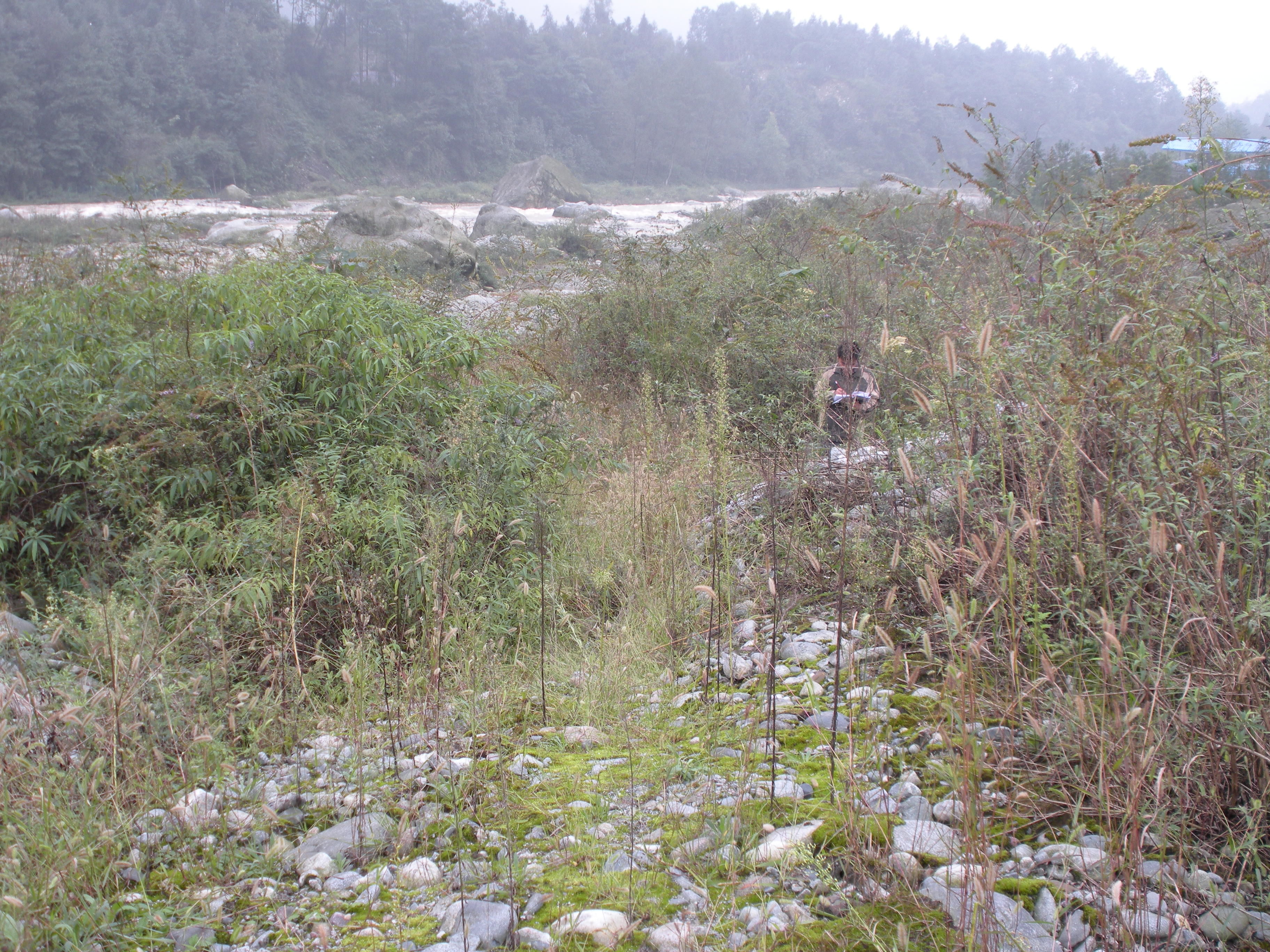 At point 963, the fault scarp offset a dirt drive road and nearby river bank stone wall. It then continued northeastward through the bouldery flood plain of the Baisha river. Looking southwest. Photo taken by J. Liu-Zeng, on September 29, 2008.