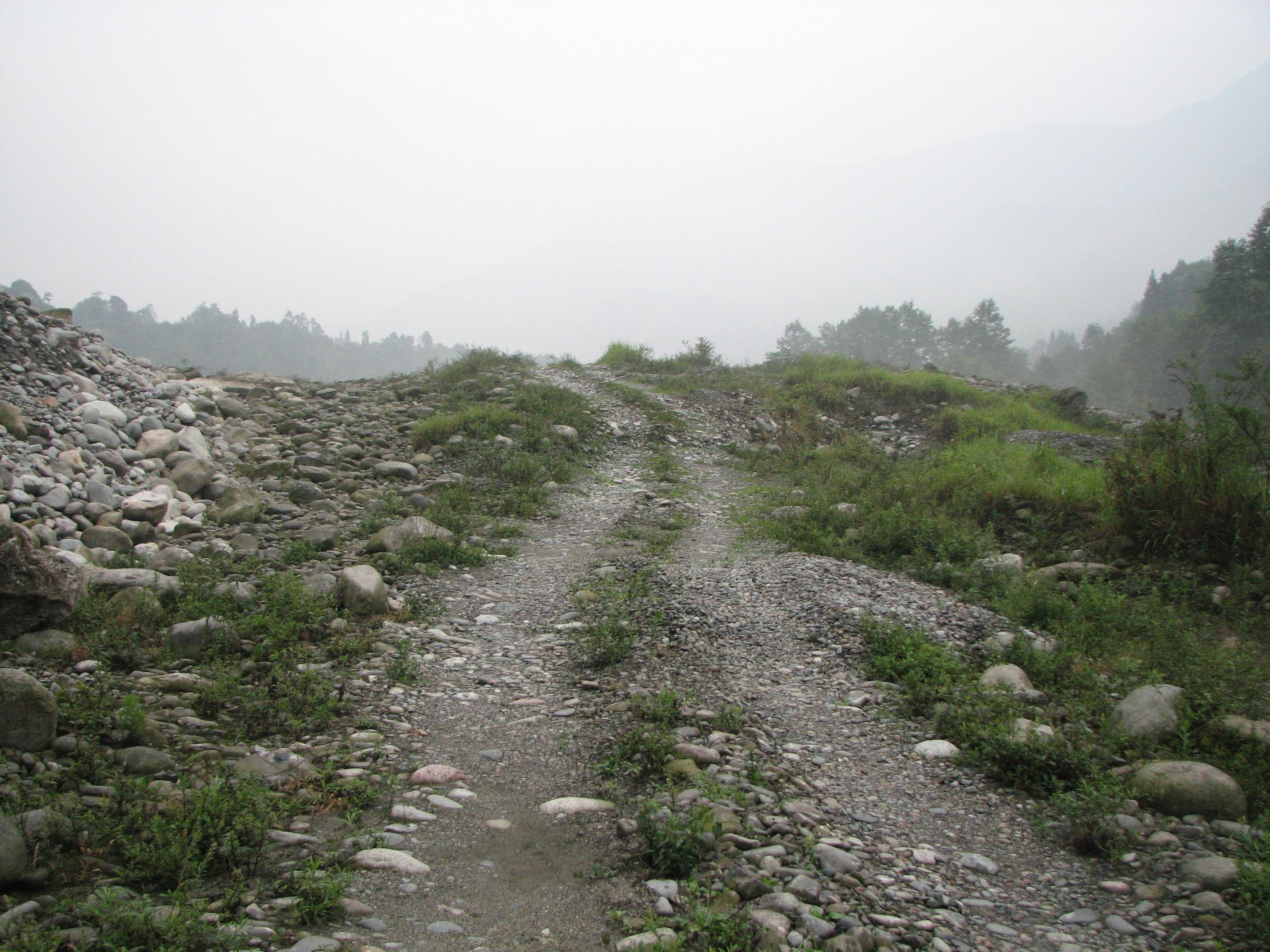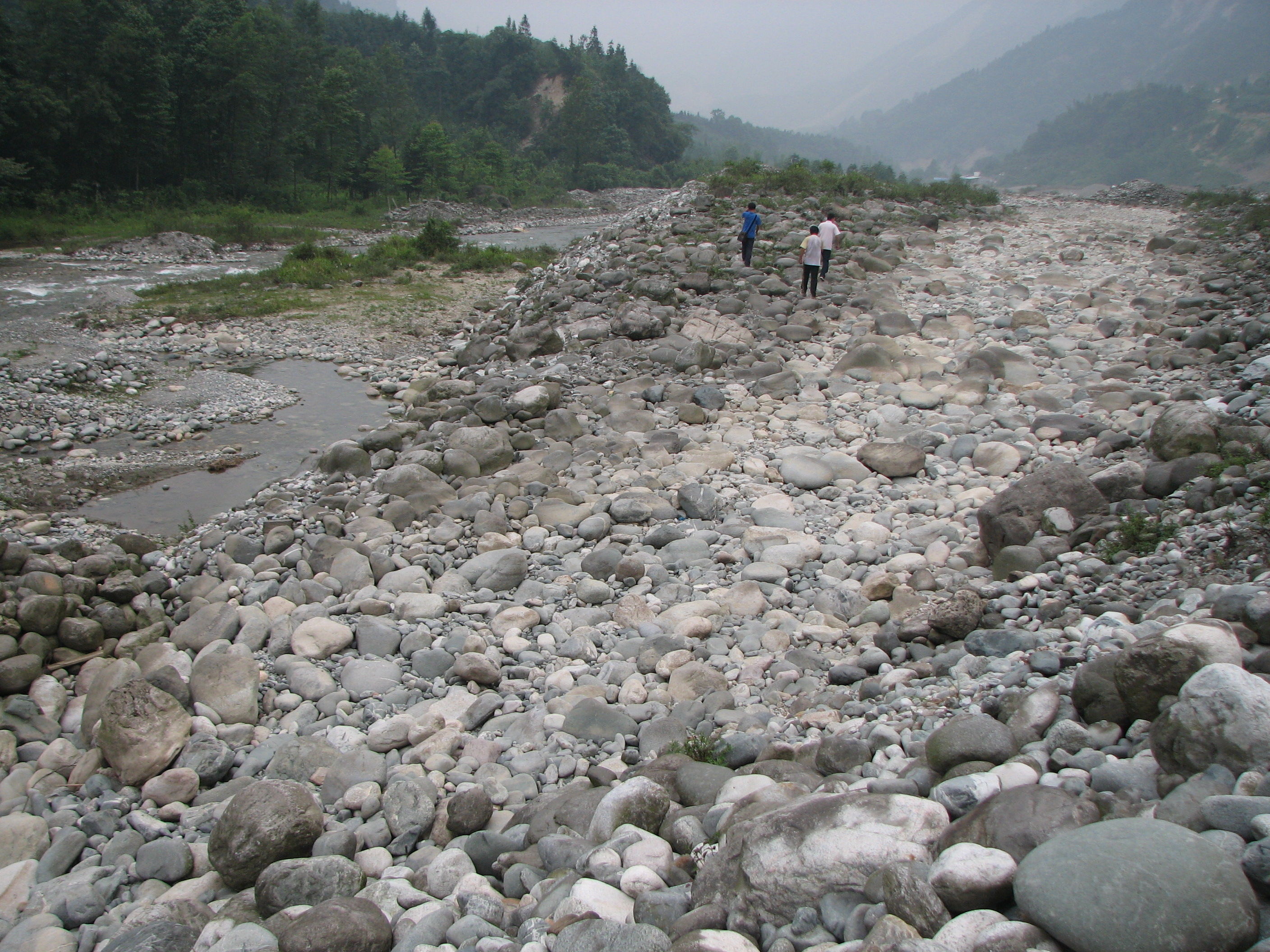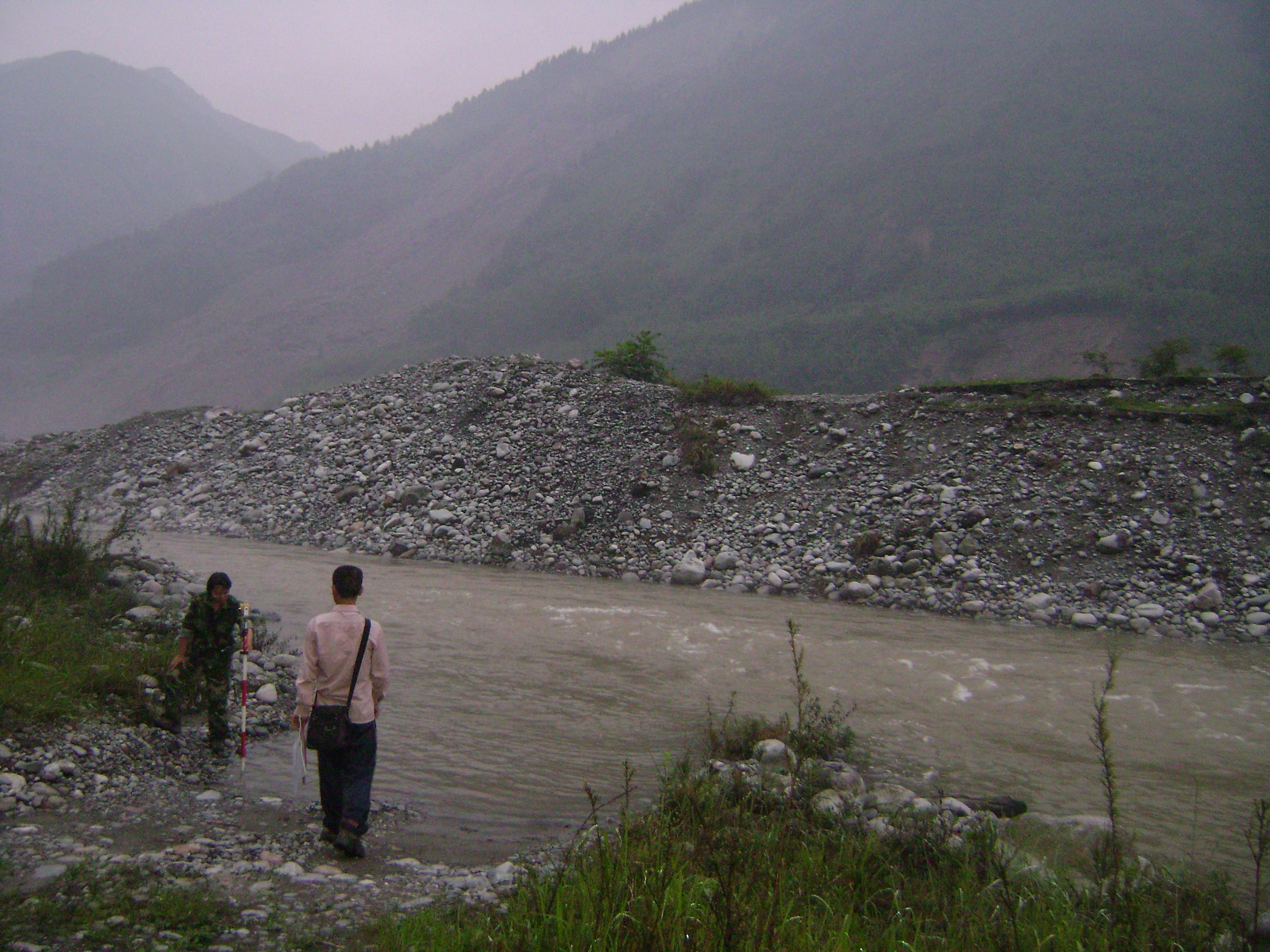At point 963, the fault scarp offset a dirt drive road and nearby river bank stone wall. It then continued northeastward through the bouldery flood plain of the Baisha river. Looking southwest. Photo taken by J. Liu-Zeng, on September 29, 2008.