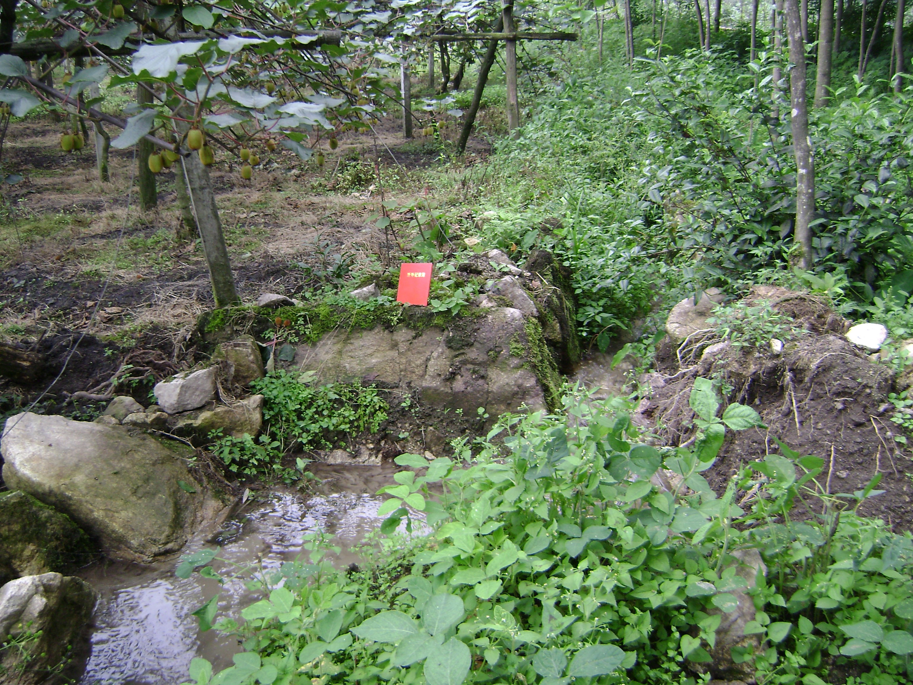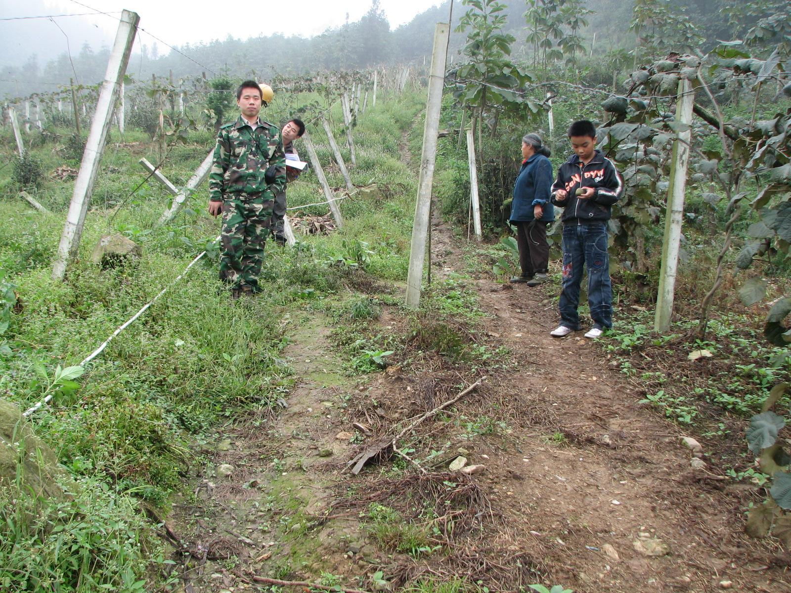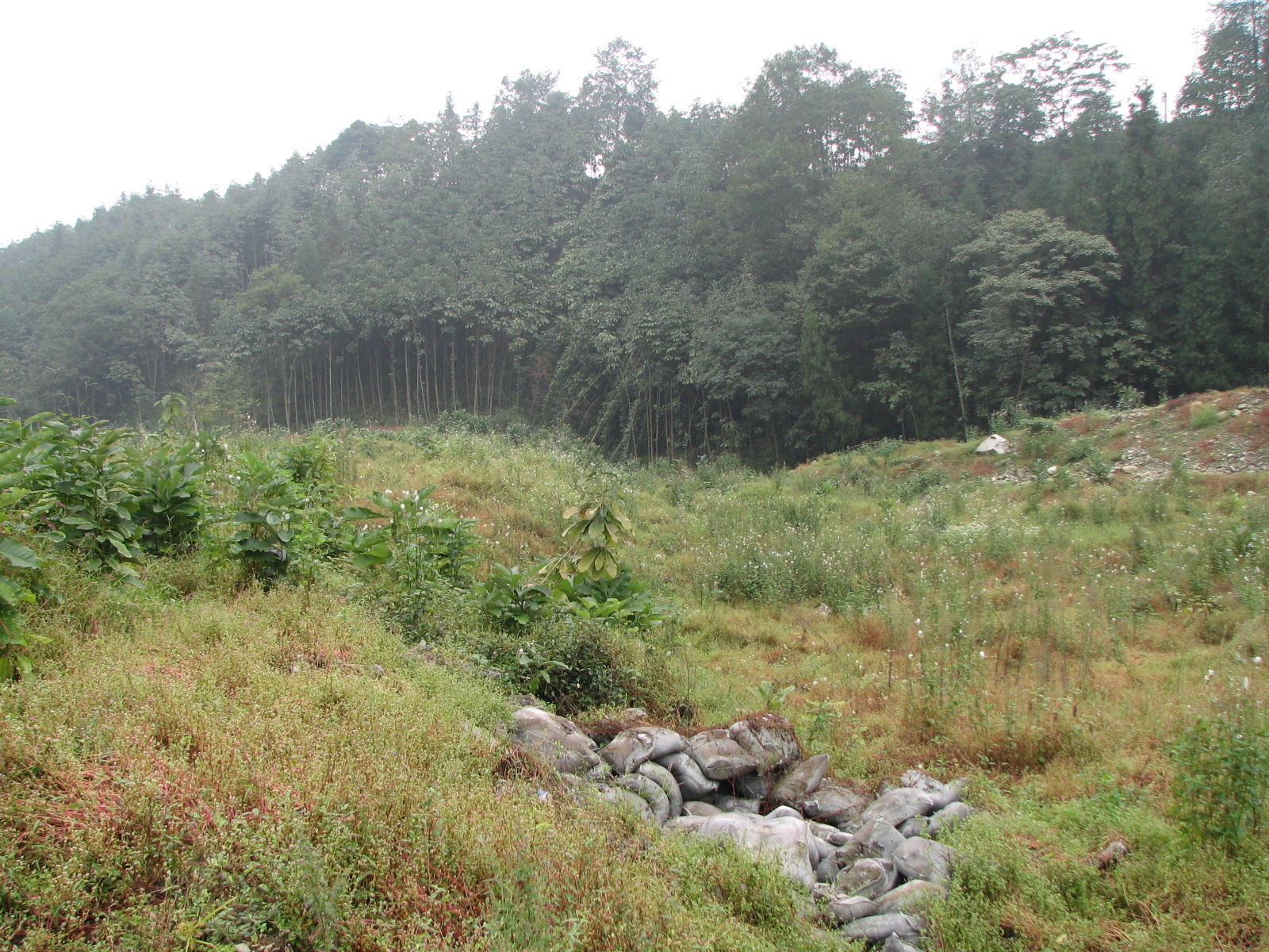 North of the Gaoyuan village, a N45W-trending footpath trail in the kiwi plantation was offset 2.1 m right-laterally, with southeast side-up vertical separation. Fault locally strikes N60E. The picture was taken four months after the earthquake. The offset trail was abandoned, and a new trail which lines up straight from that northwest of the fault, was established. Looking north. Photo taken by J. Liu-Zeng, on September 29, 2008.