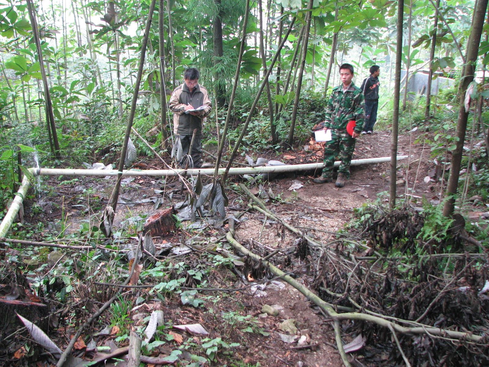 Looking southwestward from point 970, the rupture cut through terrace riser, indicated by tilted trees. At the base of the riser, the fault cut and damaged a manmade fishery wall. Looking southwest. Photo taken by J. Liu-Zeng, on September 29, 2008.