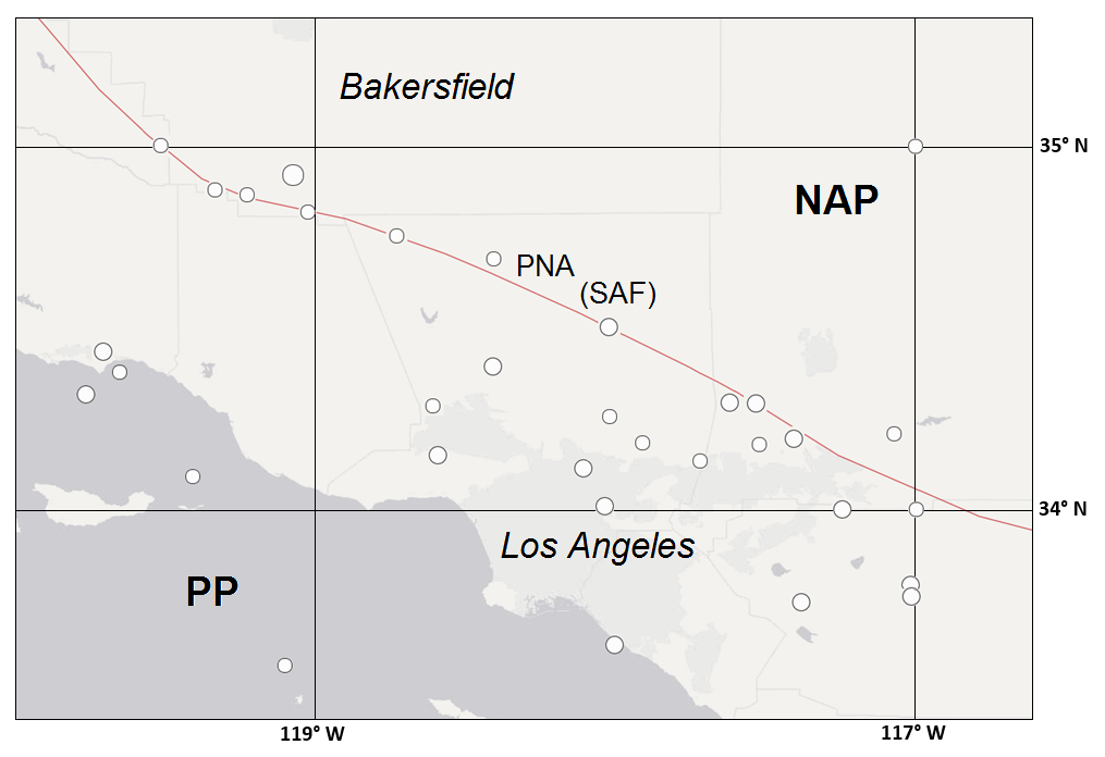 Location. Generally an east–west-oriented province spanning the Pacific–North American (PNA) plate boundary from south of Bakersfield southward into the Los Angeles basin (Fig. S1), characterized by east–west-trending ranges and associated east–west-striking thrust faults, bounded by the Pacific Ocean on the west and the Mojave Desert on the east. The Mojave segment of the San Andreas fault (SAF) ruptured through the province northeast of Los Angeles in the great Fort Tejon shock of 1857.