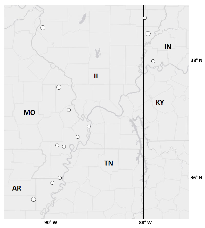 Figure S10. Locations of M ≥ 4.3 mainshocks in the New Madrid seismic zone in the midplate region of North America from 1 January 1900 to 1 April 2014. States: AR, Arkansas; IL, Illinois; IN, Indiana; KY, Kentucky; MO, Missouri; TN, Tennessee. (Data: ANSS.)