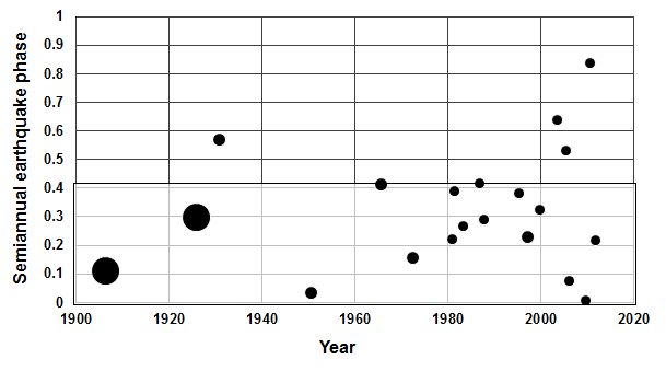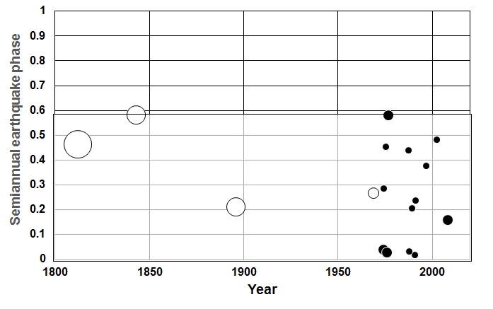 Results. Since 1923, mainshocks in this region have occurred almost exclusively in the first 58% of the semiannual cycle between phase 0.0 and 0.58 (Fig. S13). The clustering is significant at p = 0.003 (binomial) for the events (at least 14 out of 15) that occurred within that 58% sector of the cycle. For all 15 events during that nine-decade interval, the Schuster probability is p = 0.05, with a net semiannual phase of 0.33.