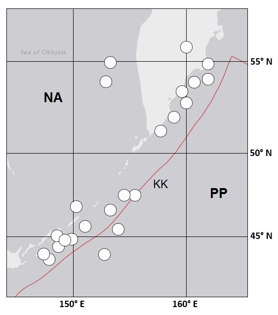Location. In the northwestern Pacific Ocean along the Kuril Islands and Kamchatka Peninsula from Hokkaido to the Aleutian Trench, adjacent to the Pacific–North American (Okhotsk microplate) subduction zone (Fig. S12).