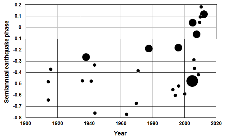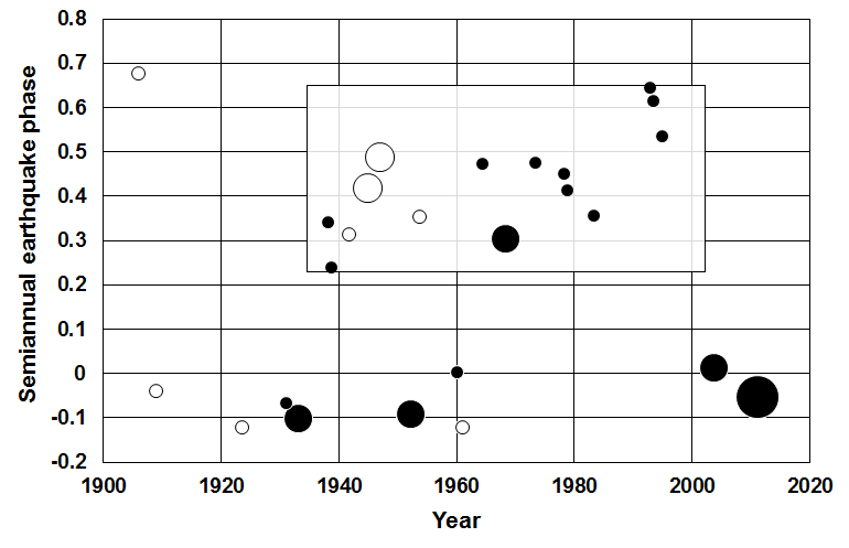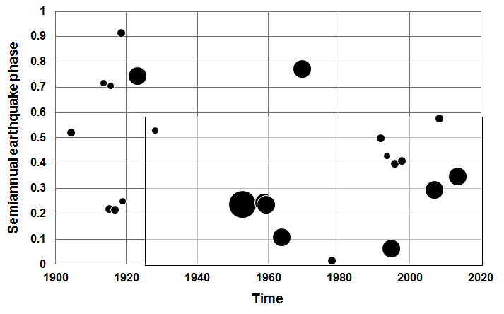 During the seven decades from 1933 to 2003 (northern Honshu earthquake), the random-in-time hypothesis is rejected with a binomial probability of p = 0.0003 for the events (at least 15 out of 18) that occurred in 41% of the semiannual cycle between phases 0.236 and 0.643 (Fig. S15). For all 18 events during that seven-decade interval, the Schuster probability is p = 0.013, with a net semiannual phase of 0.42.