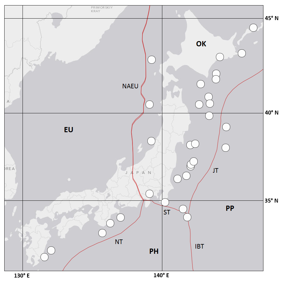 Location. Along the Japan archipelago from south of the Island of Kyushu to north of the Island of Hokkaido, including the Pacific plate (east), the Eurasian plate (west), the Philippine Sea plate (south) and North American plate (Okhotsk microplate; north), and the convergent plate boundaries between them (Fig. S14). The data are divided spatially at 36.0° N in the discussion below to illustrate the similarity in semiannual earthquake clustering between the greater Tokyo region near Sagami Bay and the region to the north where the 11 March 2011 M 9 Tohoku-Oki megathrust earthquake was centered.