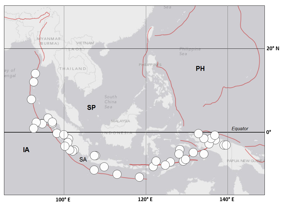 Figure S16. Locations of M ≥ 7.6 mainshocks along the Sunda arc from 1 January 1900 to 1 April 2014. Plates: SP, Sunda; IA, Indio-Australian; PH, Philippine Sea. Plate boundary: SA, Sunda arc (subduction zone, transform near New Guinea). (Data: ANSS.)