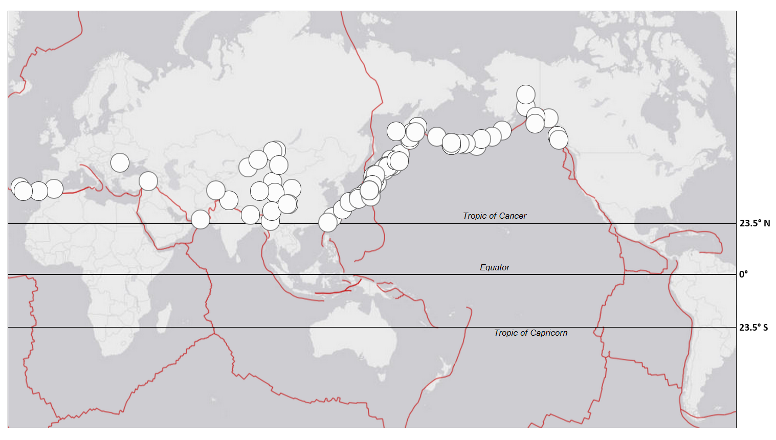 Figure S18. Locations of M ≥ 7.8 mainshocks in the northern hemisphere north of 23.5° N (Tropic of Cancer) from 1 January 1900 to 13 February 2015. (Data: ANSS.)