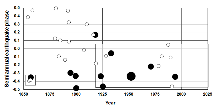 Figure S15. Distribution of M ≥ 7.6 mainshocks in the semiannual cycle in the Japan region from 1 January 1900 to 1 April 2014. Note that the semiannual phases are projected onto a shifted vertical axis in order to show the clustered phases without wrapping. Equinox is 0.0; solstice is 0.5. Pre-equinox events at the bottom of the chart are plotted as the negative supplement of their phase angle. Circle symbols denote events north (solid) and south (open) of latitude 36.0° N (as discussed in the text) within the size ranges of M ≥ 9 (large), 9 > M ≥ 8 (medium), and 8 > M ≥ 7.6 (small). Outlined rectangular area highlights the clustered mainshocks treated in the case study discussion. (Data: ANSS.)