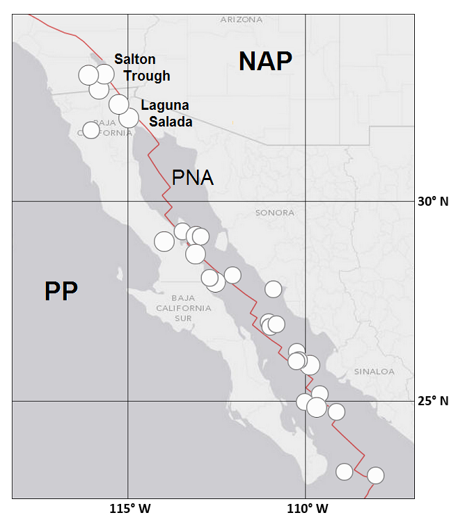 Location. Along the southern half of the PNA plate boundary, from the Salton Sea in California southward to the mouth of the Gulf of California (Fig. S3). The northern and southern ends of this fault system are, respectively, the approximate southern terminus of the SAF and the inferred transform–subduction–spreading triple-junction between the Pacific, North American, and Rivera Plates.