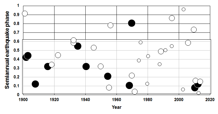 Figure S19. Distribution of M ≥ 7.8 mainshocks in the semiannual cycle for events in the northern hemisphere north of 23.5° N (Tropic of Cancer) from 1 January 1900 to 13 February 2015. Equinox is 0.0 and 1.0; solstice is 0.5. Solid circles: large, M ≥ 9; small, 9 > M ≥ 8.4. Open circles: large, 8.4 > M ≥ 8.0; small, 8.0 > M ≥ 7.8. (Data: ANSS.)