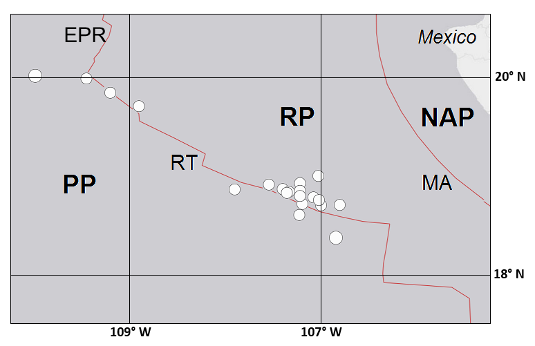 Figure S6. Locations of M ≥ 6.0 mainshocks along the Rivera Transform from 1 January 1900 to 1 April 2014. Plates: PP, Pacific; NAP, North American; RP, Rivera. Plate boundaries: RT, Rivera (transform); EPR, East Pacific Rise (spreading); MA, Middle America (subduction). (Data: ANSS.)