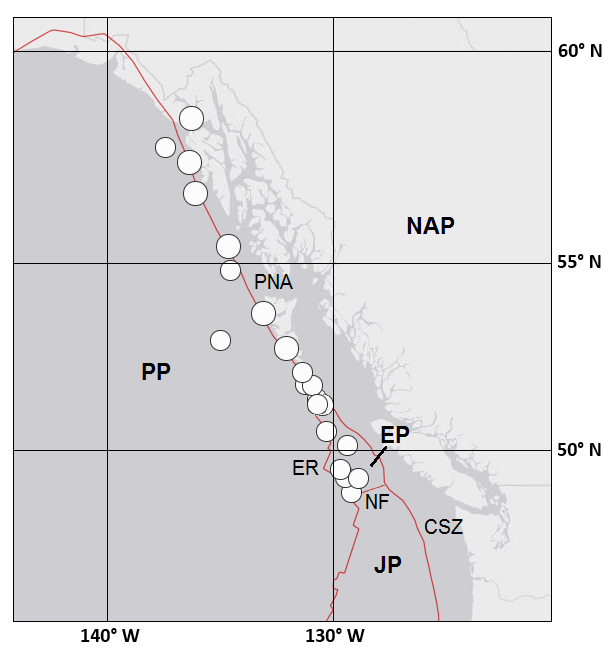 Figure S8. Locations of M ≥ 6.3 mainshocks along the Queen Charlotte–Fairweather fault system and Explorer Ridge, from 1 January 1900 to 1 April 2014. Plates: PP, Pacific; NAP, North American; EP, Explorer; JP, Juan de Fuca. Plate boundaries: PNA, Pacific–North American (transform); ER, Explorer Ridge (spreading); CSZ, Cascadia subduction zone; NF, Nootka fault. (Data: ANSS.)