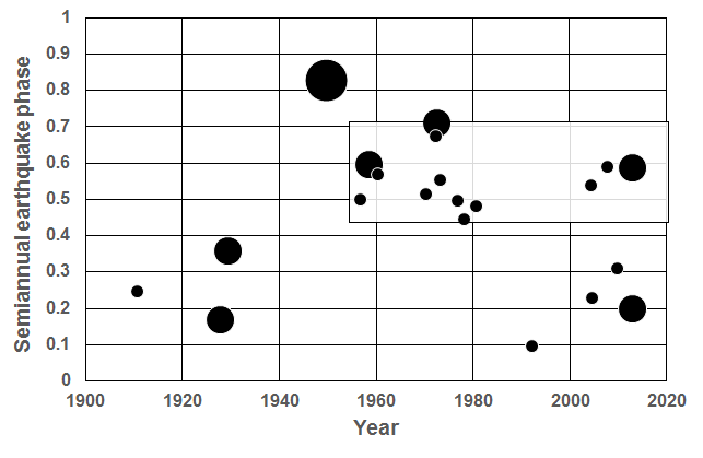 Figure S13. Distribution of M ≥ 7.5 mainshocks in the semiannual cycle for events along the Kuril–Kamchatka subduction zone from 1 January 1900 to 1 April 2014. Equinox is 0.0 and 1.0; solstice is 0.5. Circles: large, M ≥ 9; medium, 9 > M ≥ 8; small, 8 > M ≥ 7.5. Outlined rectangular area highlights the clustered mainshocks treated in the case study discussion. (Data: ANSS.)