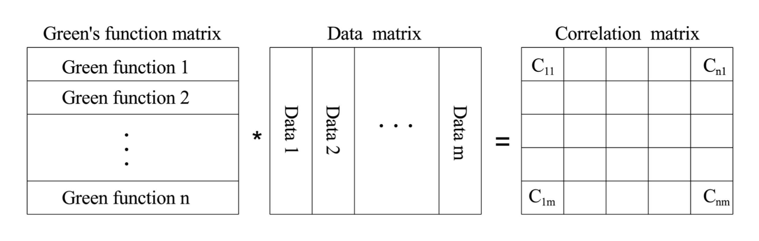 Figure S1. A schematic illustrating the multiplication of Green’s functions and processed data for estimation of equidistant matrix coefficients (after Withers et al., 1999). (Asterisk denotes convolution.)