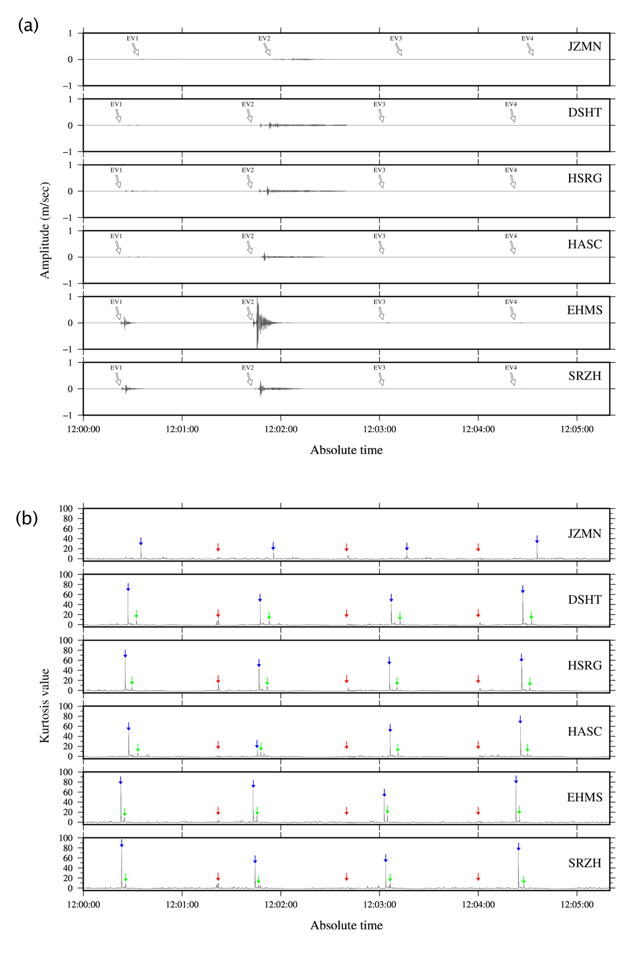Figure S2. Synthetic data. (a) Synthetic waveforms for the four events listed in Table S1. (b) The kurtosis characteristic functions obtained after band-pass filtering the synthetic waveforms between 1 and 10 Hz and using a 3 s sliding window for the kurtosis calculation. Blue and green arrows indicate P- and S-wave phases highlighted by the kurtosis analysis. Red arrows show some artificial phase enhancement due to disturbances caused by merging event waveforms.