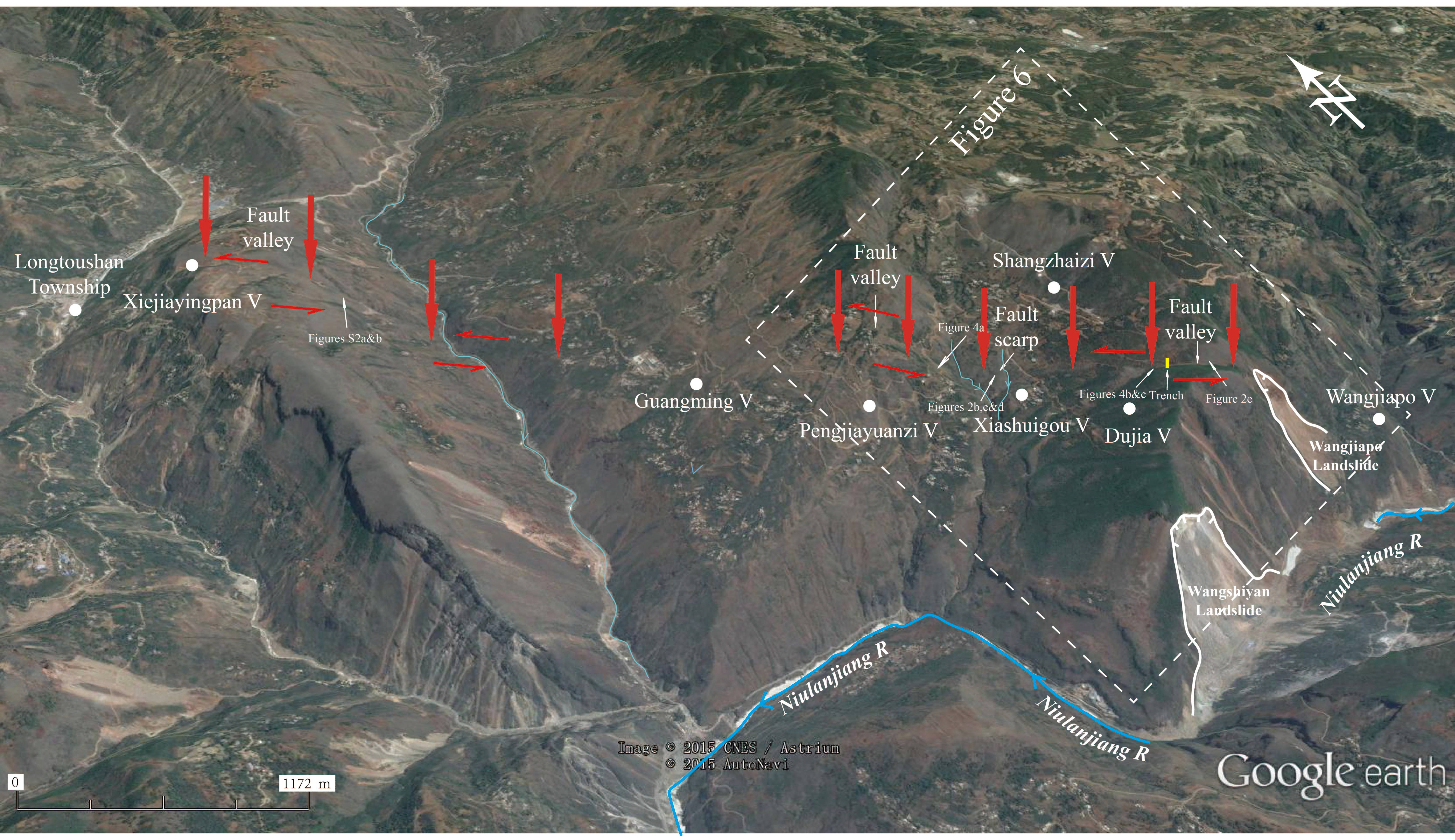 Figure S1. Traces of the northwest-trending Baogunao–Xiaohe fault demonstrated on the satellite image by Google Earth (image was taken on 5 May 2015 after the Ludian earthquake). Red arrows point to the obvious morphologic expressions of the Baogunao–Xiaohe fault, which are demonstrated by the northwest-trending fault valleys, fault scarps, discontinuous linear features, and the west–northwest-trending fault plane dipping 65° E (Figs. 4a and 9a–c in the main article). The offset ranges show that the fault is basically left-lateral with normal component (west side up). The primary surface ruptures are mainly observed between the two southern fault valleys. The yellow rectangle near Duija Village represents the location of the trench that was excavated across the earthquake surface rupture zone. The locations of Figures 2, additional parts of 4, and 6 (in the main article) are also indicated.