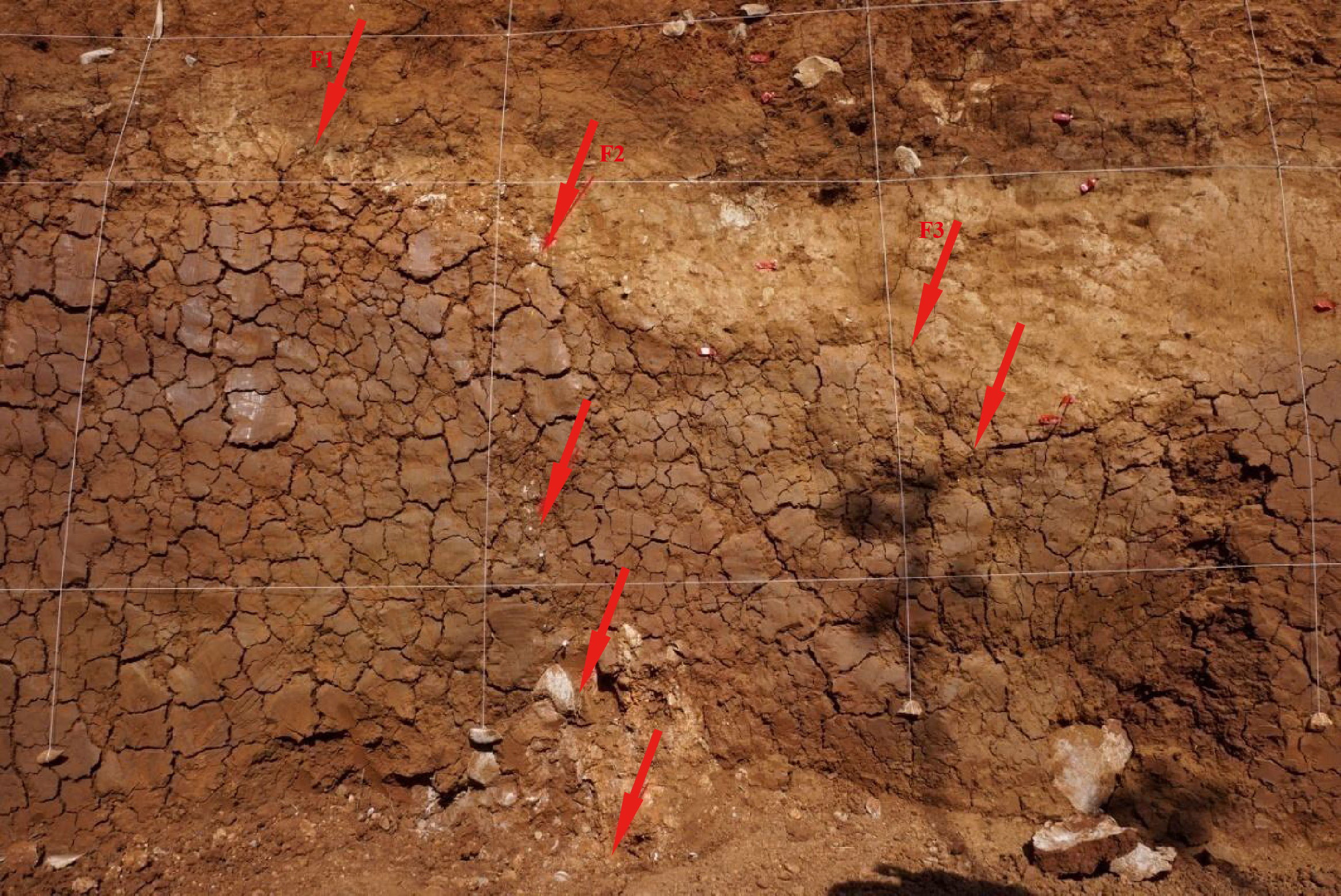 Figure S2. Close-up view showing geological evidence of the F2 fault branch on the northwestern exposure wall of the trench, which is witnessed by imbricated gravels.
