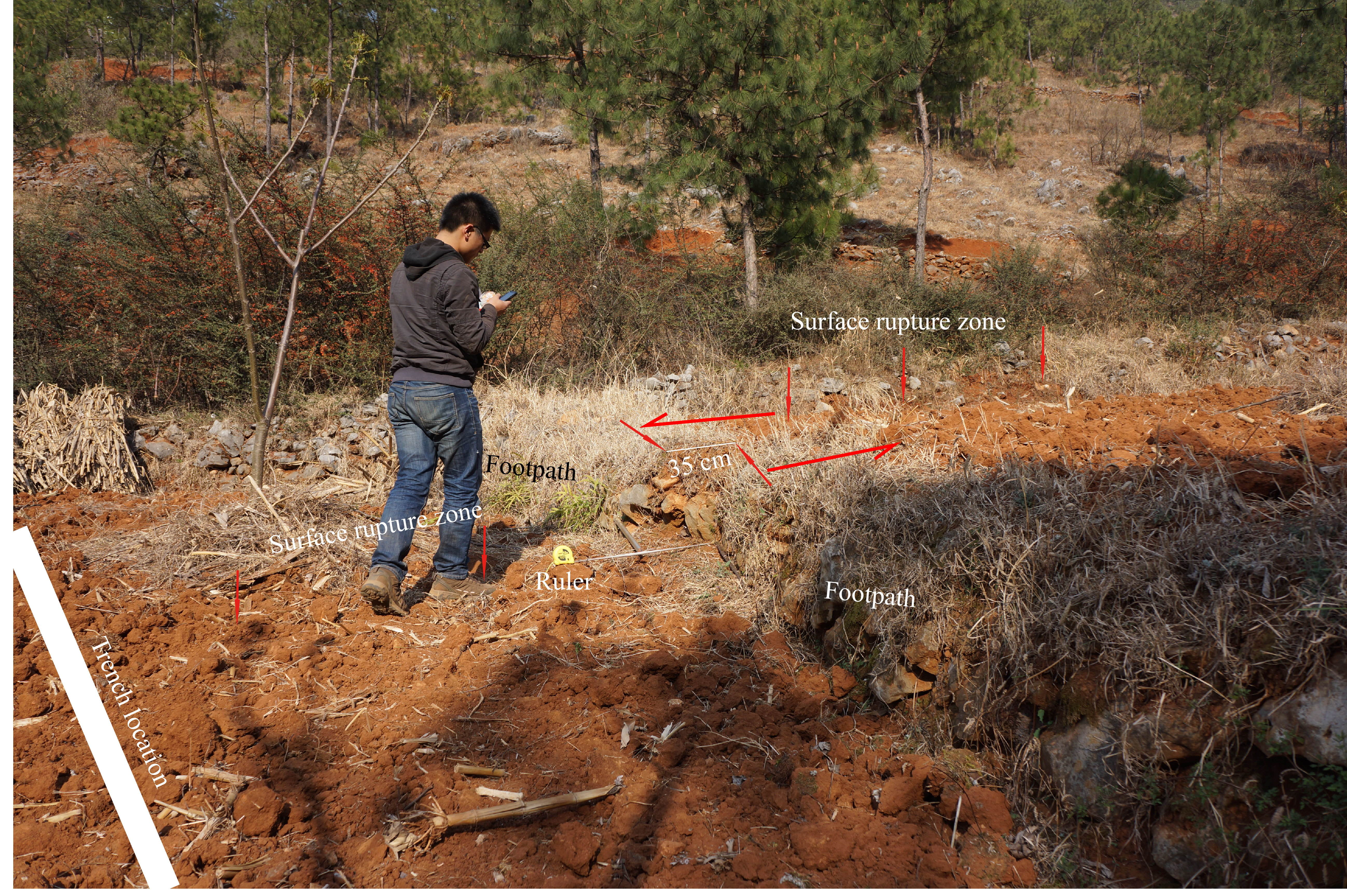 Figure S3. Photograph showing a footpath in the field several meters southeast of the trench was offset ~35 cm in the left-lateral sense. The view is to the east.