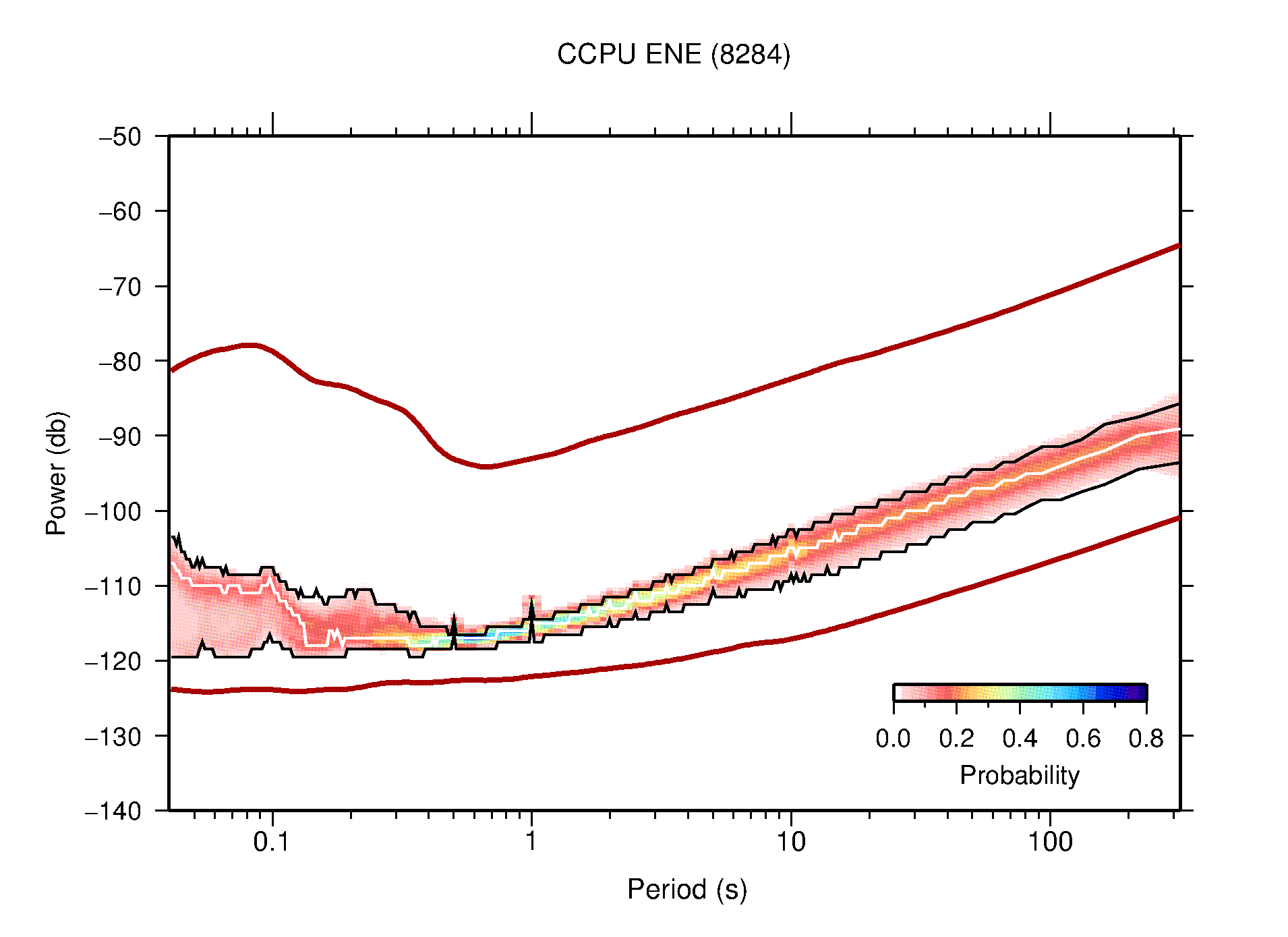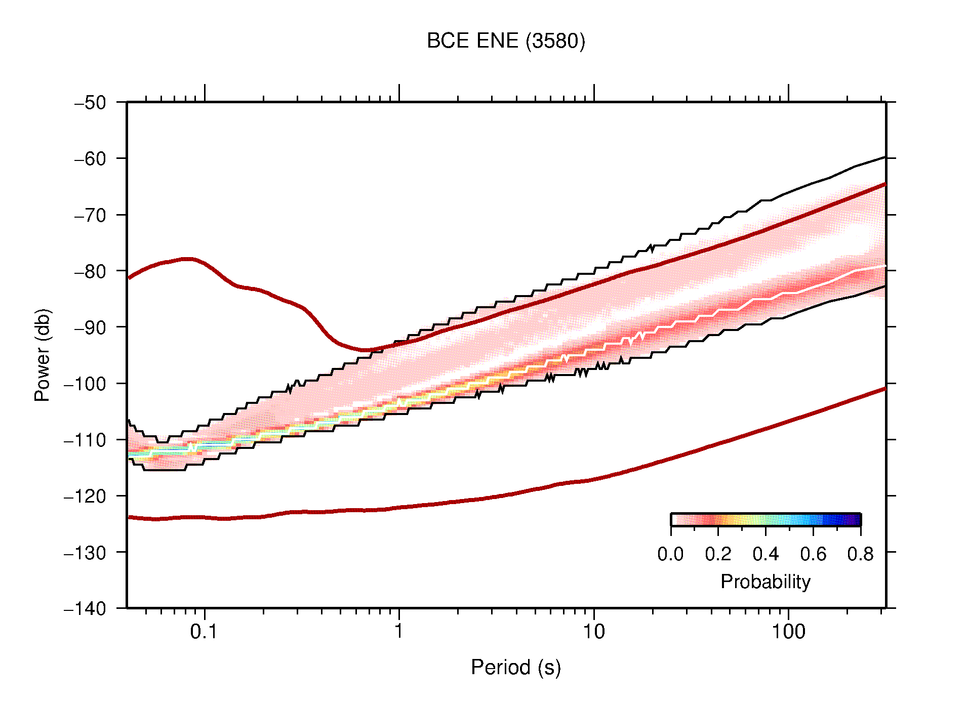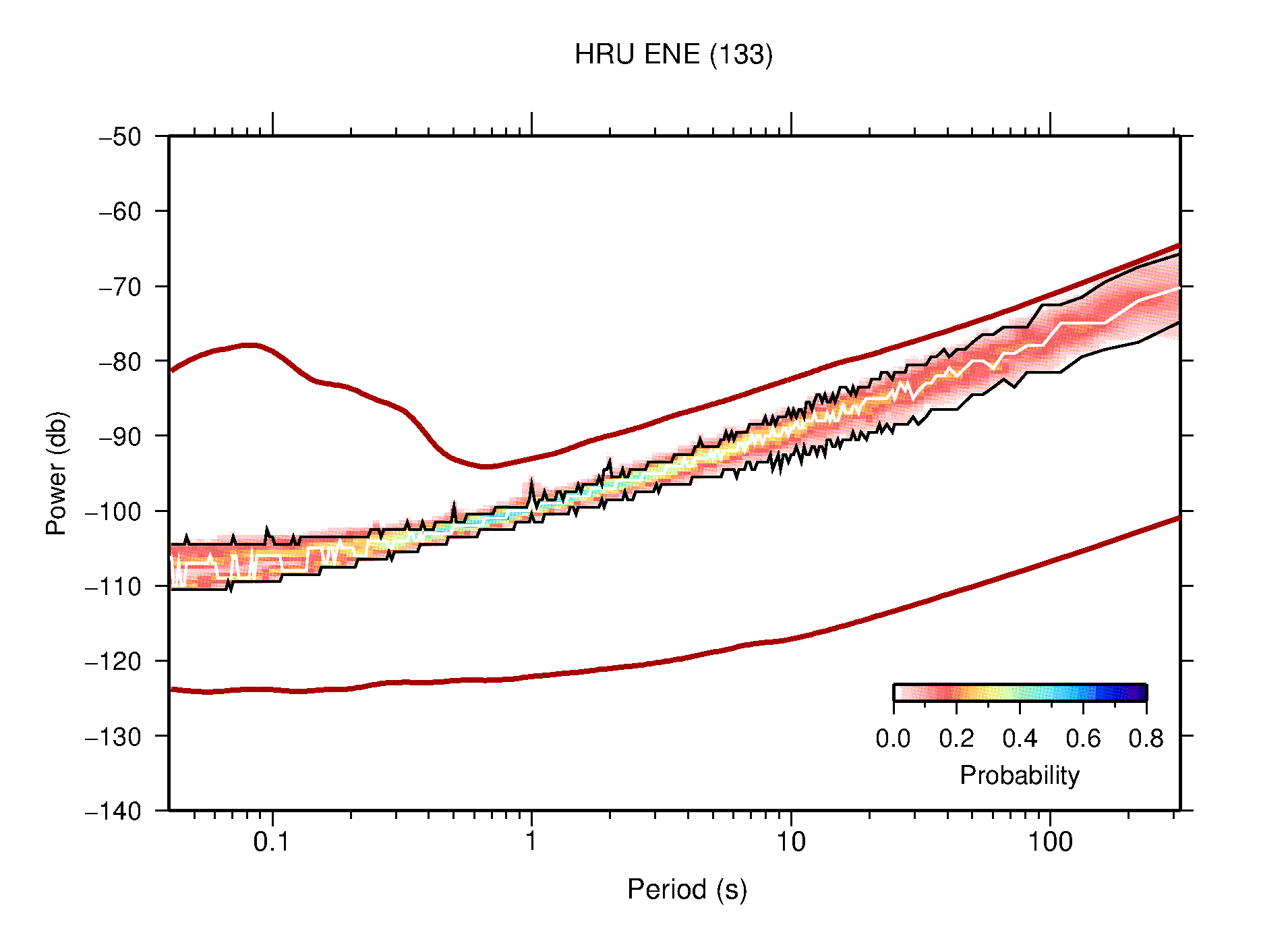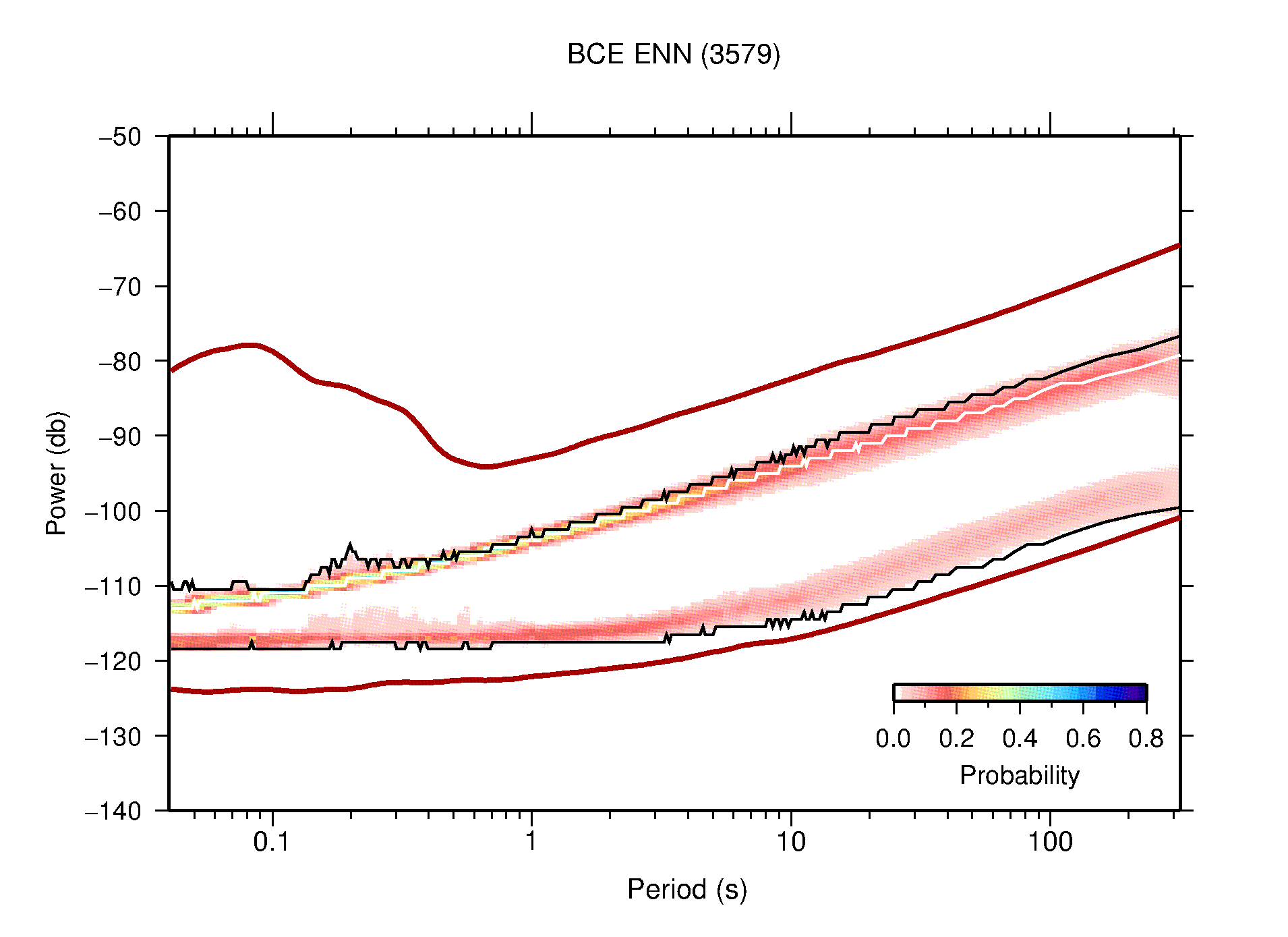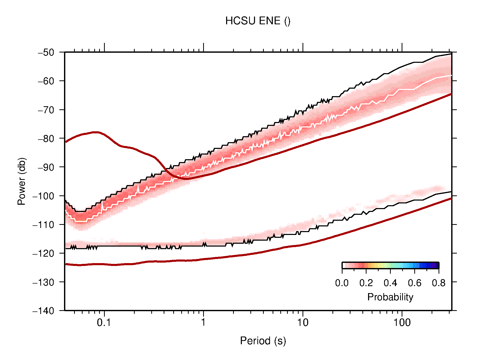 The following figures are full year PDFs for each of the 363 channels processed in this work. The same color scale is used thoughout. The black curves show 0.5 and 99.5 percentiles while the white curve shows the mode. The number of PSDs contributing to the PDF is shown in parentheses next to the station and channel names. The y-axes represent spectral acceleration amplitudes in units of db relative to 1 m/s2 [10log10(m2/s4/Hz)]. The five channels that were not included in the network PDF because of known problems were CCUT ENE,N,Z; HCSU ENE; and HER ENE.