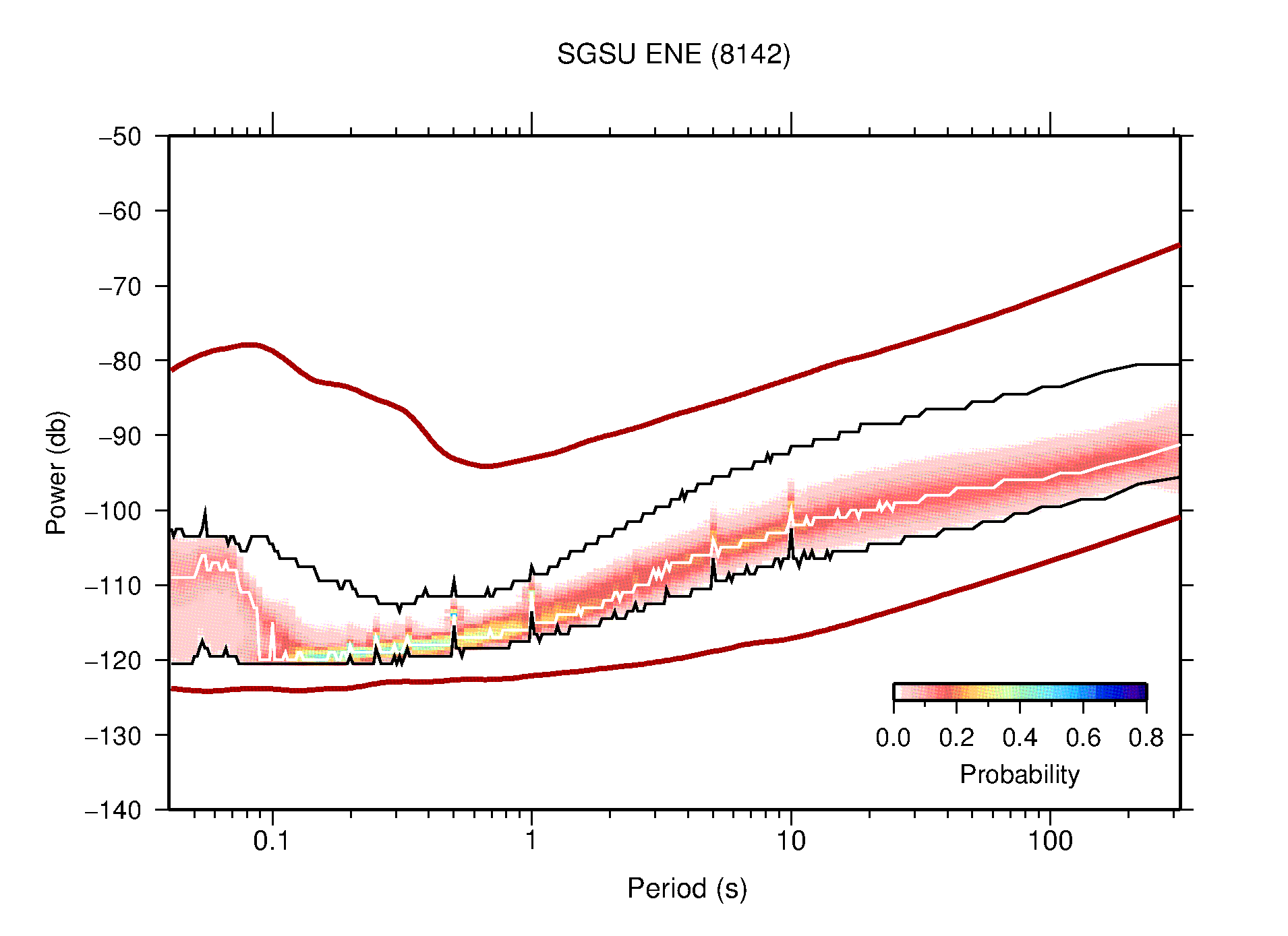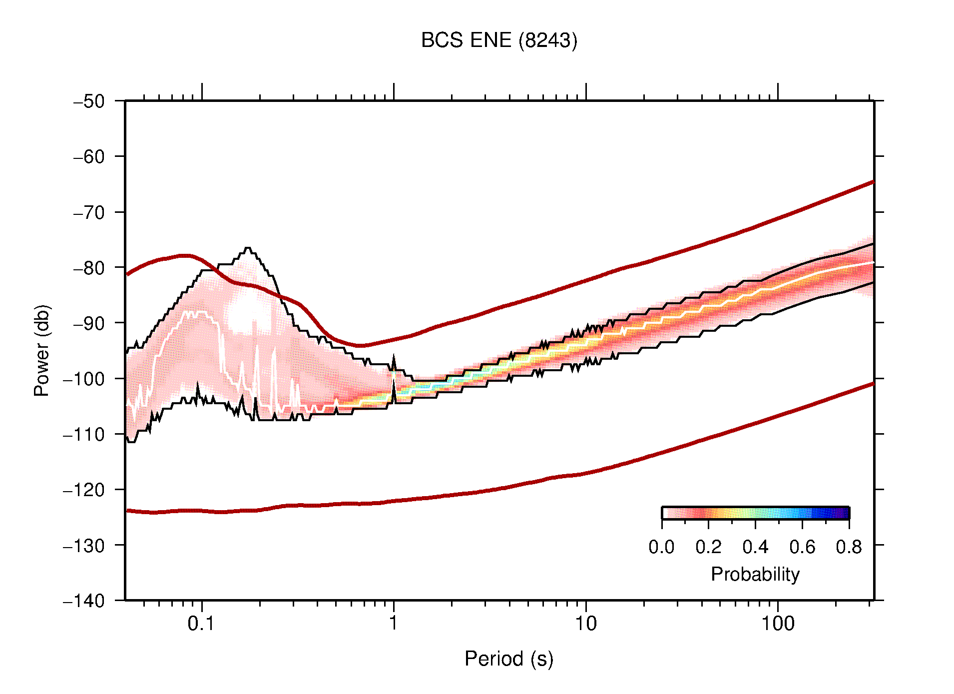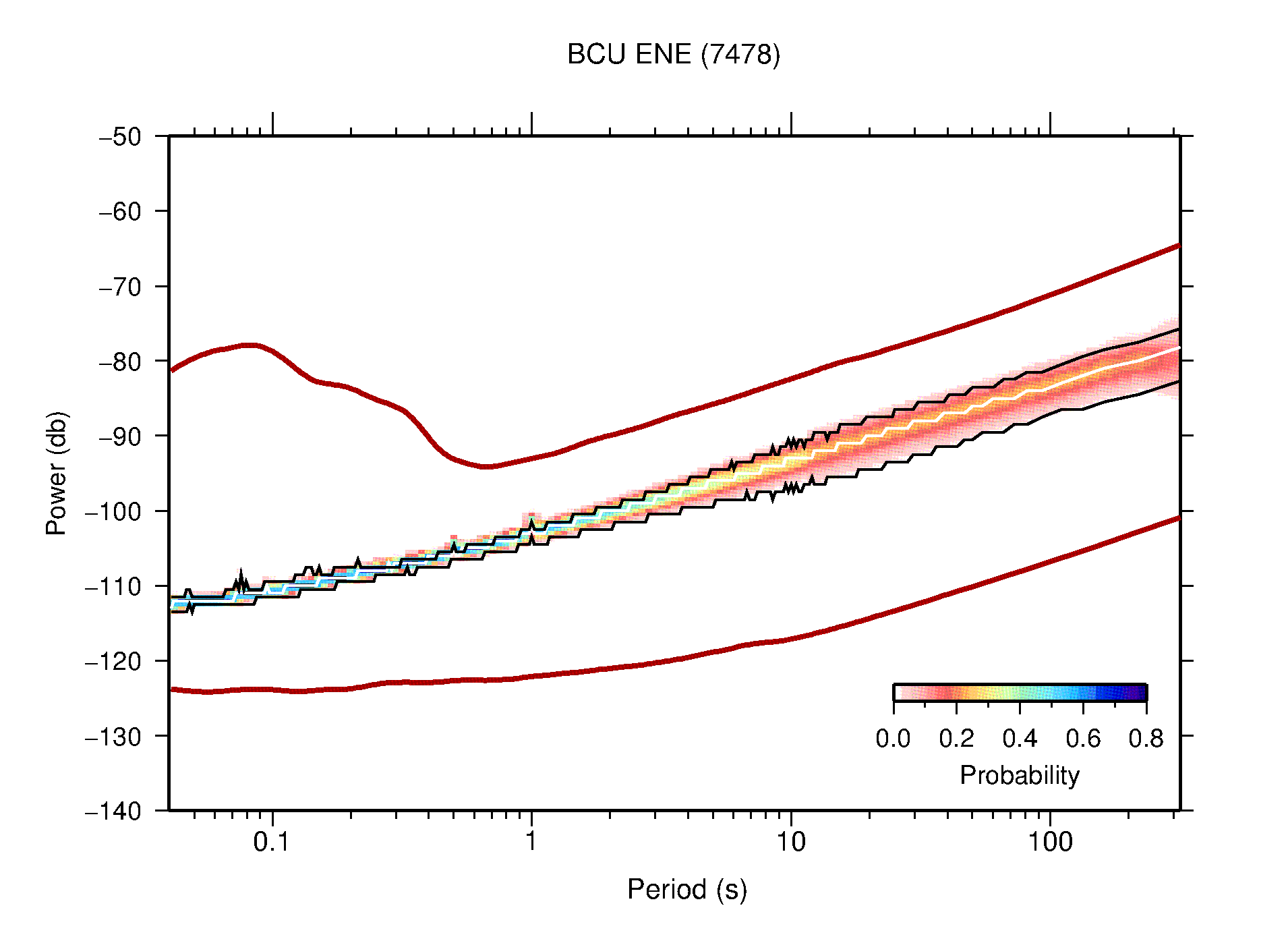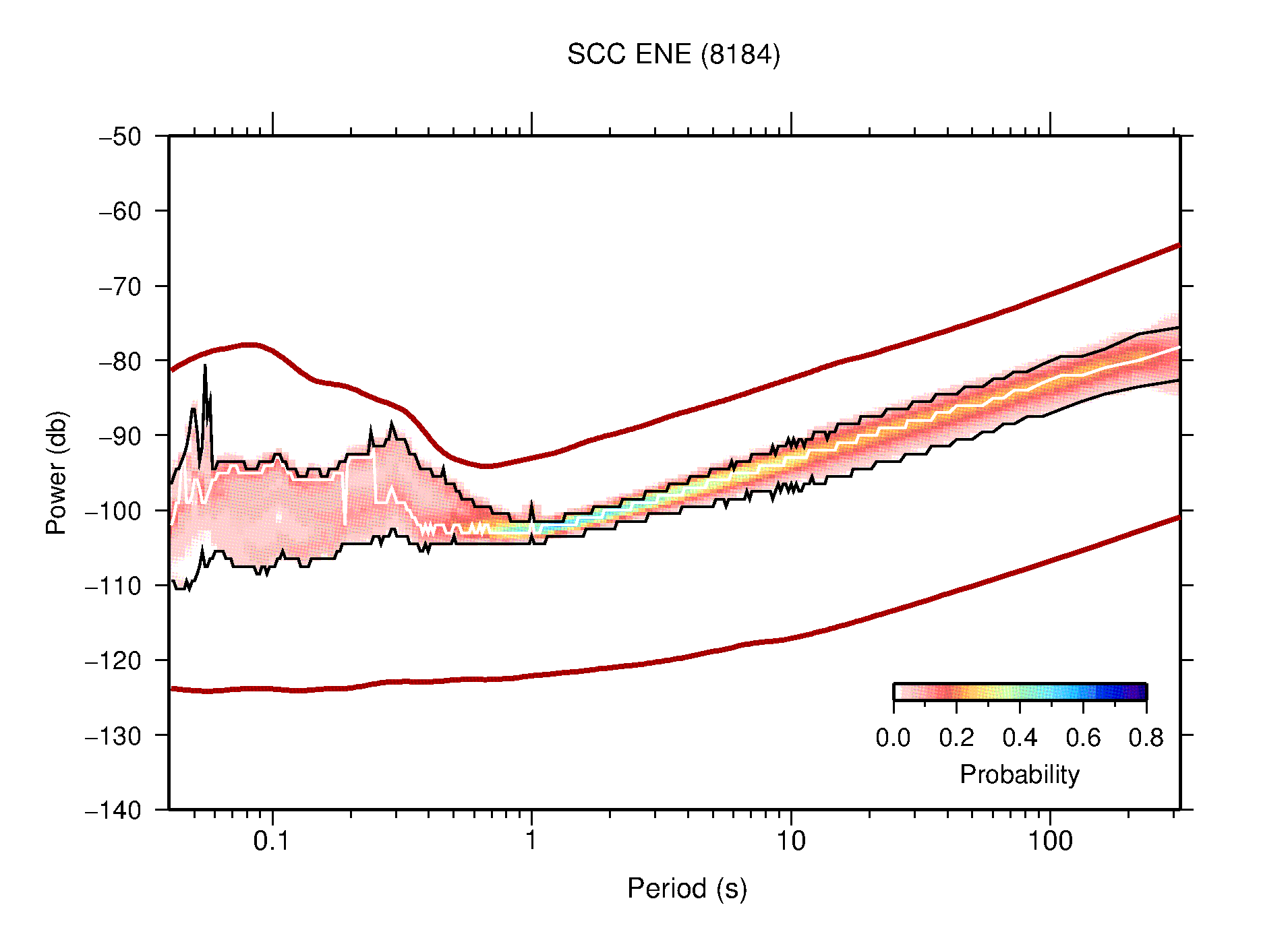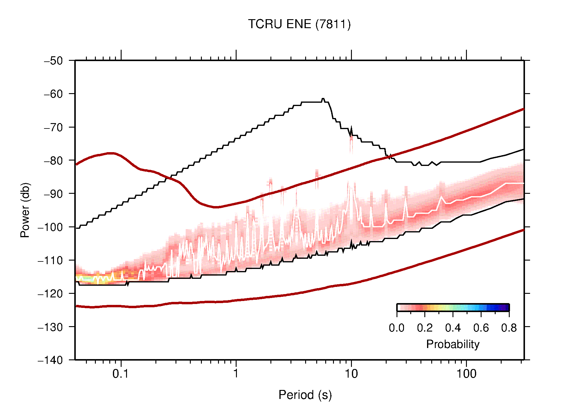 The following figures are full year PDFs for each of the 363 channels processed in this work. The same color scale is used thoughout. The black curves show 0.5 and 99.5 percentiles while the white curve shows the mode. The number of PSDs contributing to the PDF is shown in parentheses next to the station and channel names. The y-axes represent spectral acceleration amplitudes in units of db relative to 1 m/s2 [10log10(m2/s4/Hz)]. The five channels that were not included in the network PDF because of known problems were CCUT ENE,N,Z; HCSU ENE; and HER ENE.