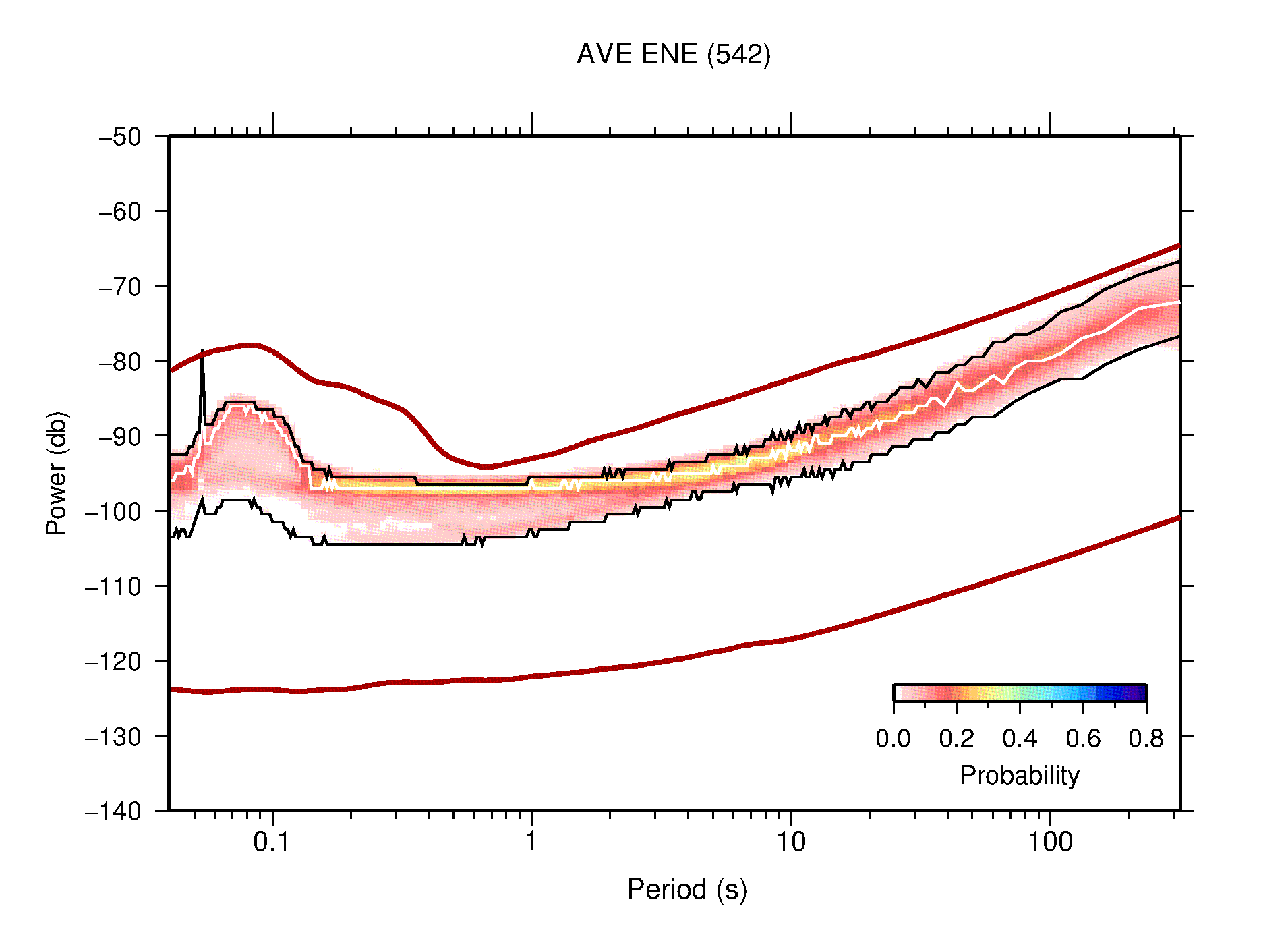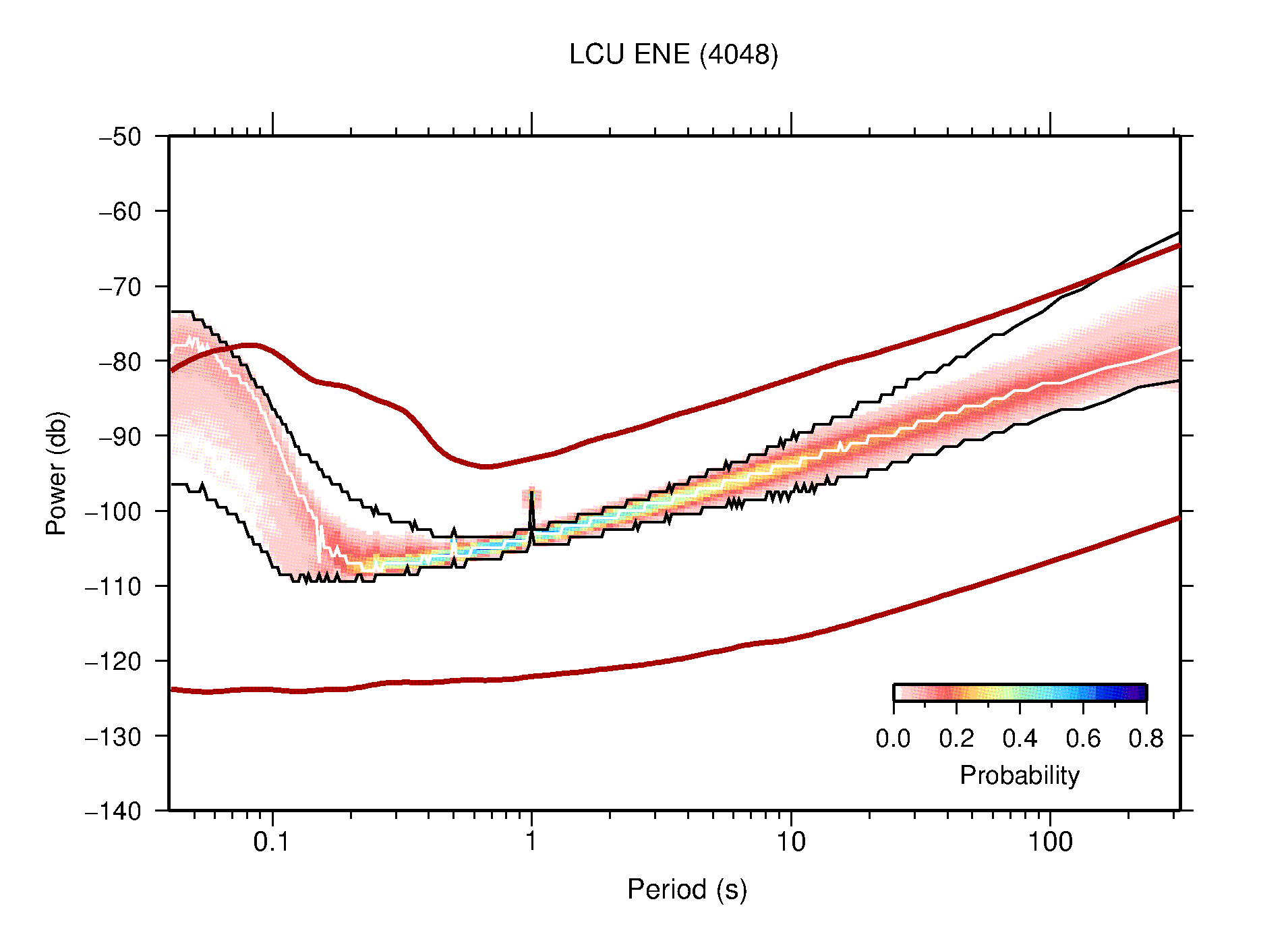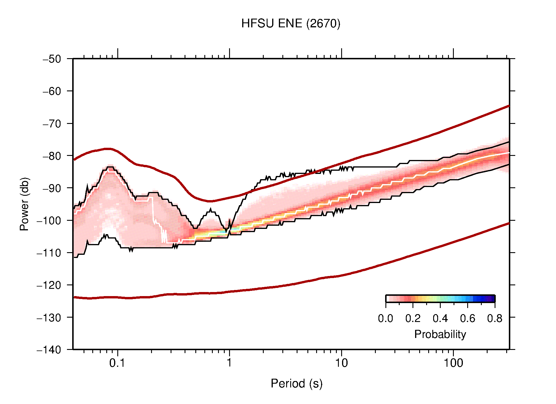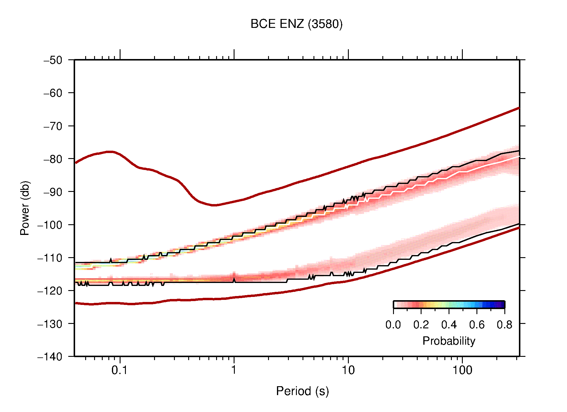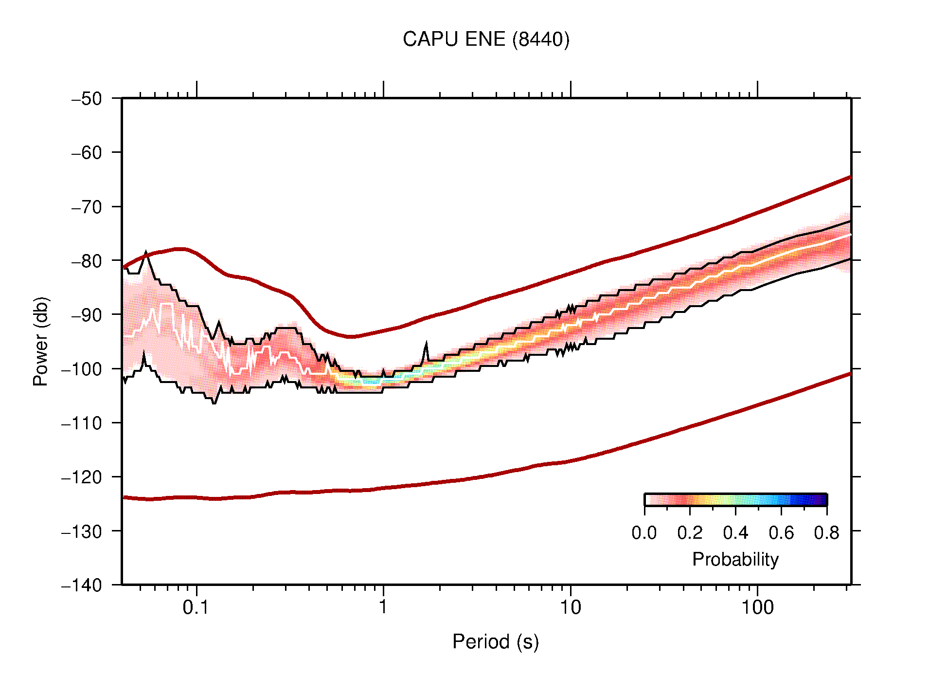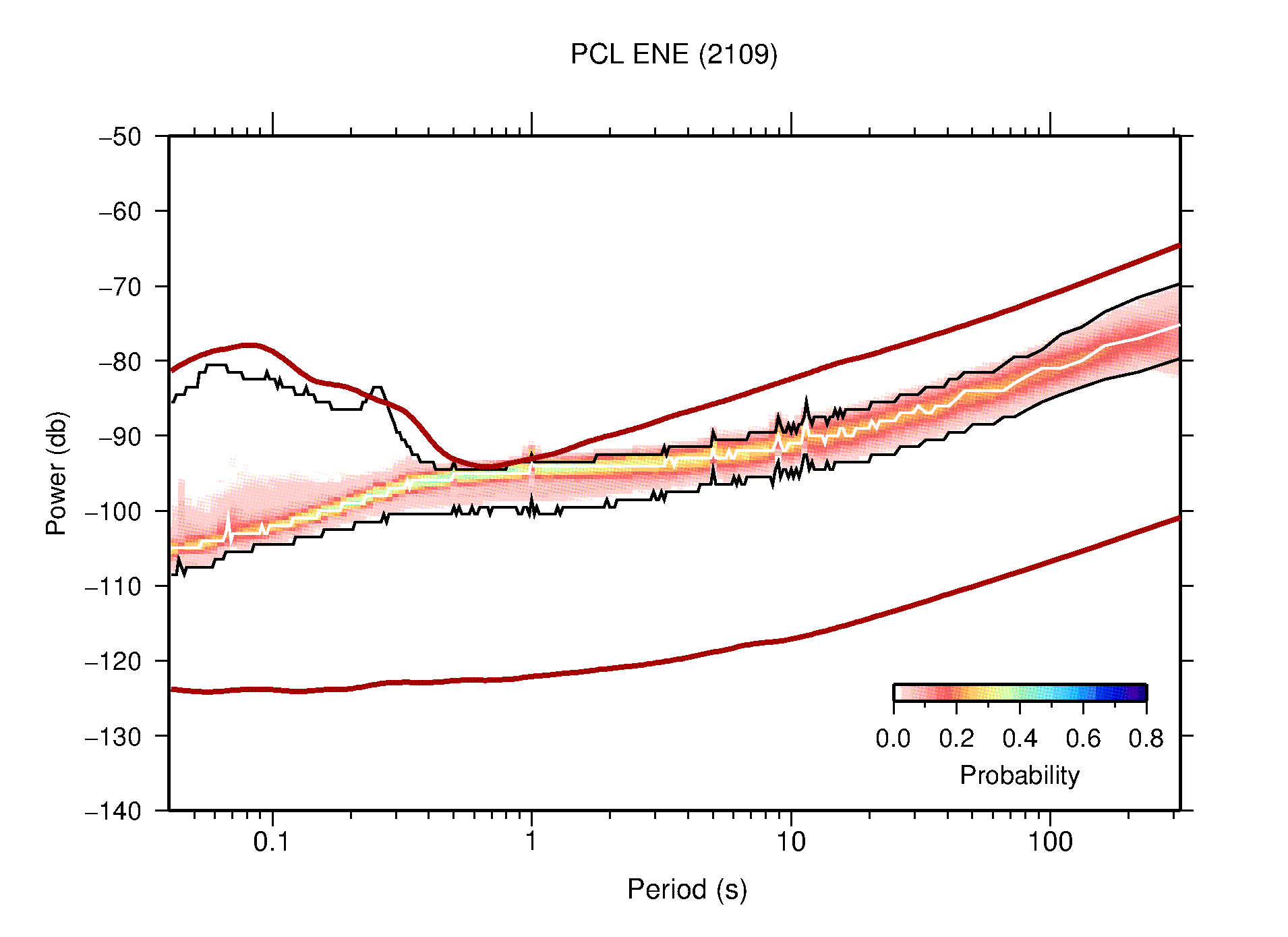 The following figures are full year PDFs for each of the 363 channels processed in this work. The same color scale is used thoughout. The black curves show 0.5 and 99.5 percentiles while the white curve shows the mode. The number of PSDs contributing to the PDF is shown in parentheses next to the station and channel names. The y-axes represent spectral acceleration amplitudes in units of db relative to 1 m/s2 [10log10(m2/s4/Hz)]. The five channels that were not included in the network PDF because of known problems were CCUT ENE,N,Z; HCSU ENE; and HER ENE.
