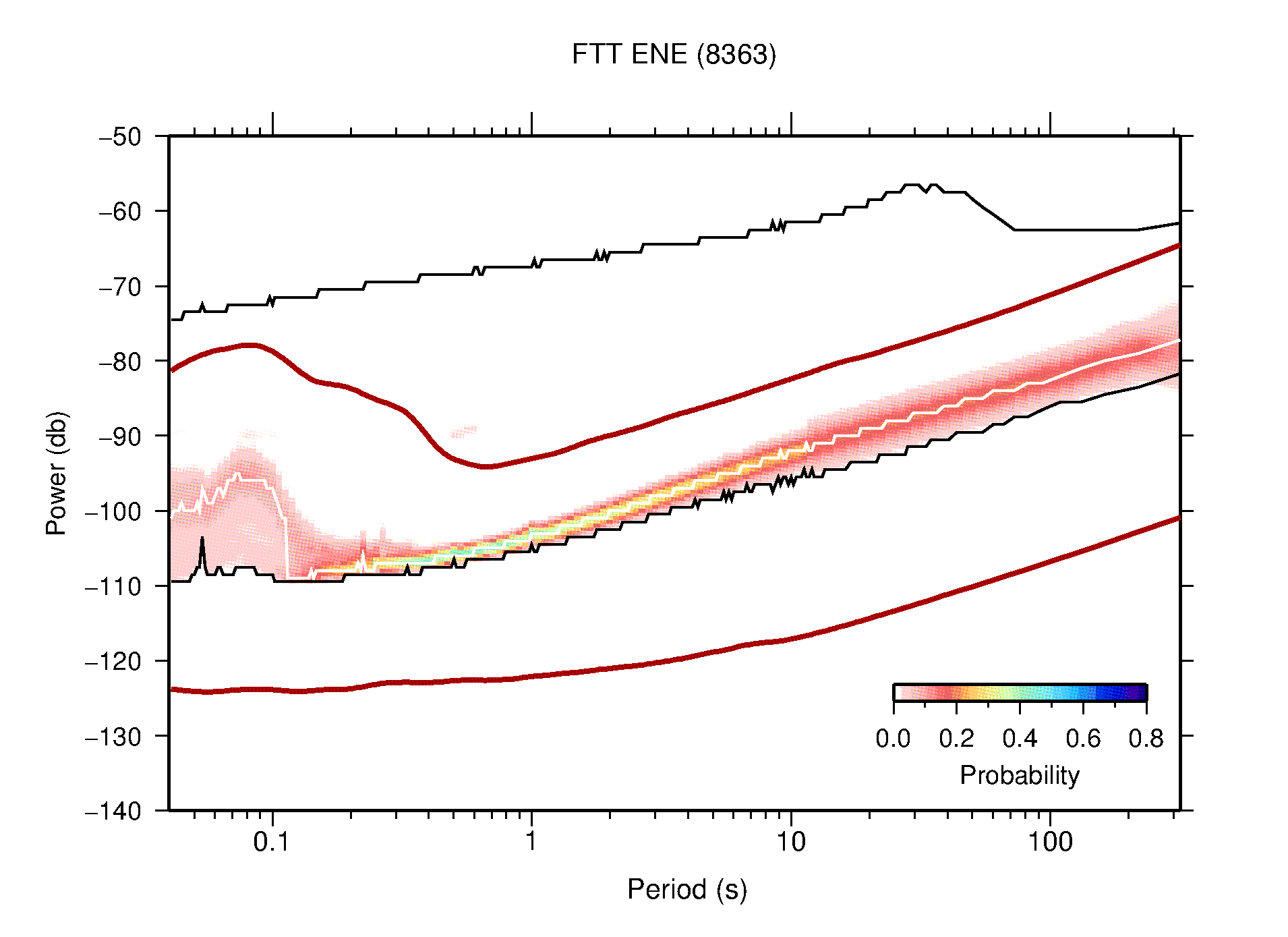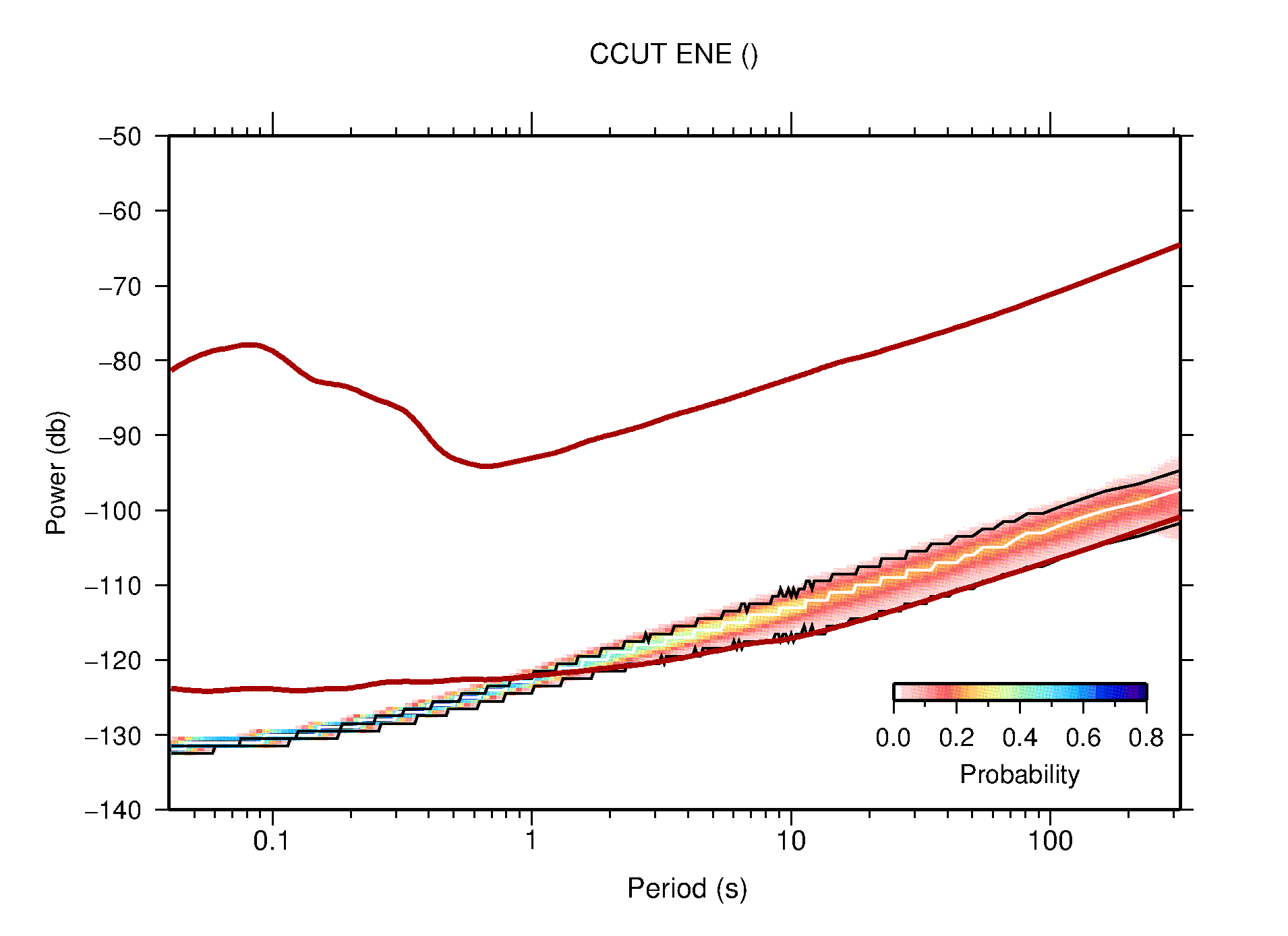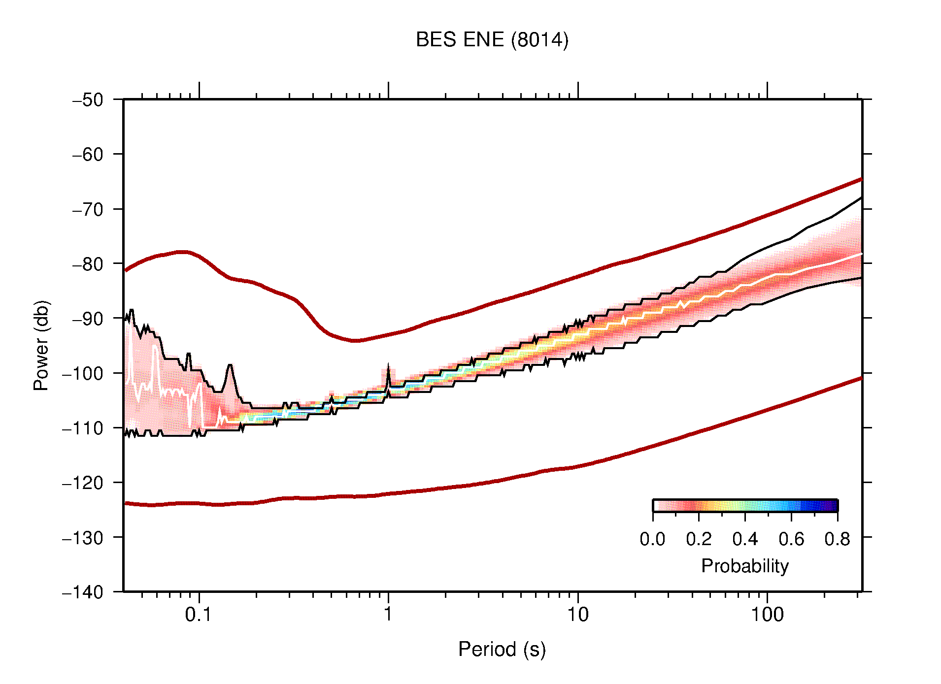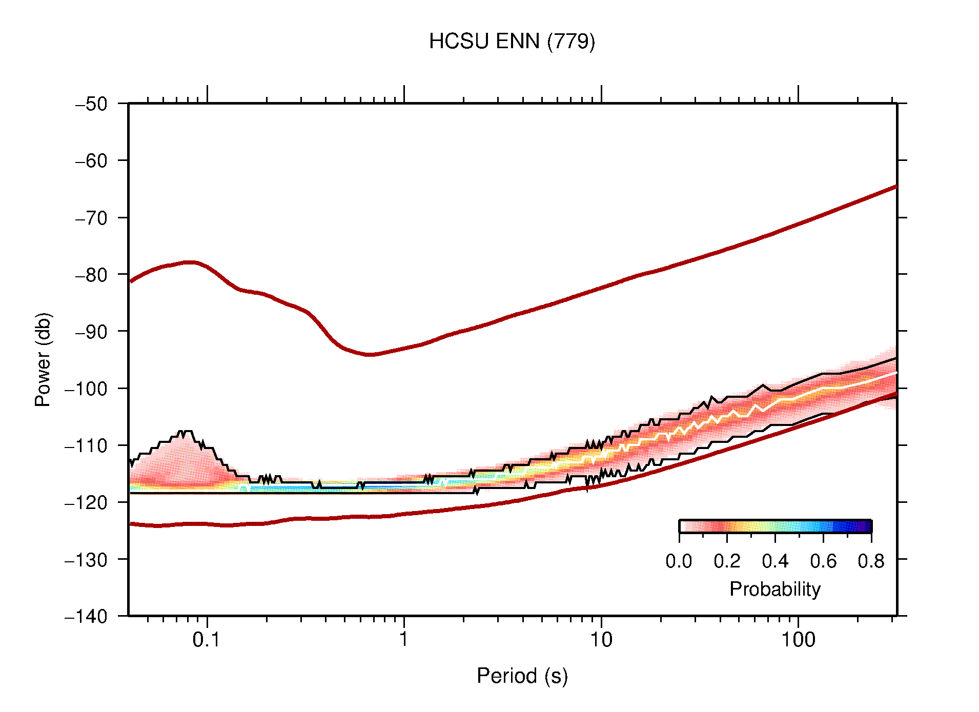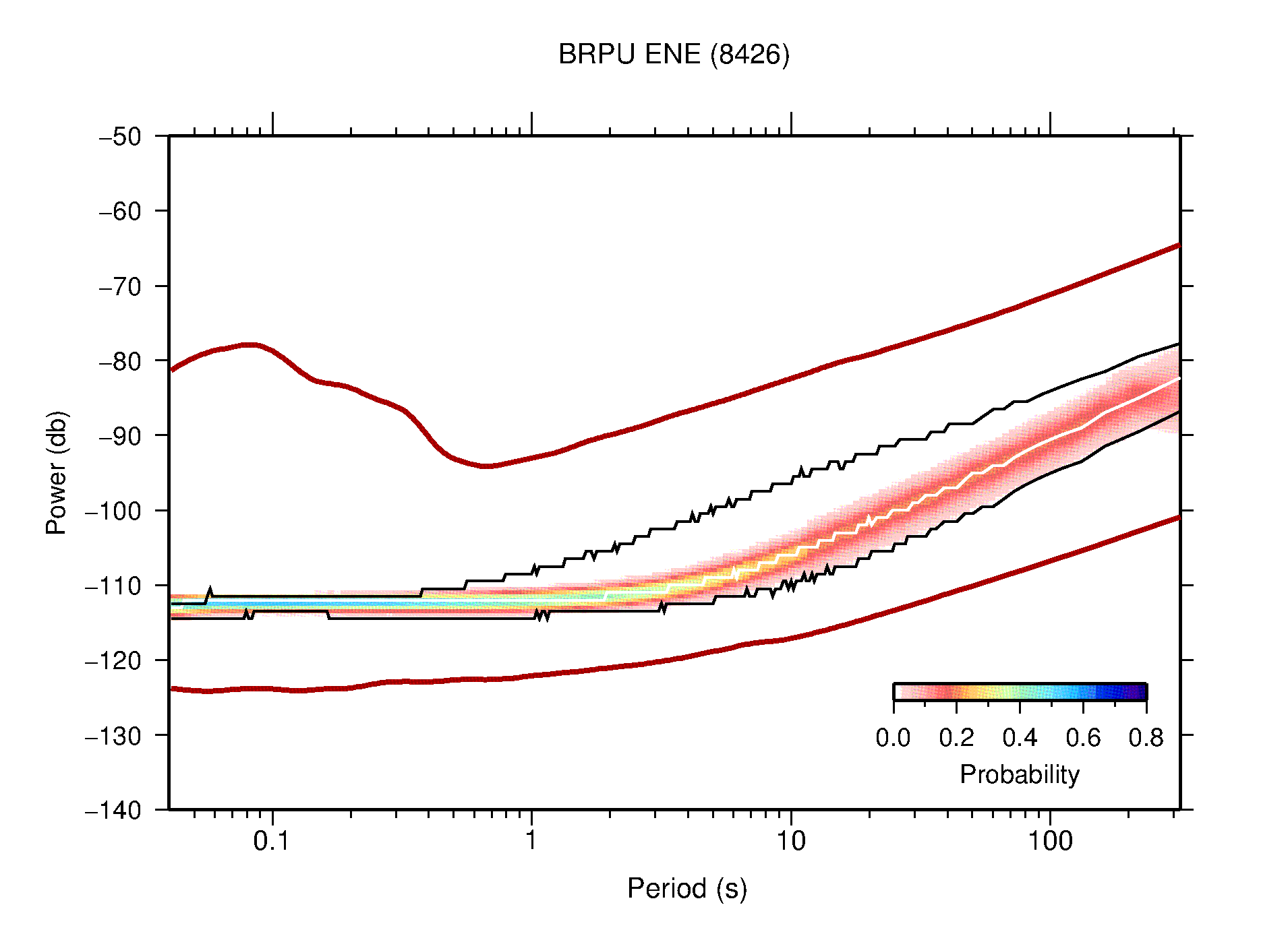 The following figures are full year PDFs for each of the 363 channels processed in this work. The same color scale is used thoughout. The black curves show 0.5 and 99.5 percentiles while the white curve shows the mode. The number of PSDs contributing to the PDF is shown in parentheses next to the station and channel names. The y-axes represent spectral acceleration amplitudes in units of db relative to 1 m/s2 [10log10(m2/s4/Hz)]. The five channels that were not included in the network PDF because of known problems were CCUT ENE,N,Z; HCSU ENE; and HER ENE.