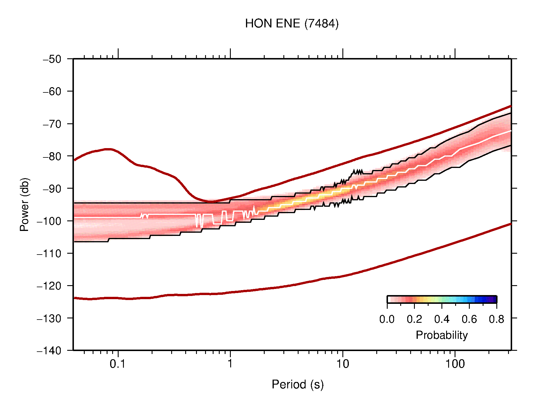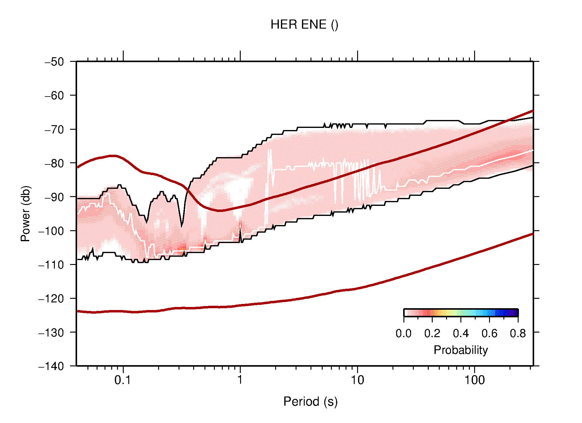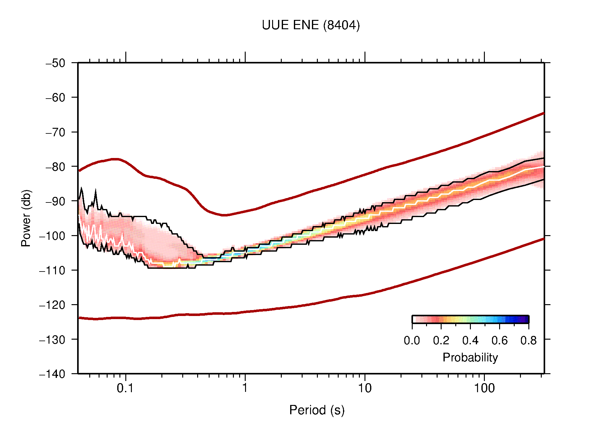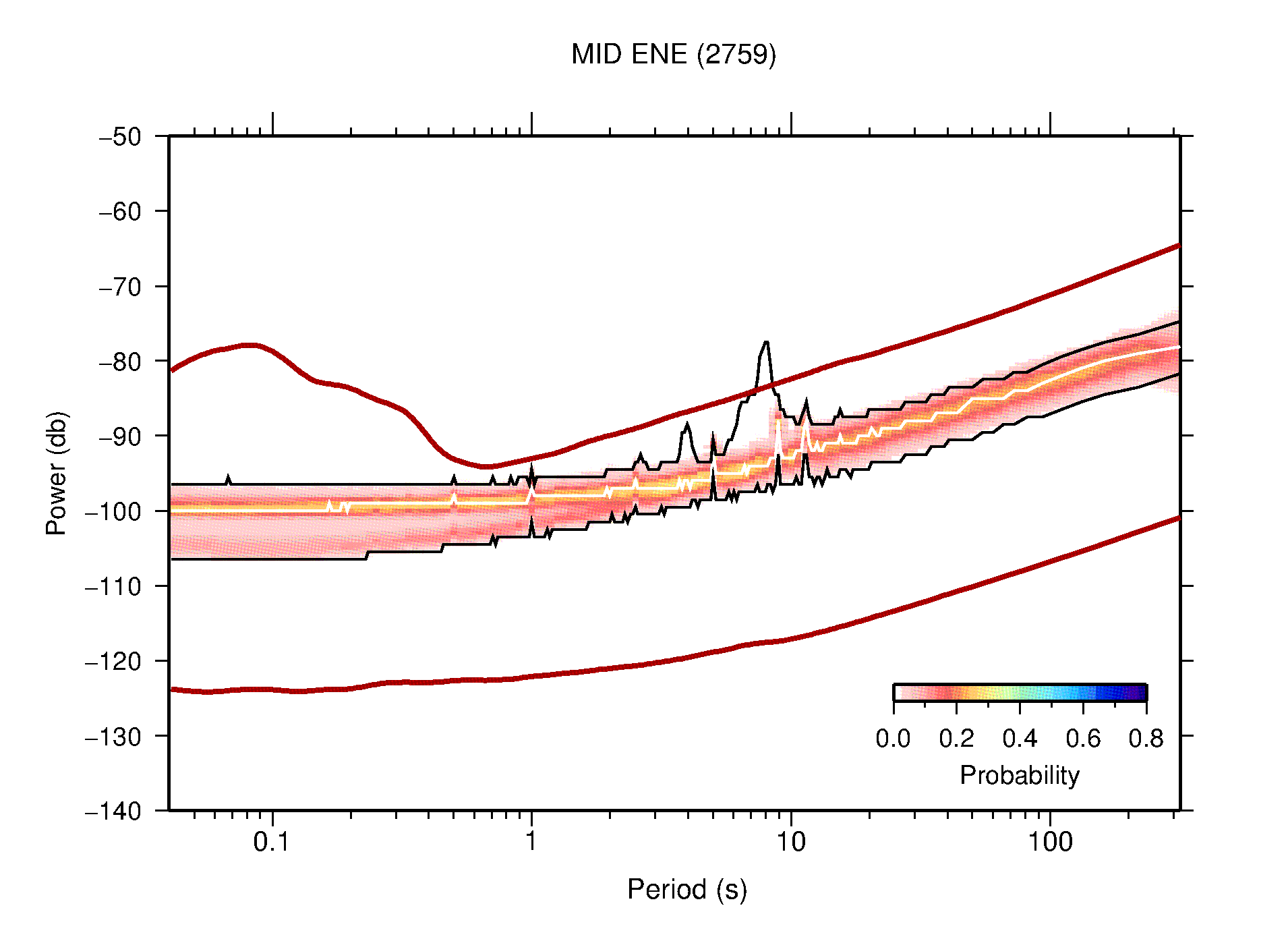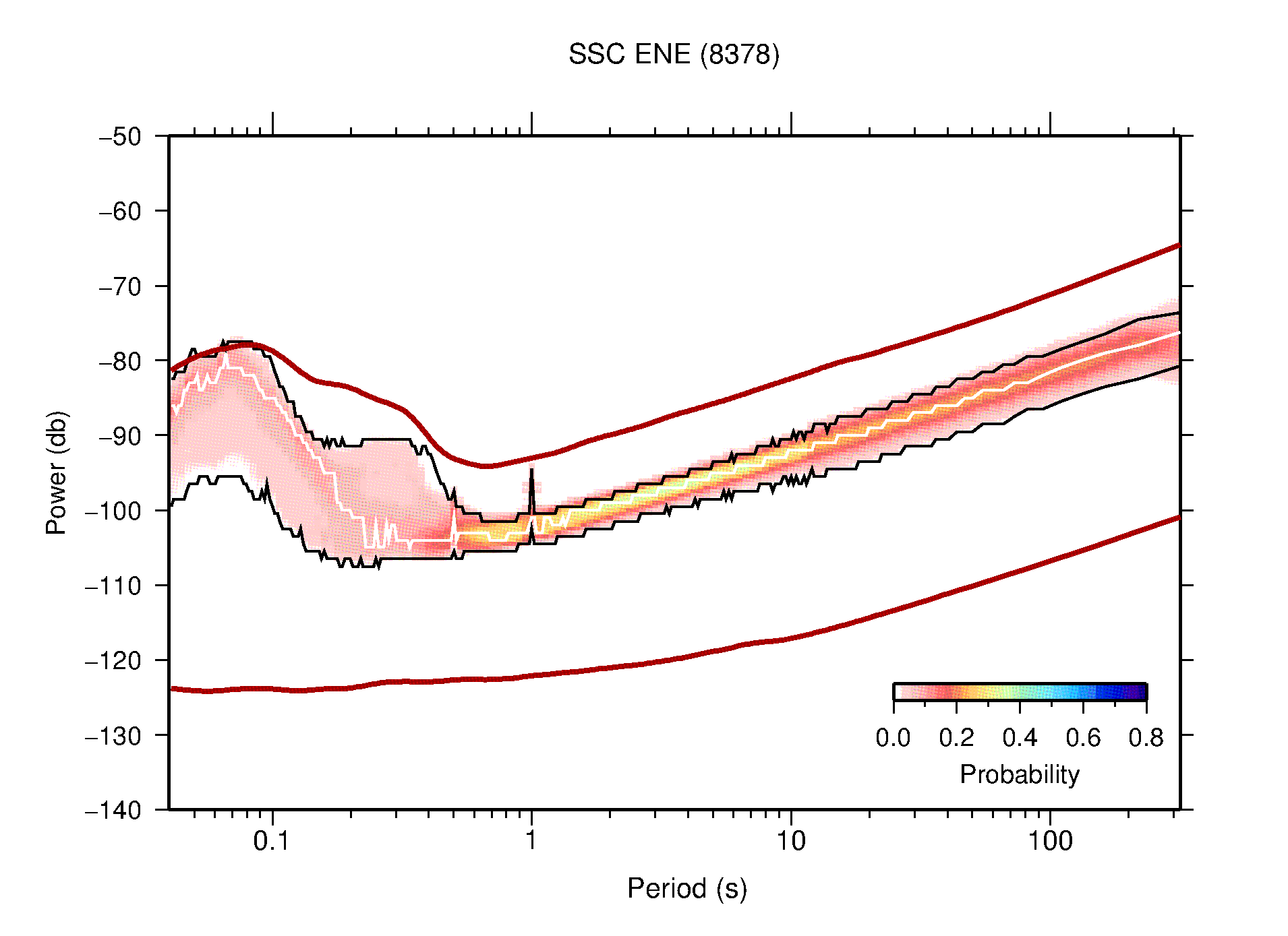 The following figures are full year PDFs for each of the 363 channels processed in this work. The same color scale is used thoughout. The black curves show 0.5 and 99.5 percentiles while the white curve shows the mode. The number of PSDs contributing to the PDF is shown in parentheses next to the station and channel names. The y-axes represent spectral acceleration amplitudes in units of db relative to 1 m/s2 [10log10(m2/s4/Hz)]. The five channels that were not included in the network PDF because of known problems were CCUT ENE,N,Z; HCSU ENE; and HER ENE.
