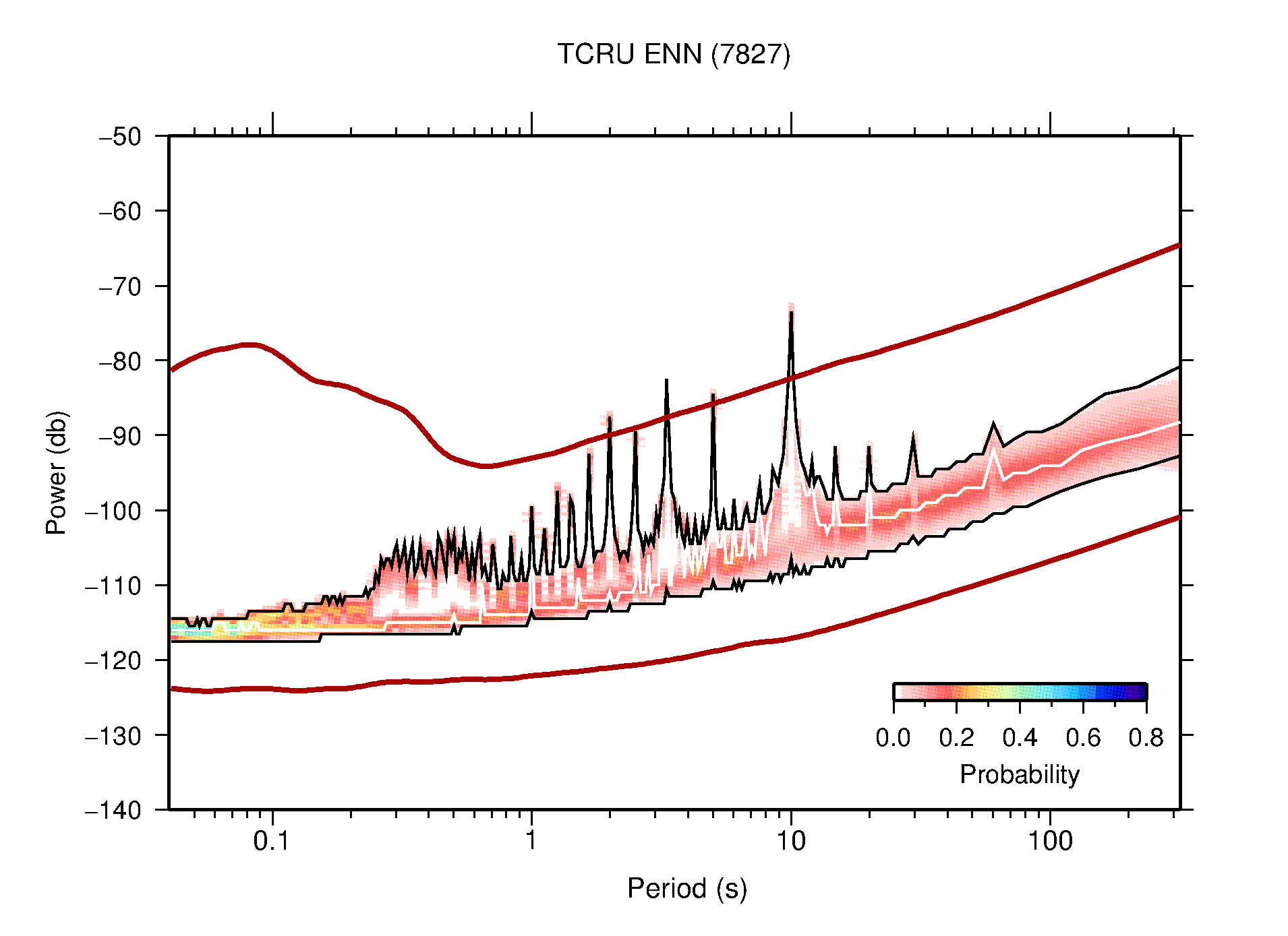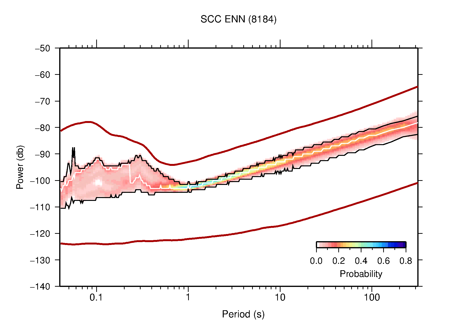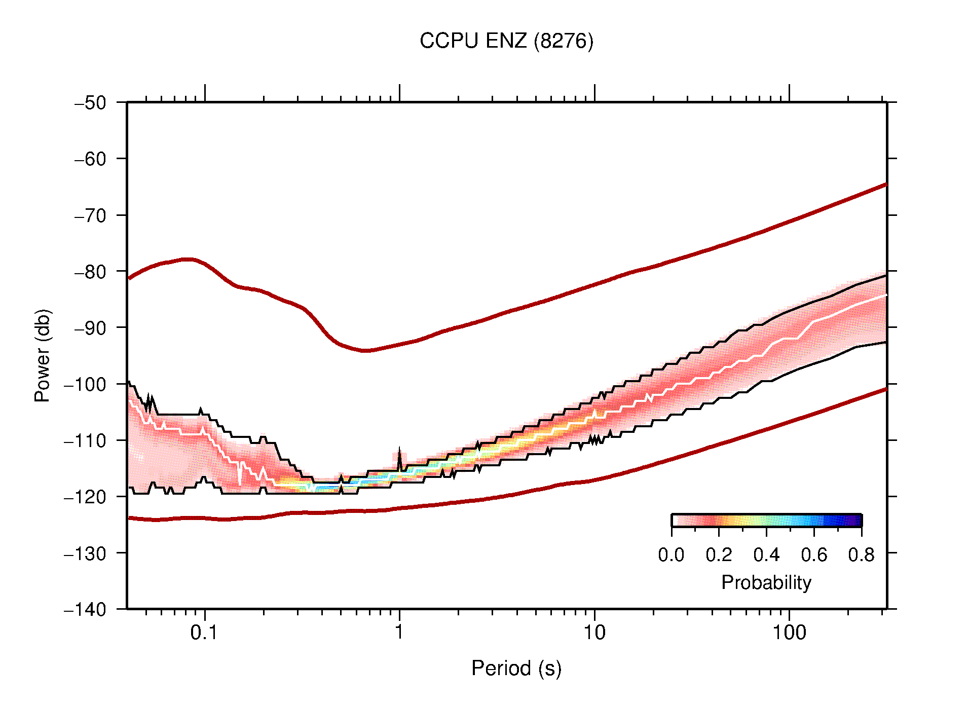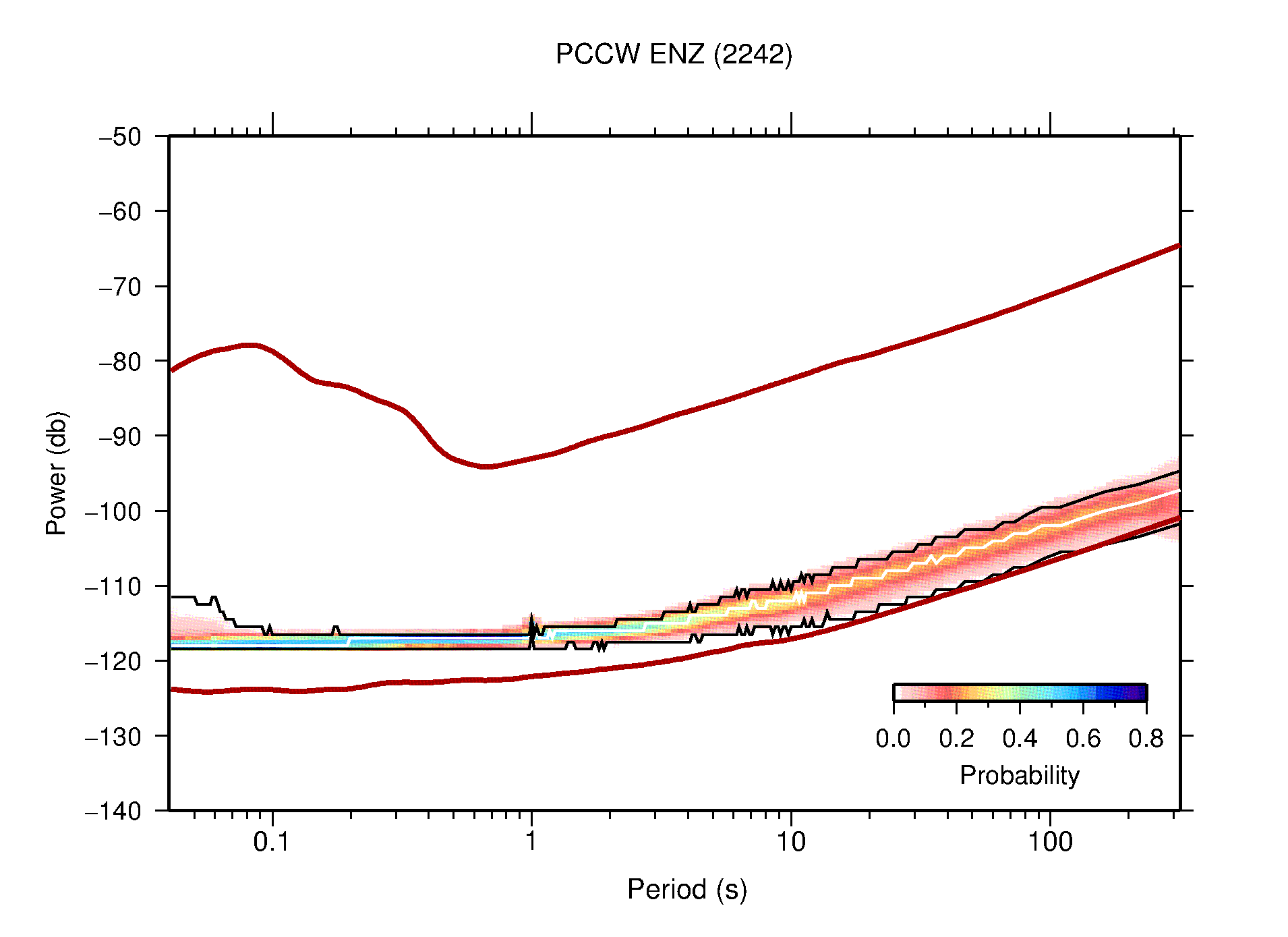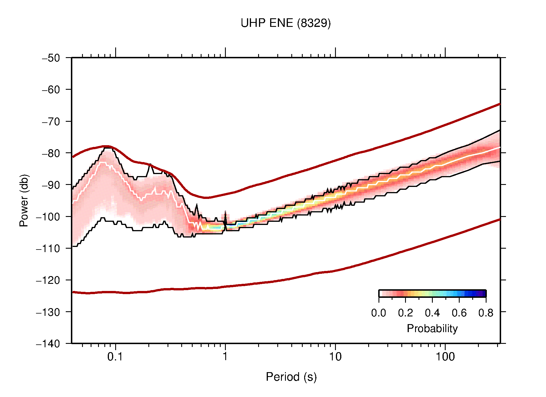 The following figures are full year PDFs for each of the 363 channels processed in this work. The same color scale is used thoughout. The black curves show 0.5 and 99.5 percentiles while the white curve shows the mode. The number of PSDs contributing to the PDF is shown in parentheses next to the station and channel names. The y-axes represent spectral acceleration amplitudes in units of db relative to 1 m/s2 [10log10(m2/s4/Hz)]. The five channels that were not included in the network PDF because of known problems were CCUT ENE,N,Z; HCSU ENE; and HER ENE.