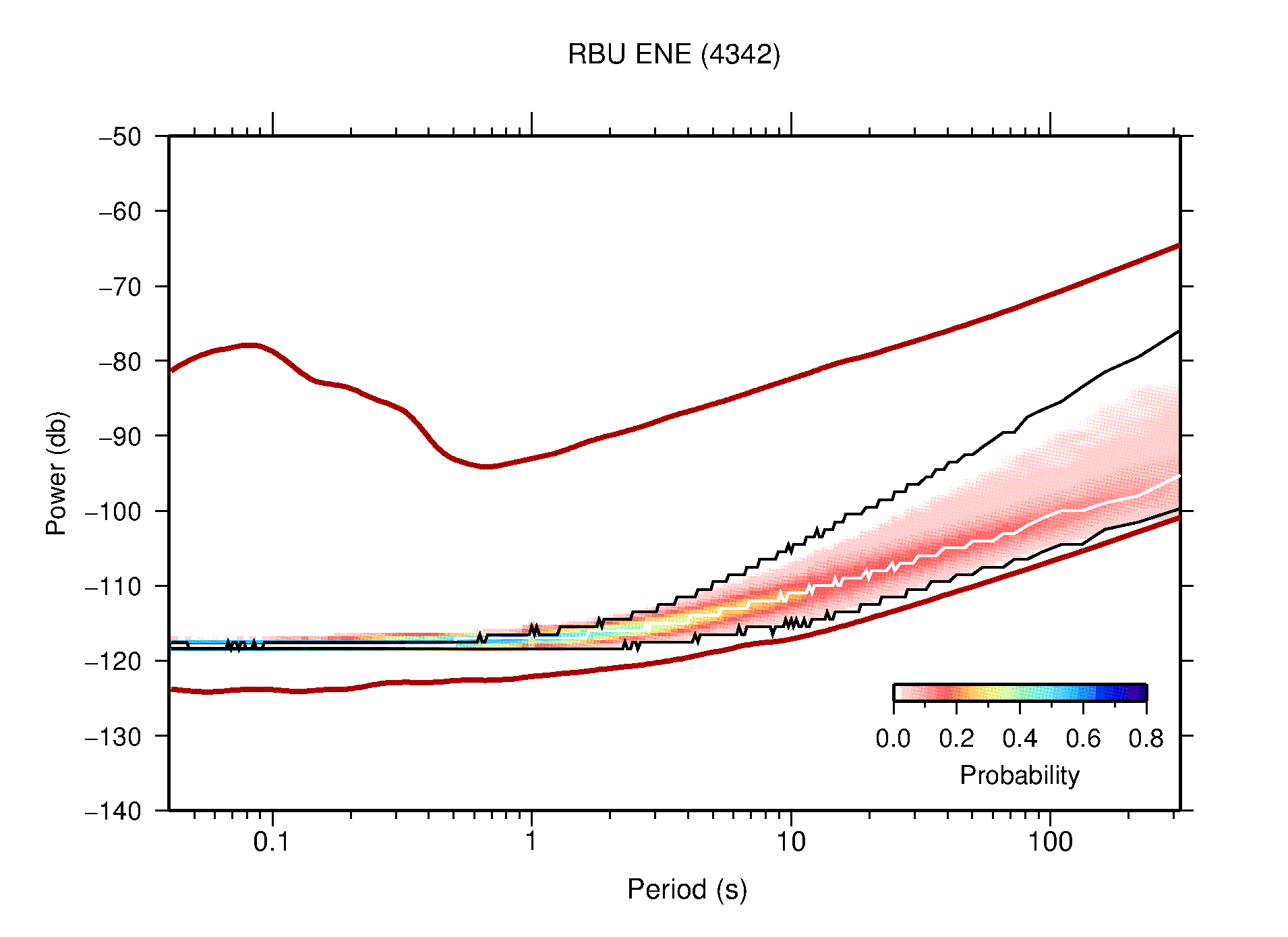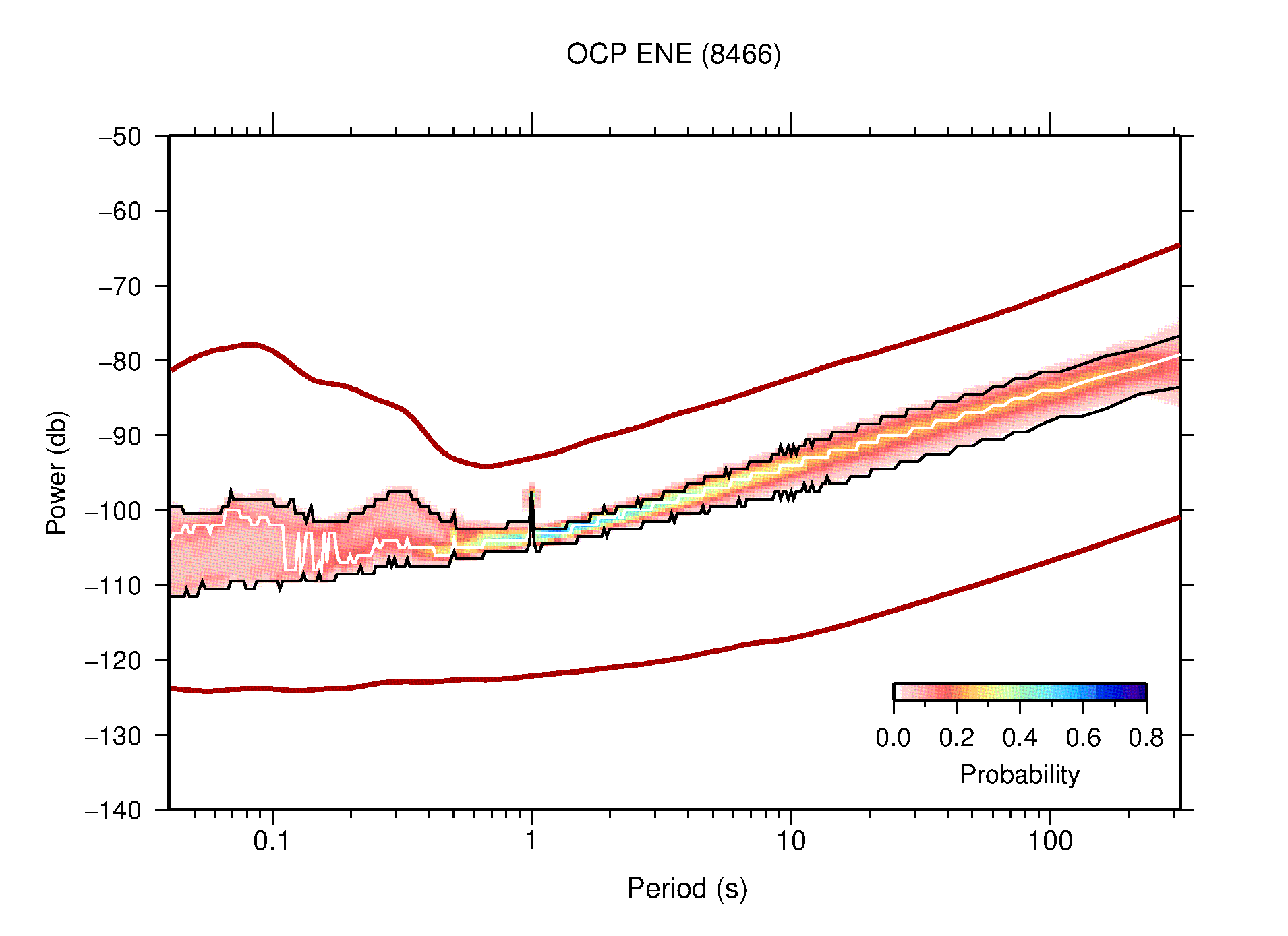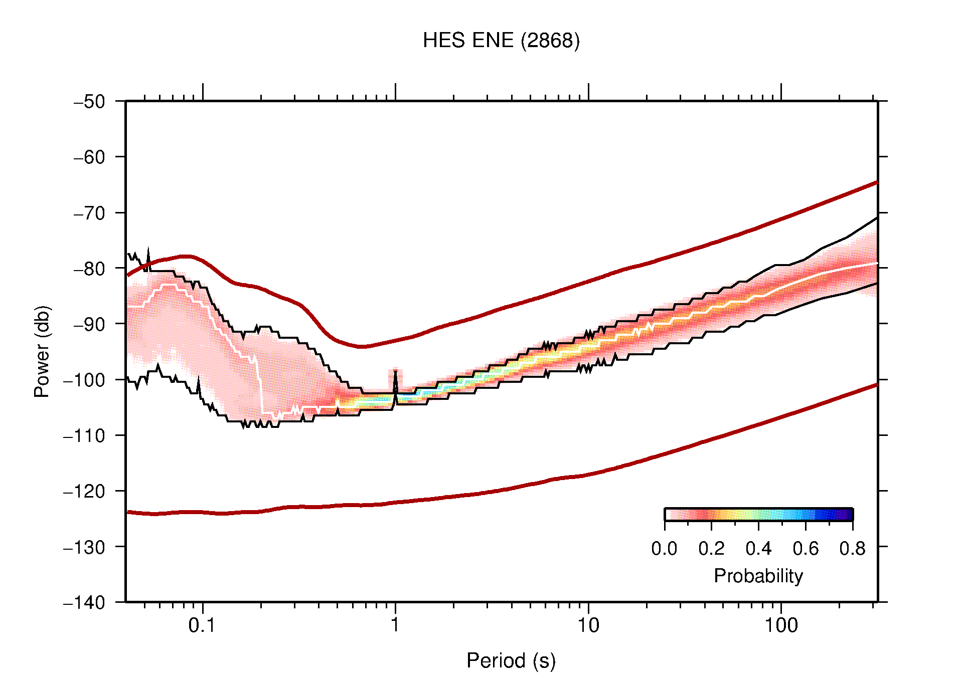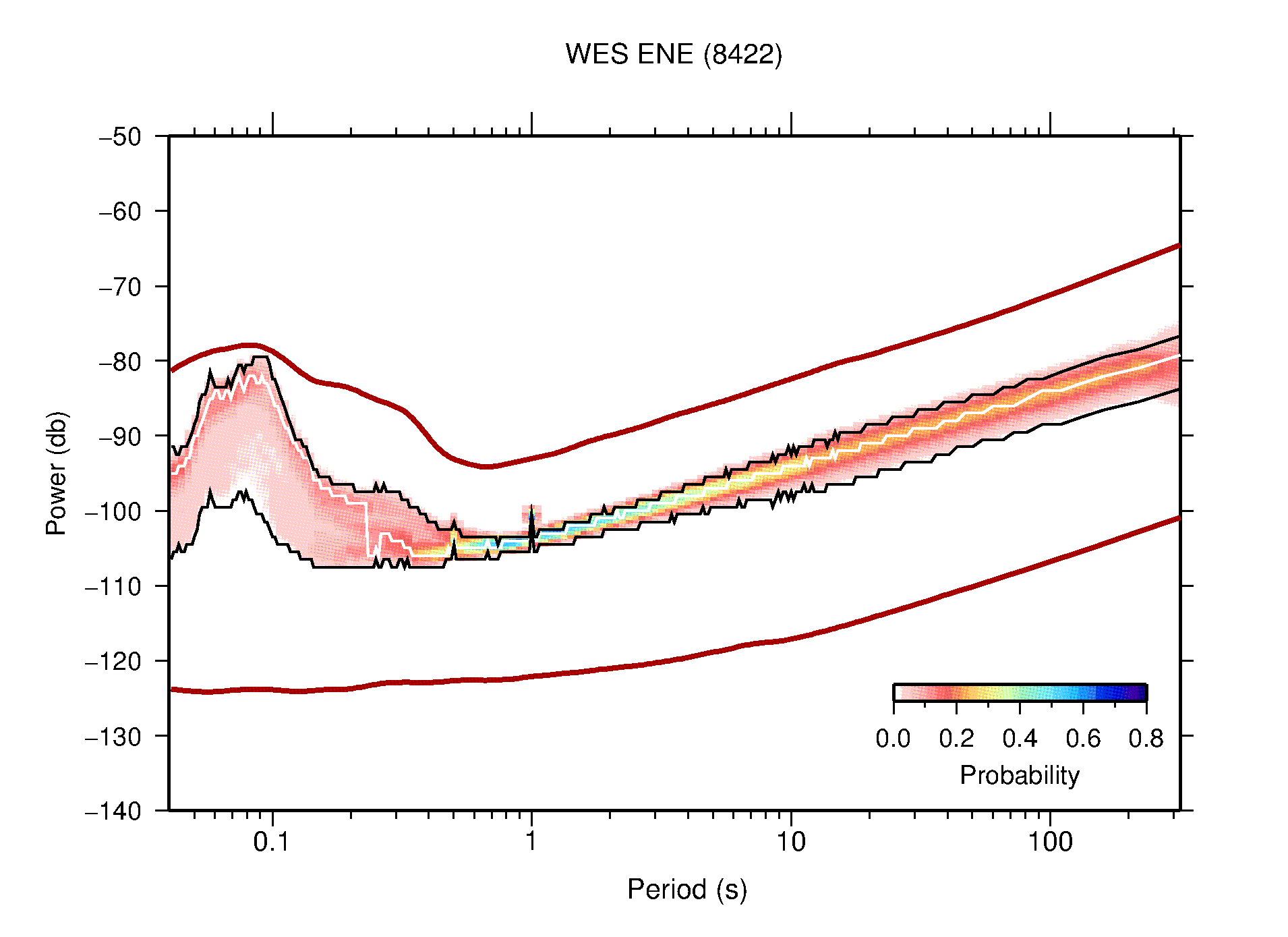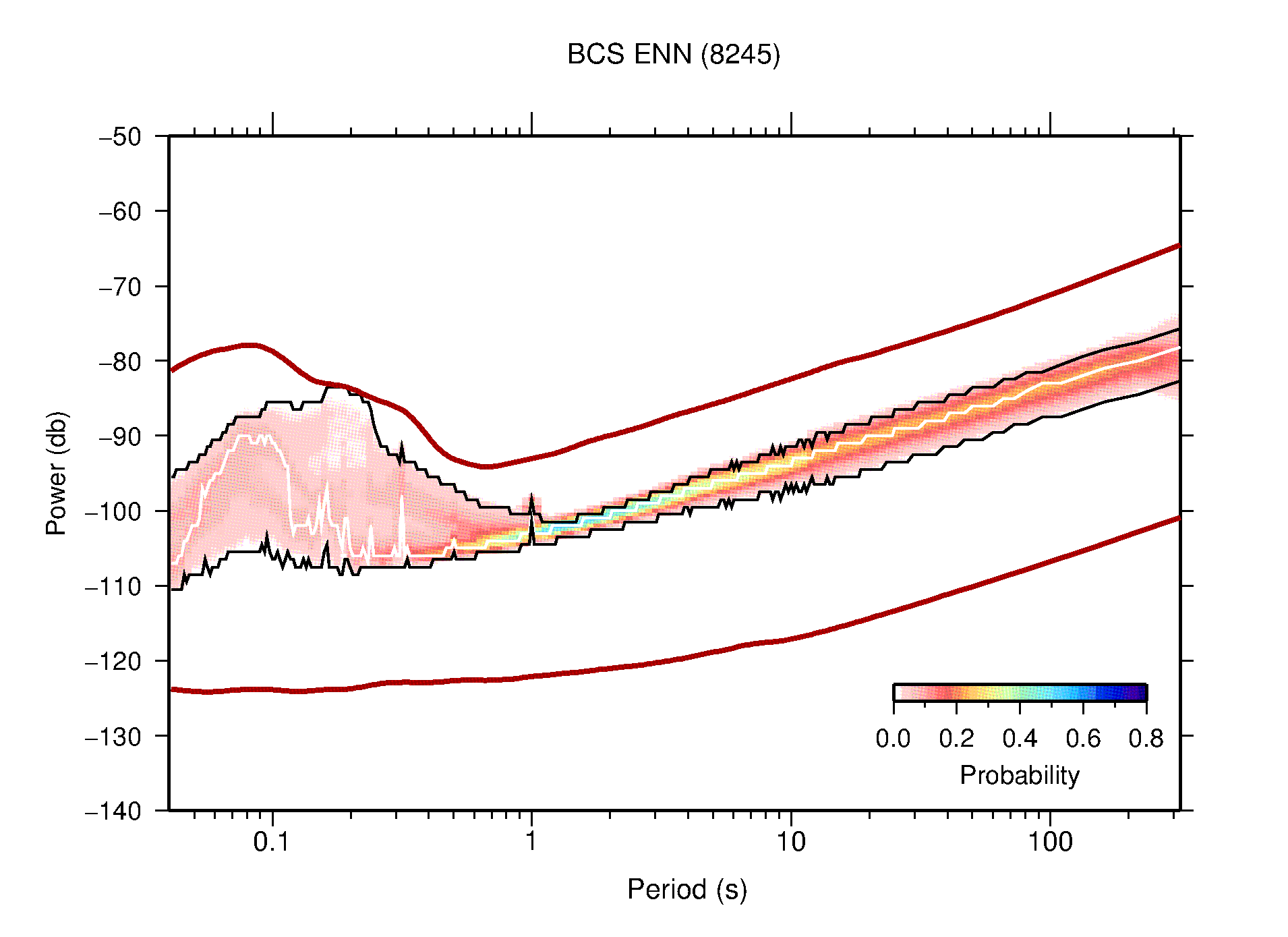 The following figures are full year PDFs for each of the 363 channels processed in this work. The same color scale is used thoughout. The black curves show 0.5 and 99.5 percentiles while the white curve shows the mode. The number of PSDs contributing to the PDF is shown in parentheses next to the station and channel names. The y-axes represent spectral acceleration amplitudes in units of db relative to 1 m/s2 [10log10(m2/s4/Hz)]. The five channels that were not included in the network PDF because of known problems were CCUT ENE,N,Z; HCSU ENE; and HER ENE.