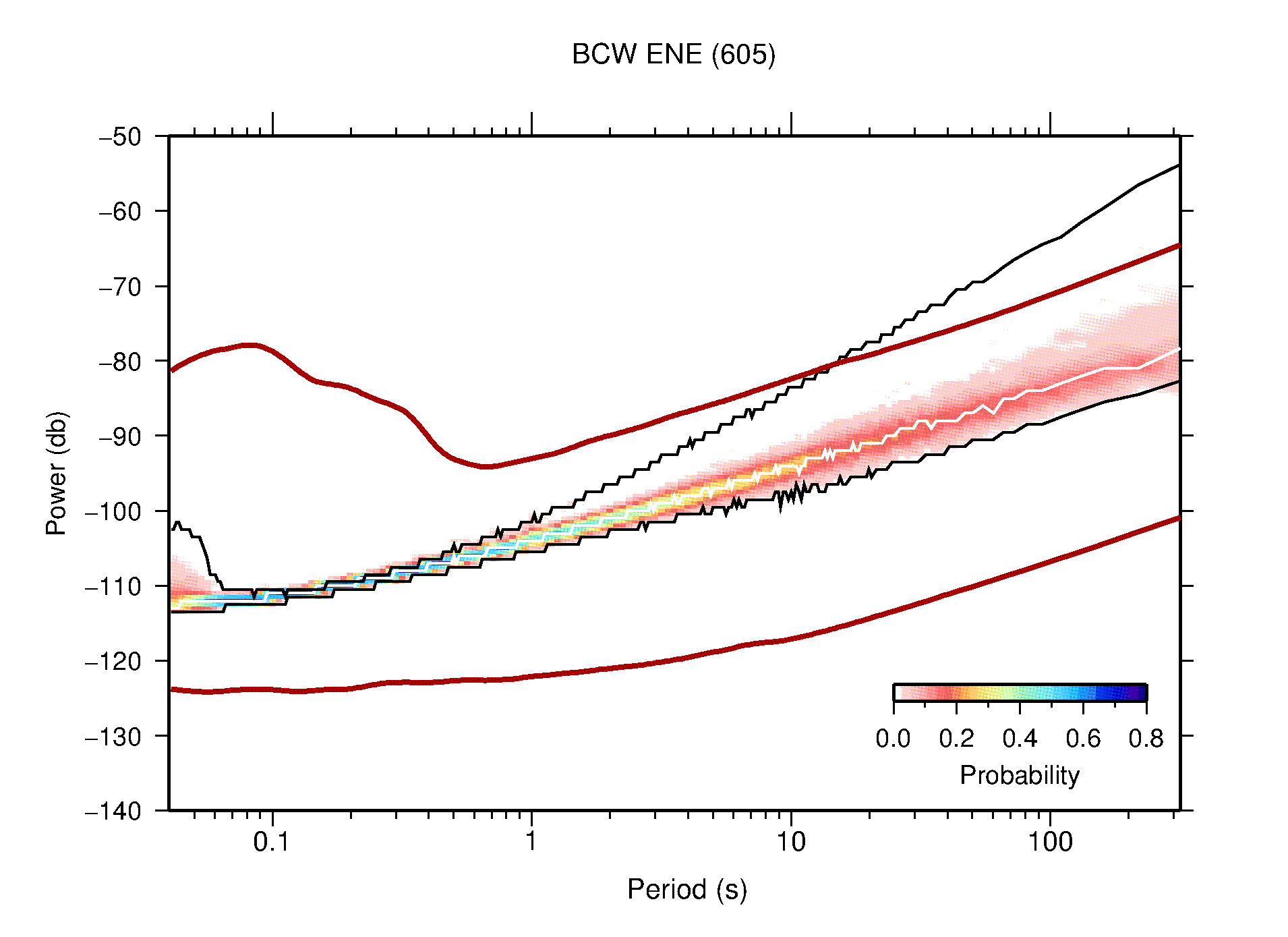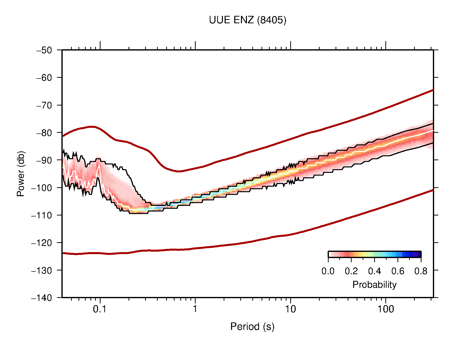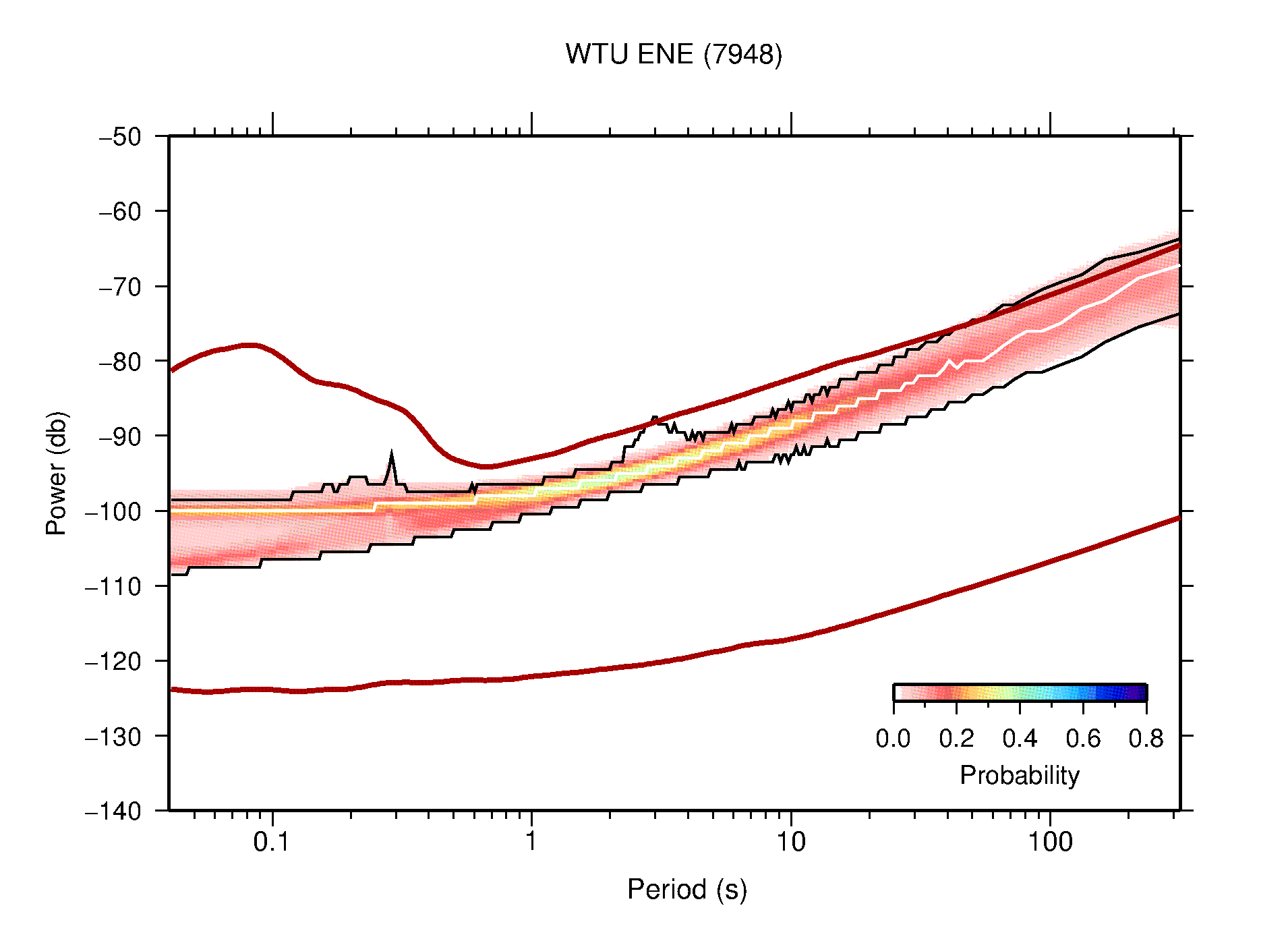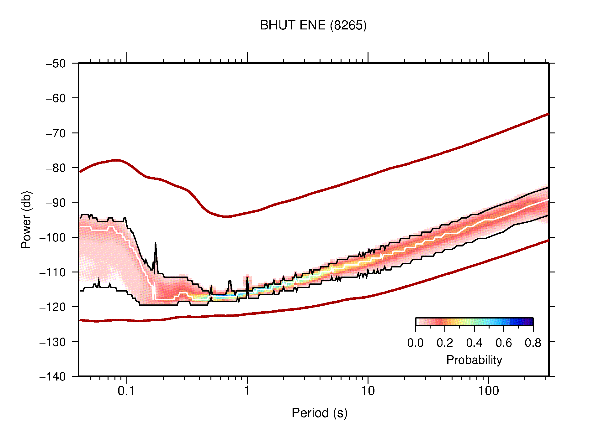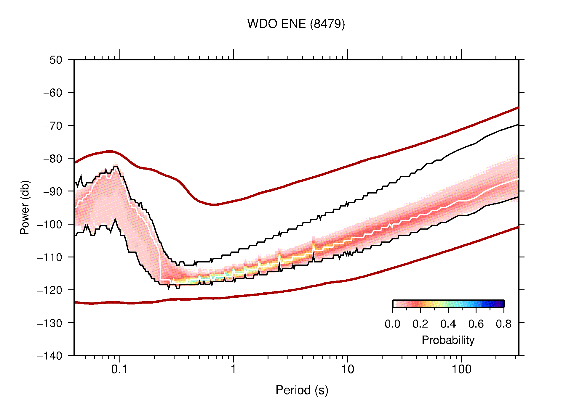 The following figures are full year PDFs for each of the 363 channels processed in this work. The same color scale is used thoughout. The black curves show 0.5 and 99.5 percentiles while the white curve shows the mode. The number of PSDs contributing to the PDF is shown in parentheses next to the station and channel names. The y-axes represent spectral acceleration amplitudes in units of db relative to 1 m/s2 [10log10(m2/s4/Hz)]. The five channels that were not included in the network PDF because of known problems were CCUT ENE,N,Z; HCSU ENE; and HER ENE.