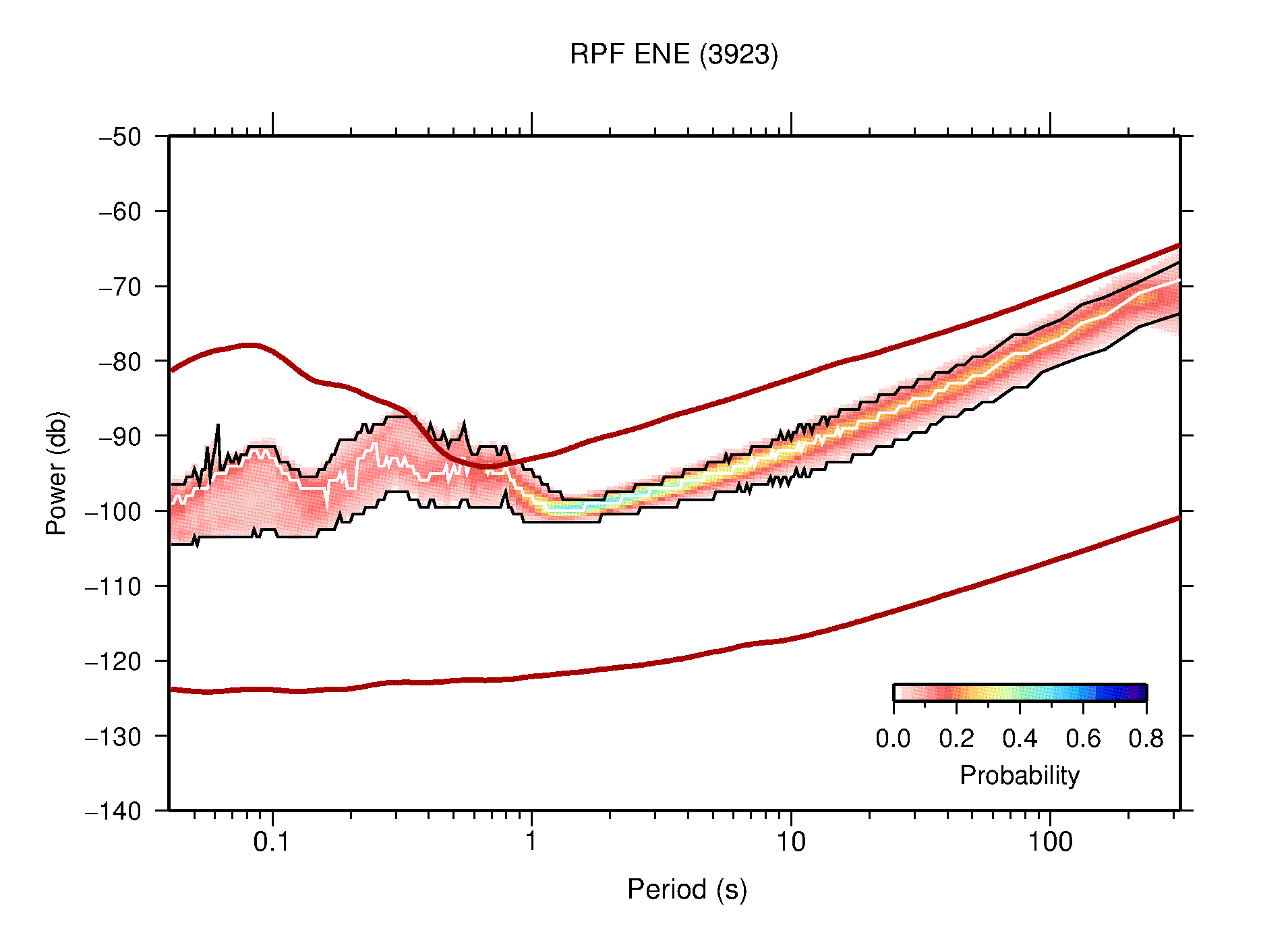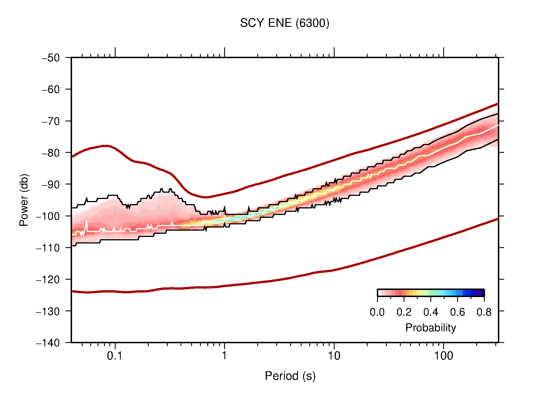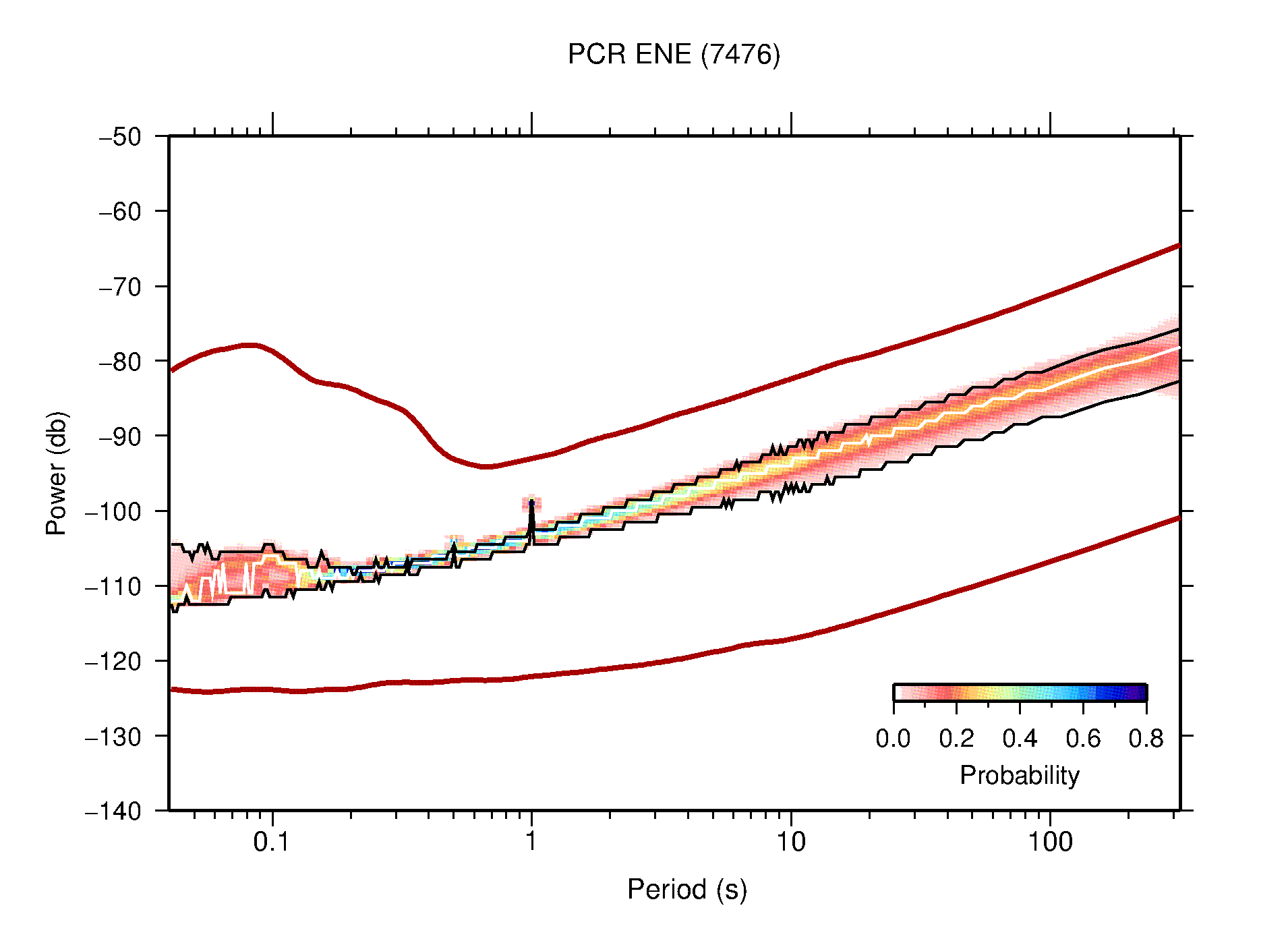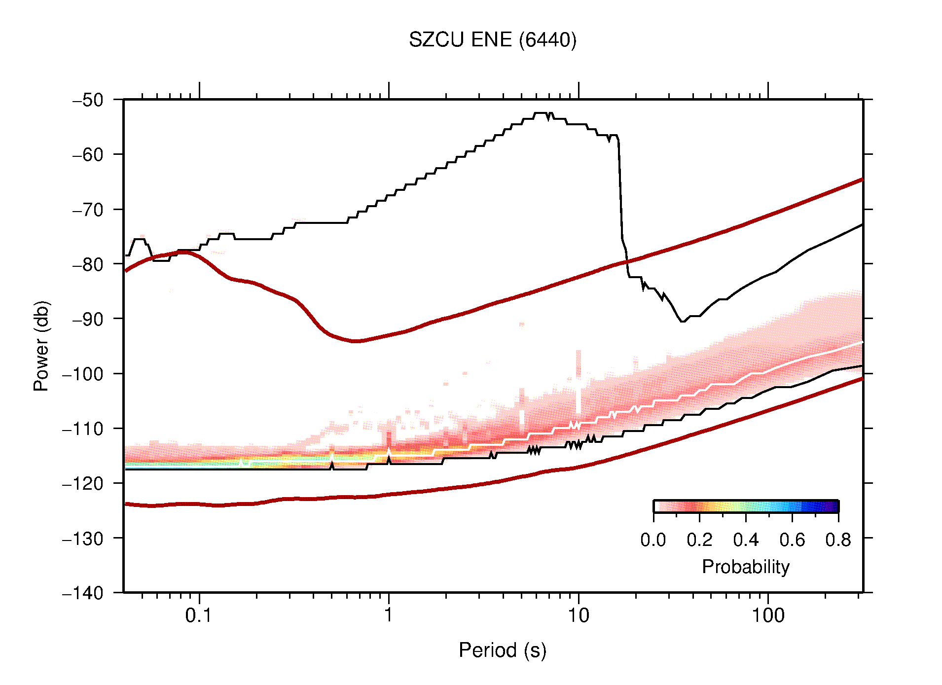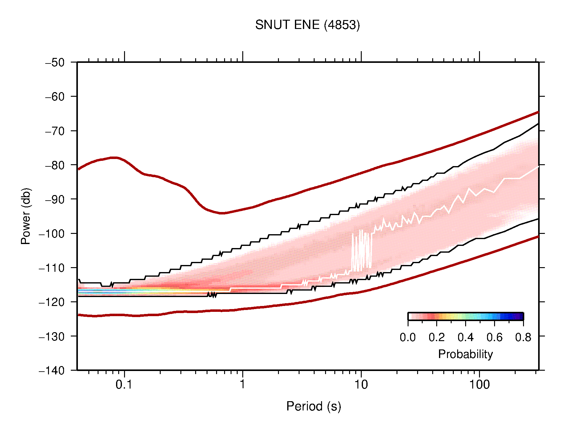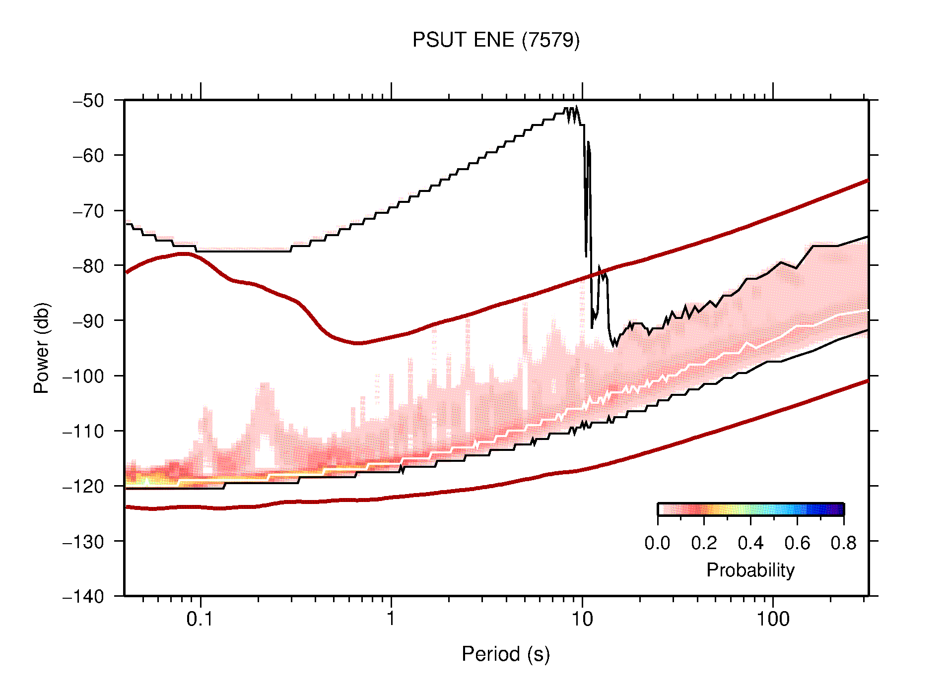 The following figures are full year PDFs for each of the 363 channels processed in this work. The same color scale is used thoughout. The black curves show 0.5 and 99.5 percentiles while the white curve shows the mode. The number of PSDs contributing to the PDF is shown in parentheses next to the station and channel names. The y-axes represent spectral acceleration amplitudes in units of db relative to 1 m/s2 [10log10(m2/s4/Hz)]. The five channels that were not included in the network PDF because of known problems were CCUT ENE,N,Z; HCSU ENE; and HER ENE.