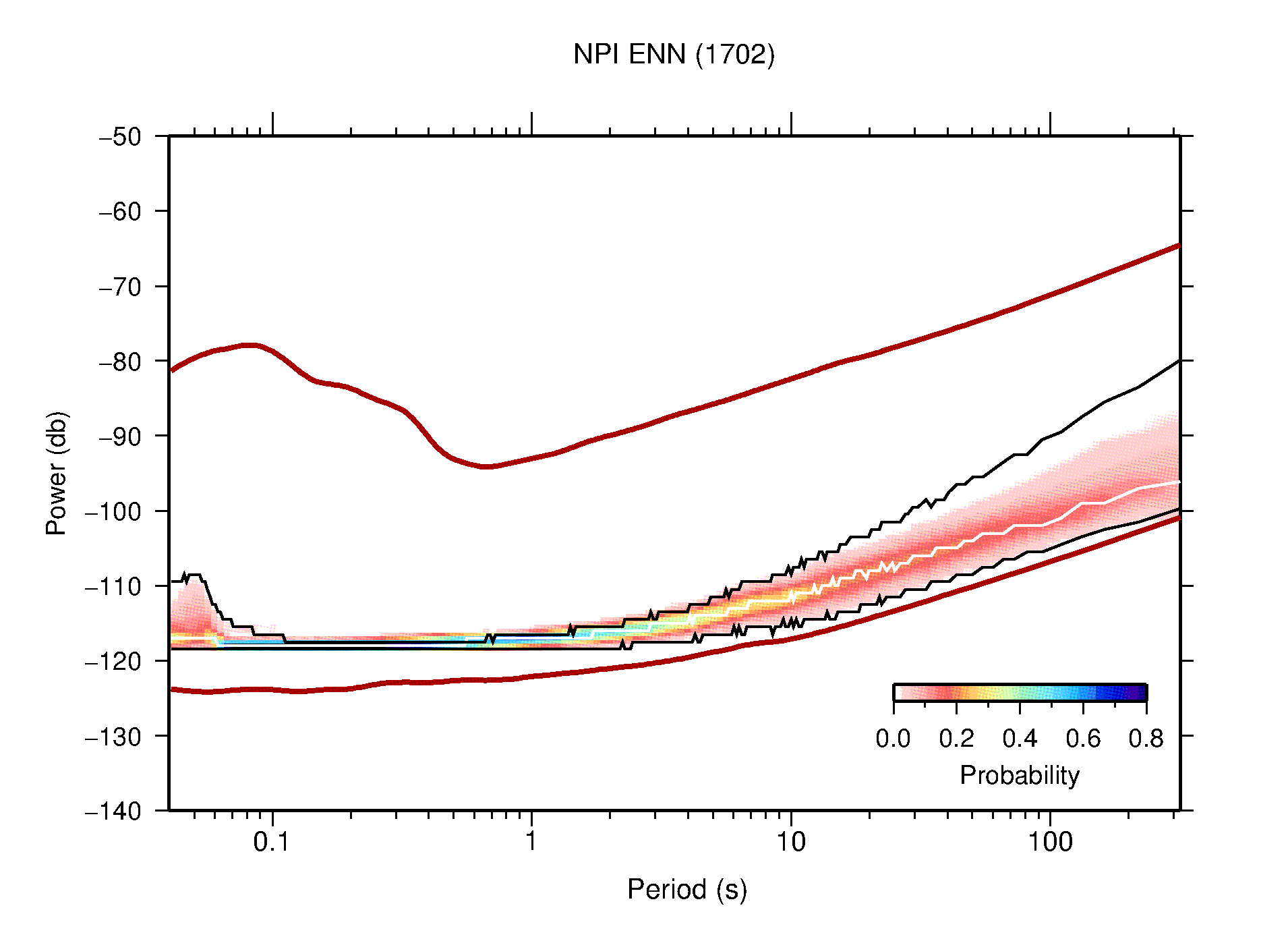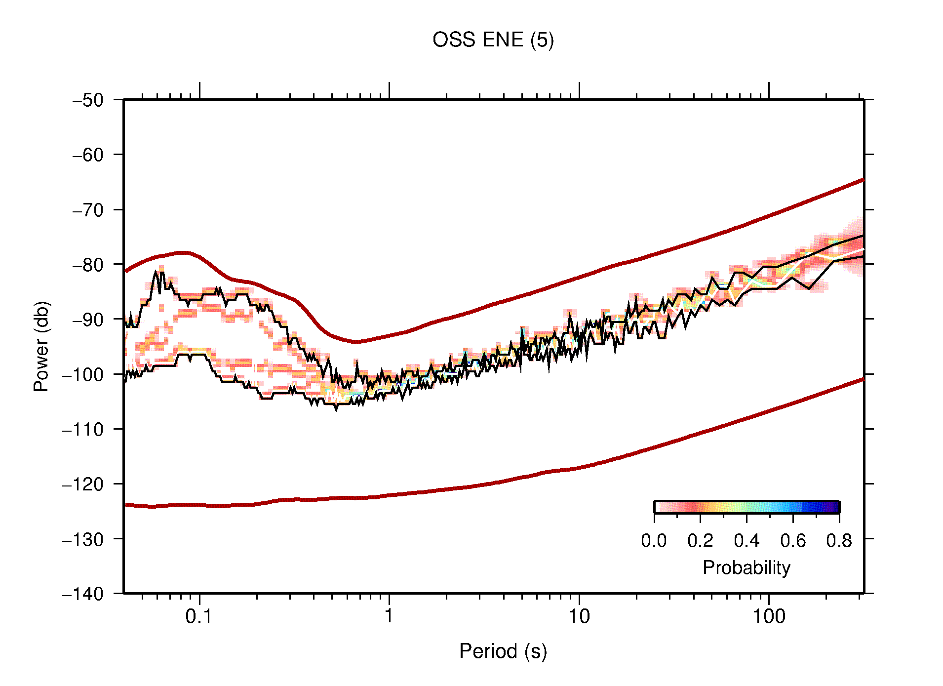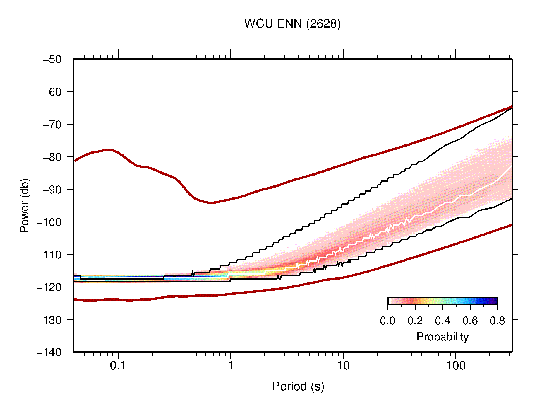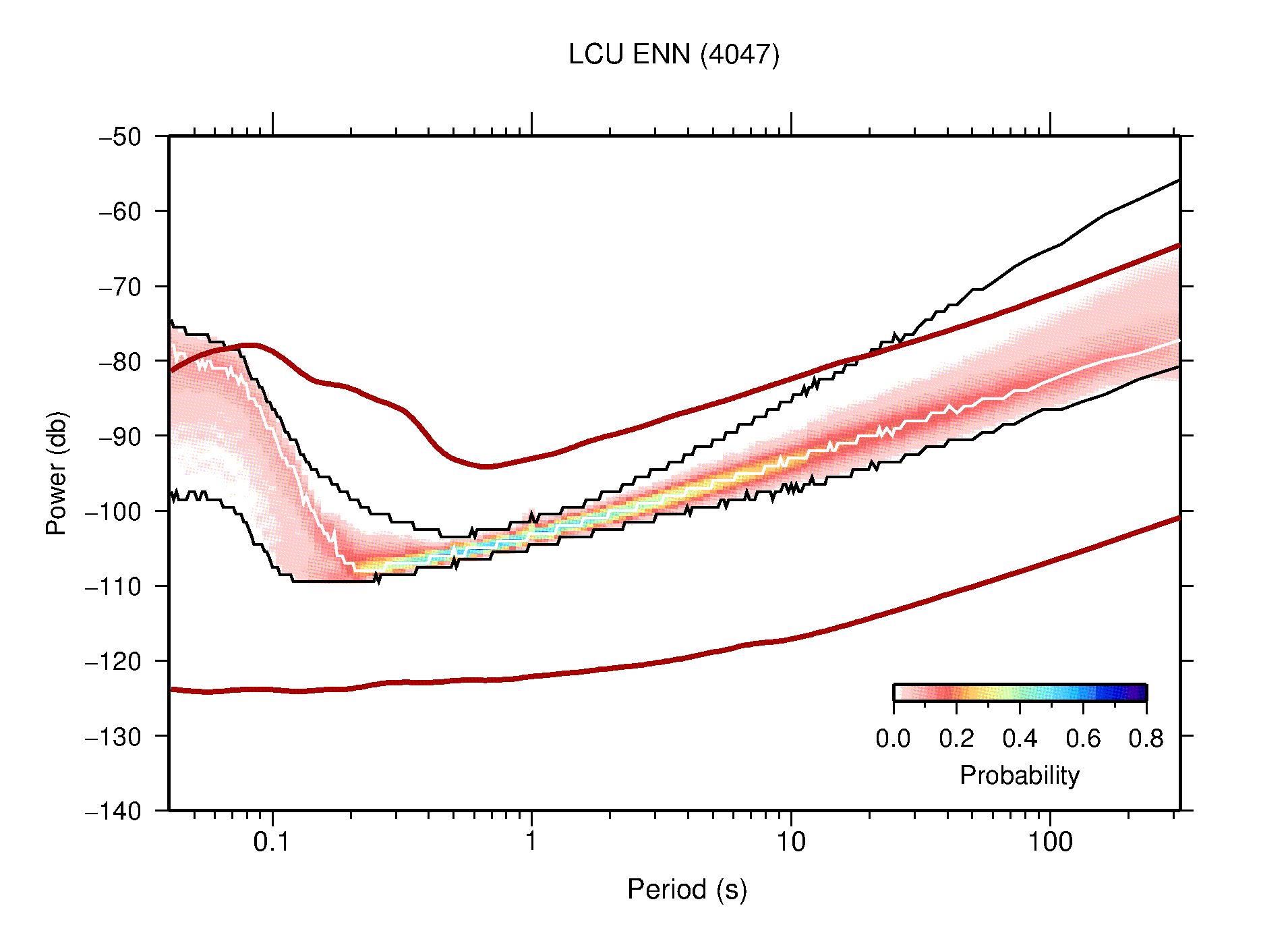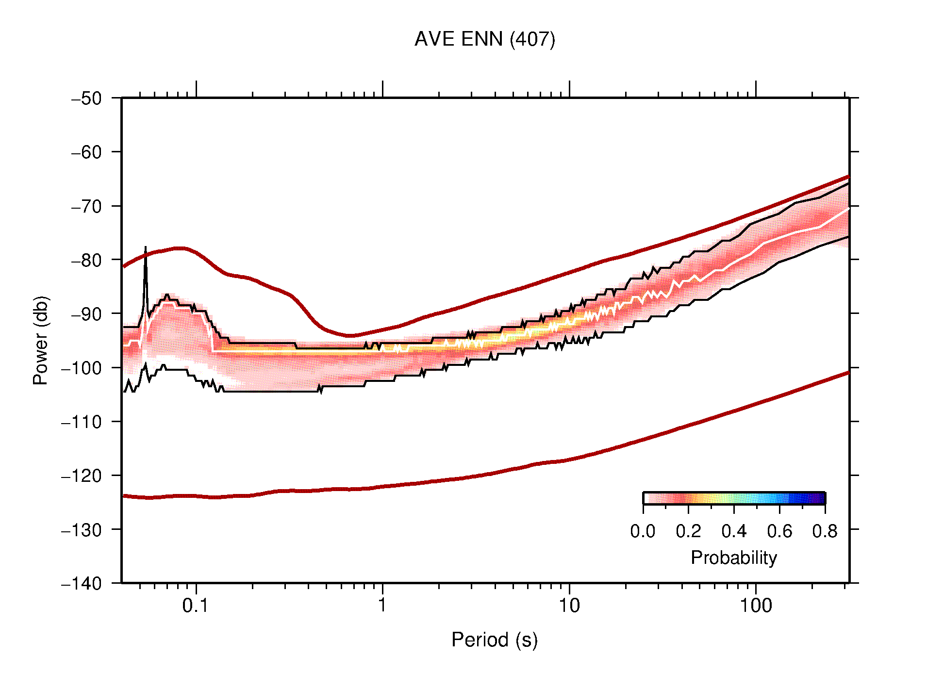 The following figures are full year PDFs for each of the 363 channels processed in this work. The same color scale is used thoughout. The black curves show 0.5 and 99.5 percentiles while the white curve shows the mode. The number of PSDs contributing to the PDF is shown in parentheses next to the station and channel names. The y-axes represent spectral acceleration amplitudes in units of db relative to 1 m/s2 [10log10(m2/s4/Hz)]. The five channels that were not included in the network PDF because of known problems were CCUT ENE,N,Z; HCSU ENE; and HER ENE.