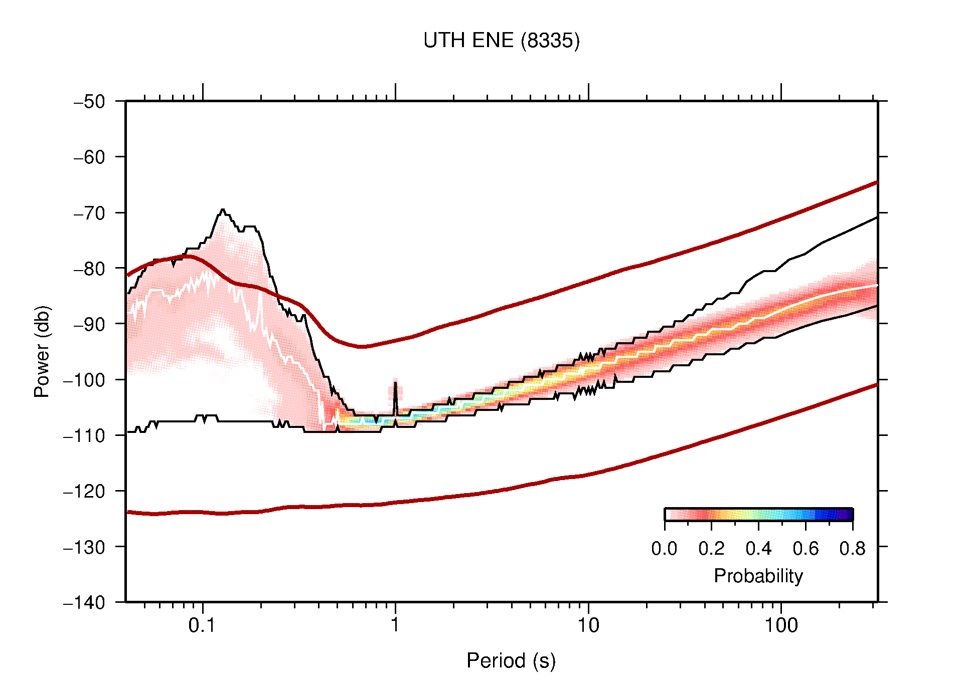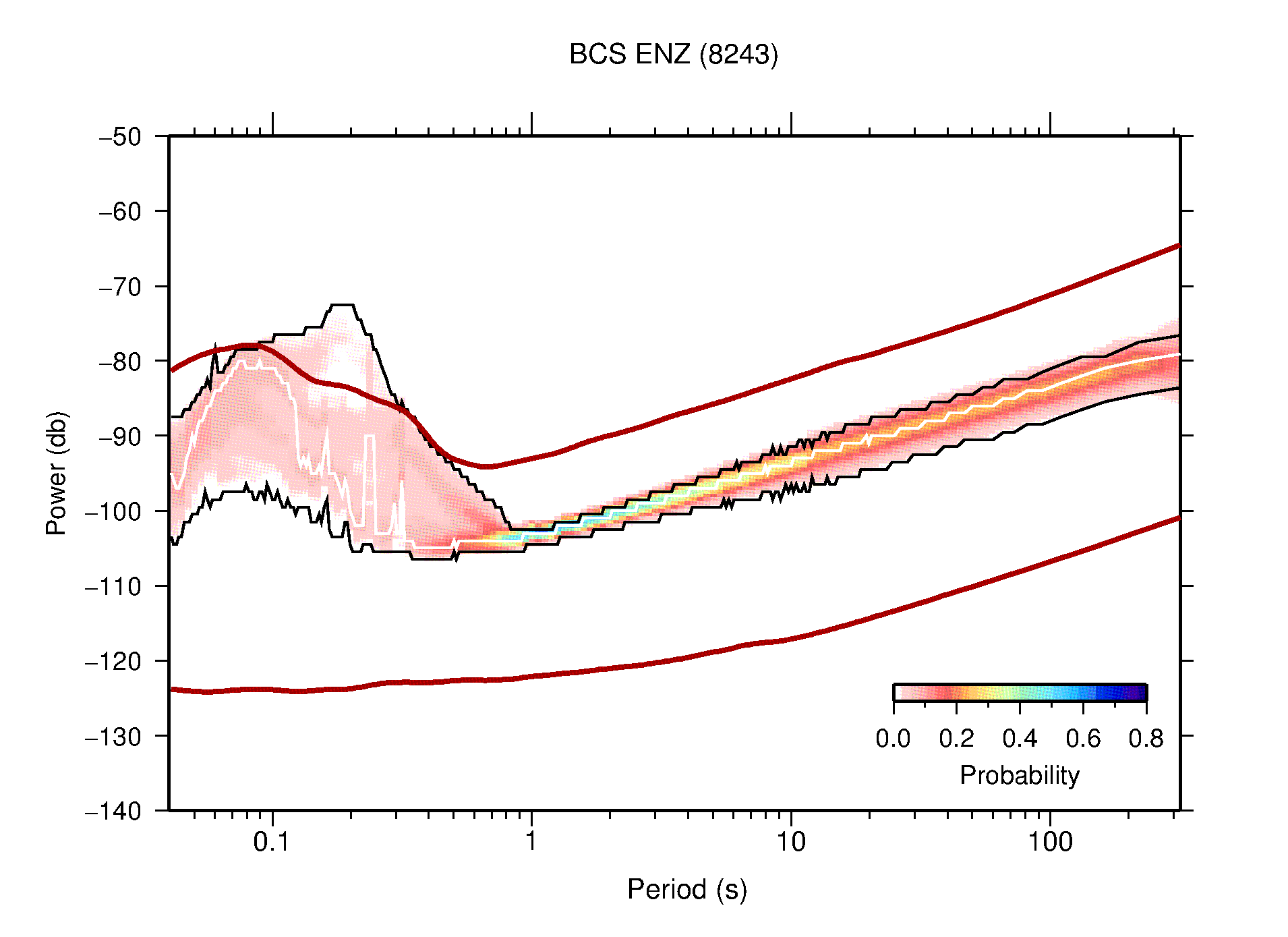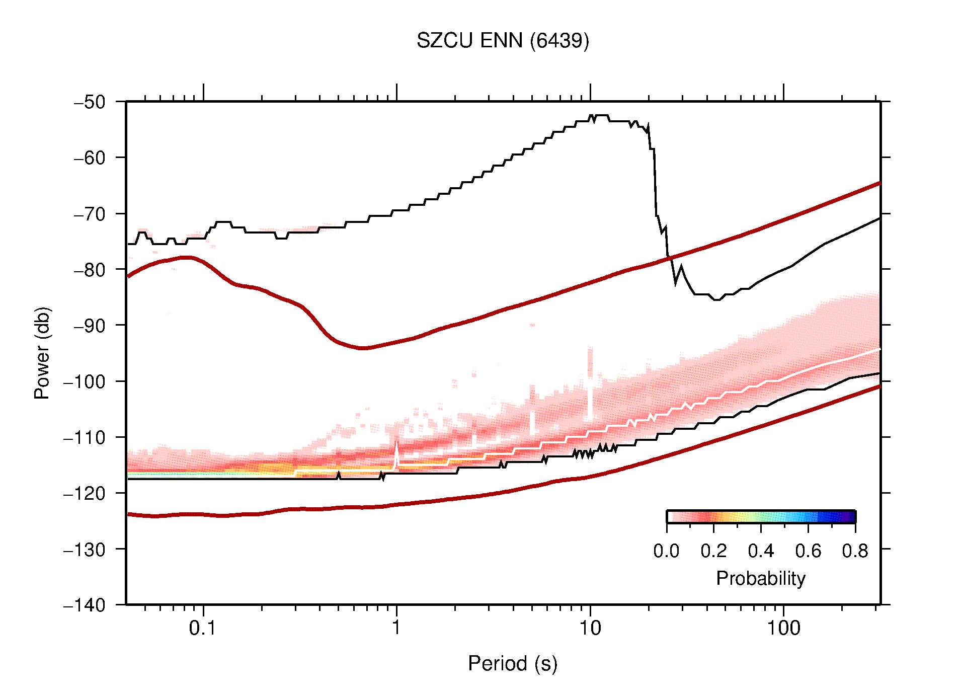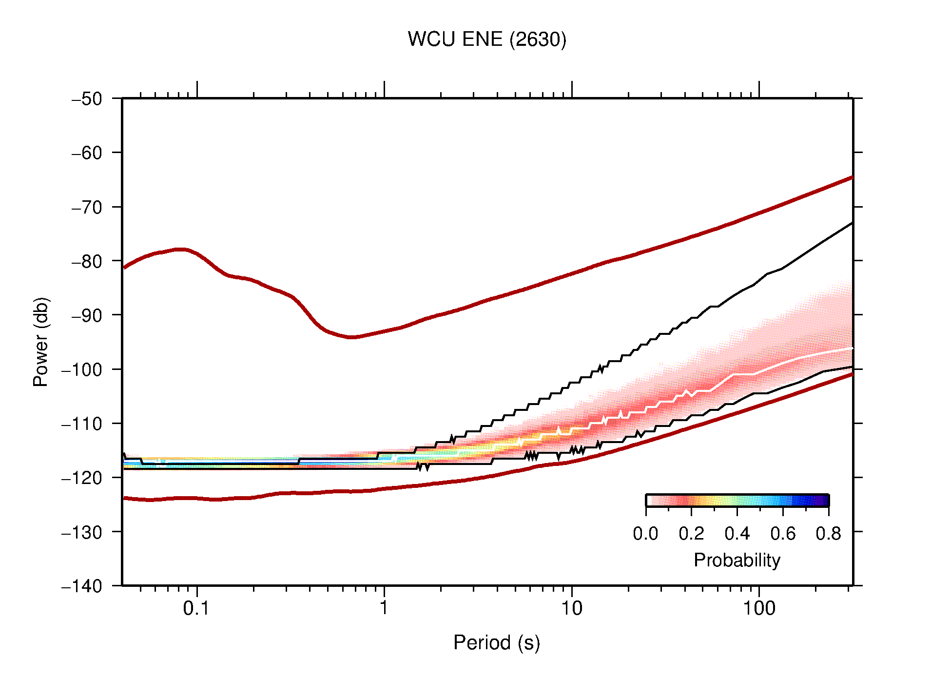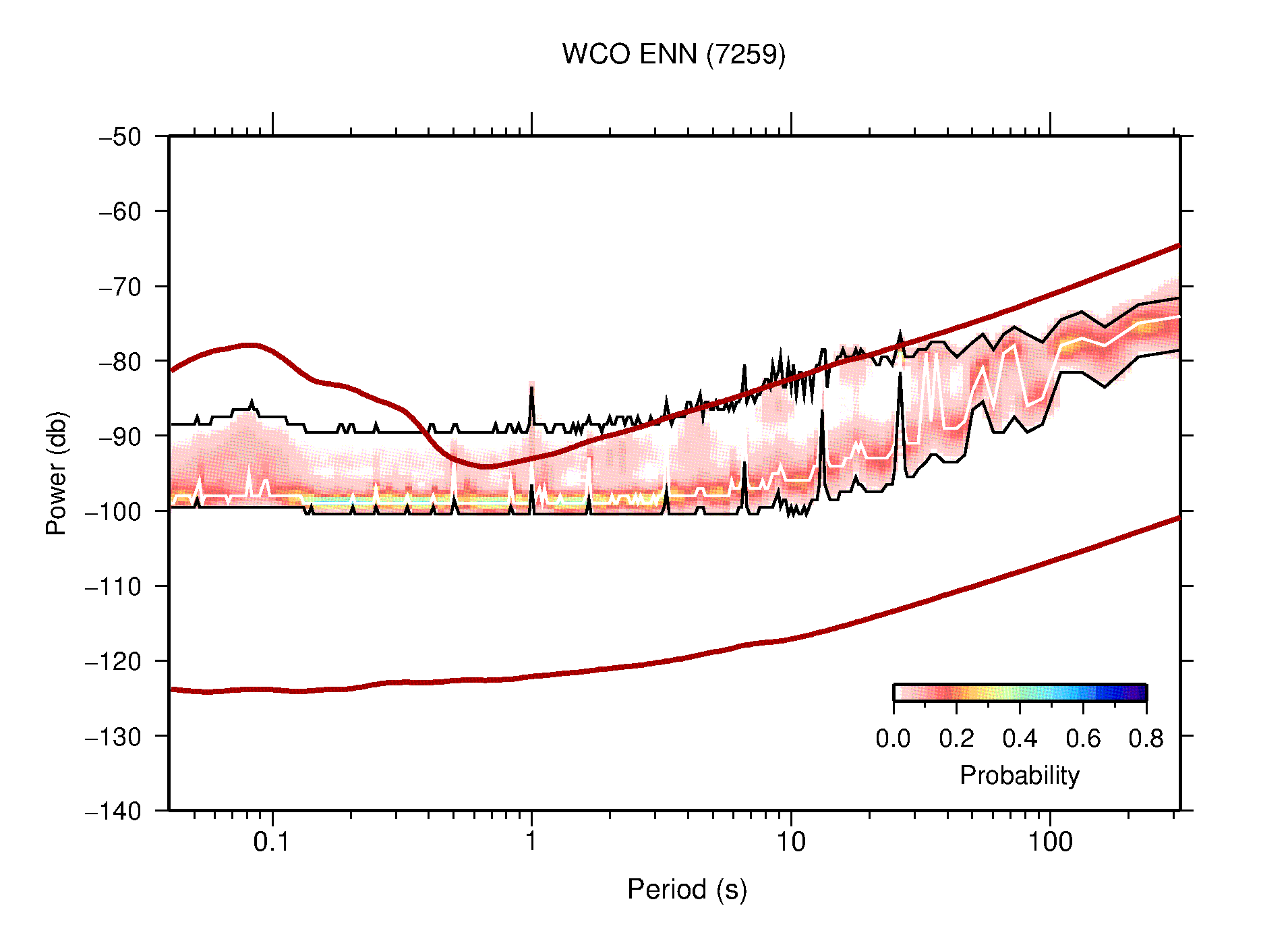 The following figures are full year PDFs for each of the 363 channels processed in this work. The same color scale is used thoughout. The black curves show 0.5 and 99.5 percentiles while the white curve shows the mode. The number of PSDs contributing to the PDF is shown in parentheses next to the station and channel names. The y-axes represent spectral acceleration amplitudes in units of db relative to 1 m/s2 [10log10(m2/s4/Hz)]. The five channels that were not included in the network PDF because of known problems were CCUT ENE,N,Z; HCSU ENE; and HER ENE.