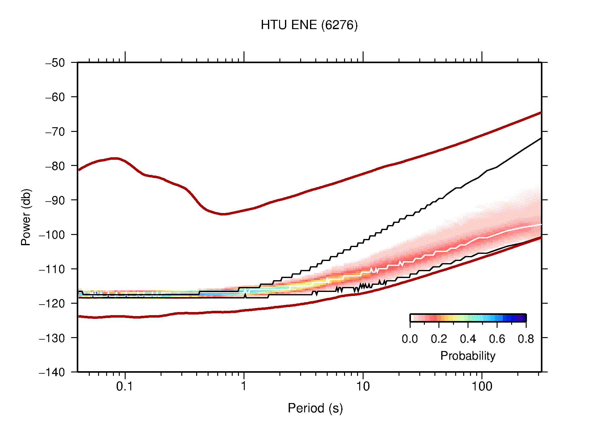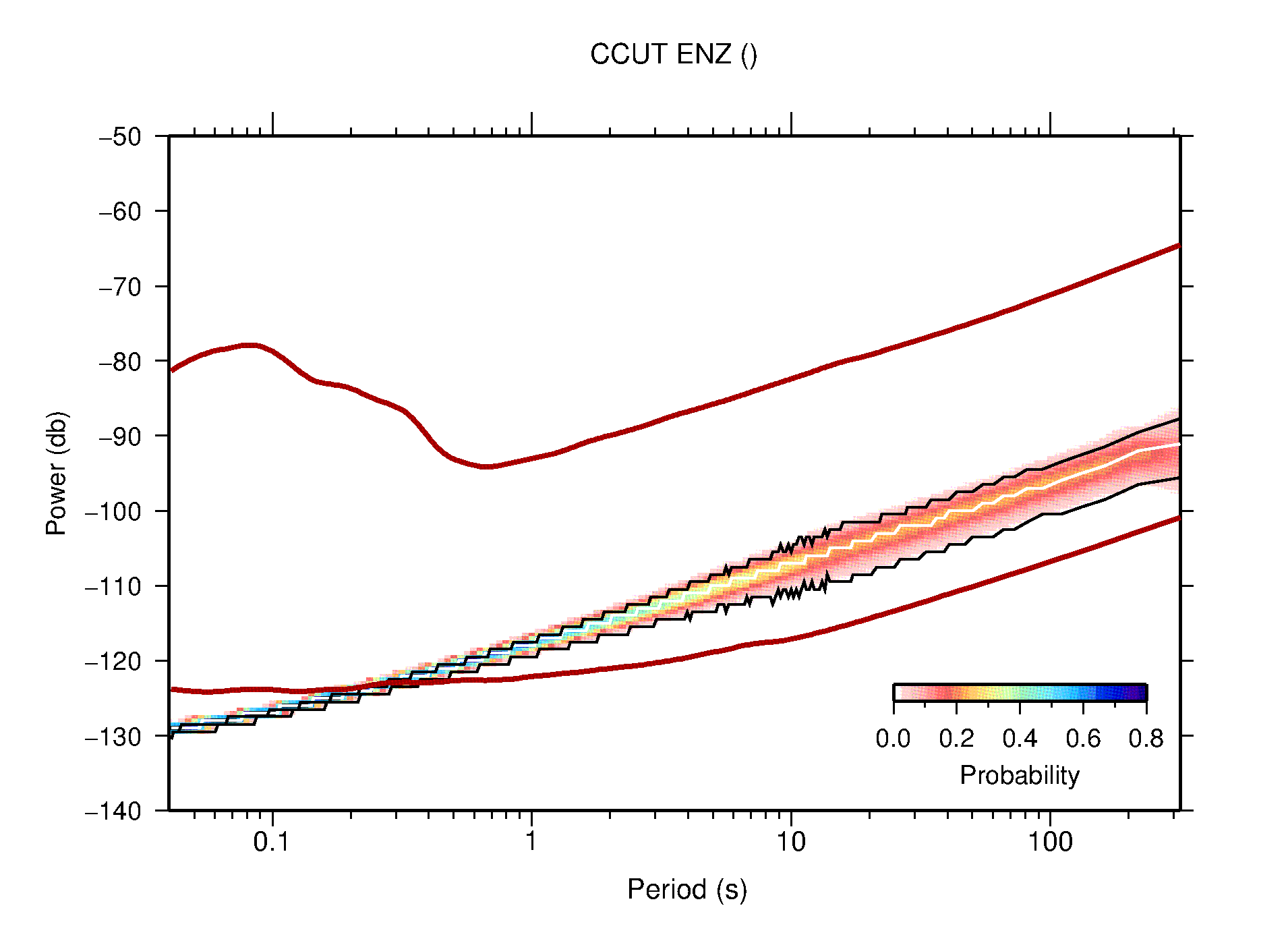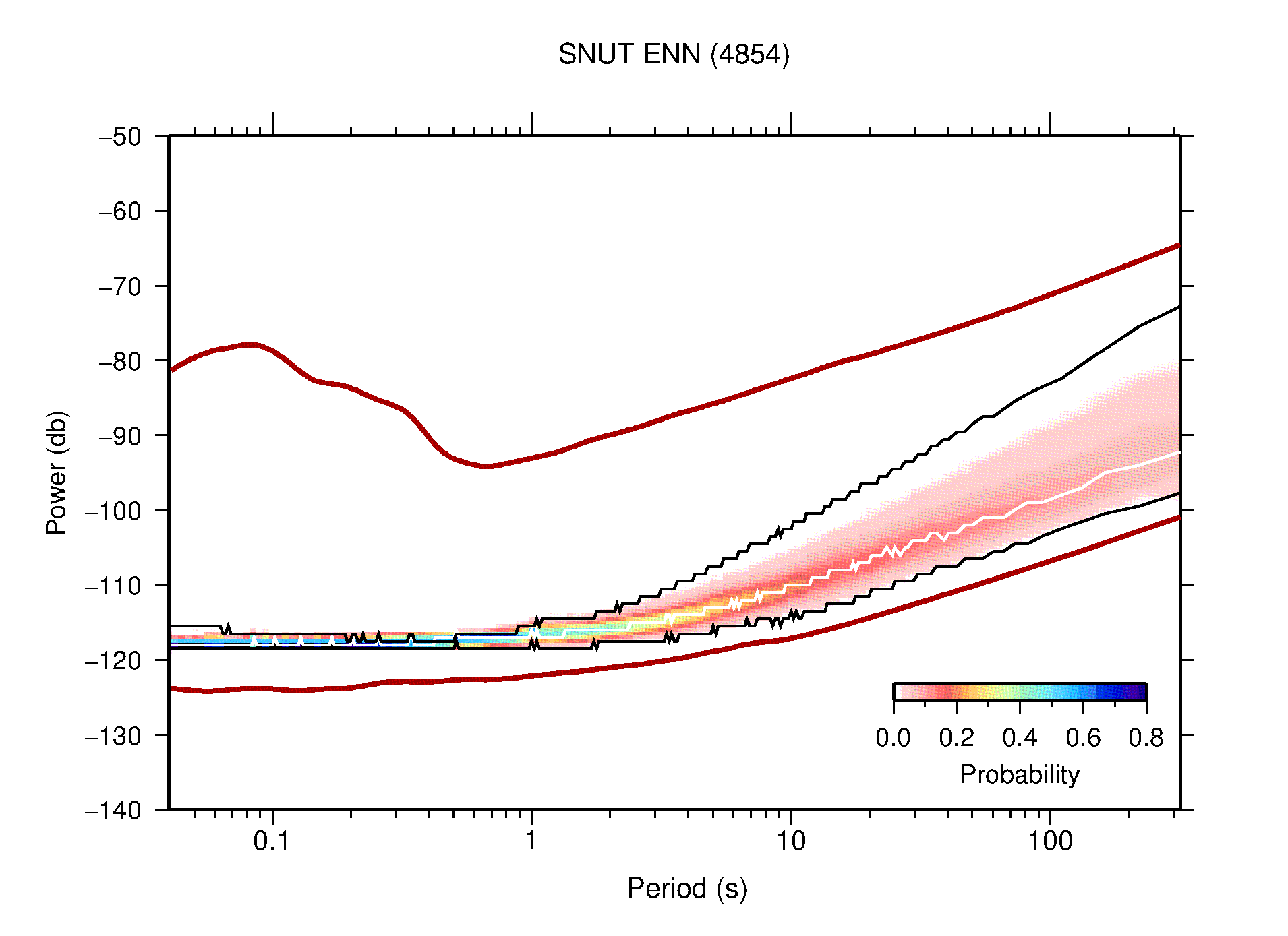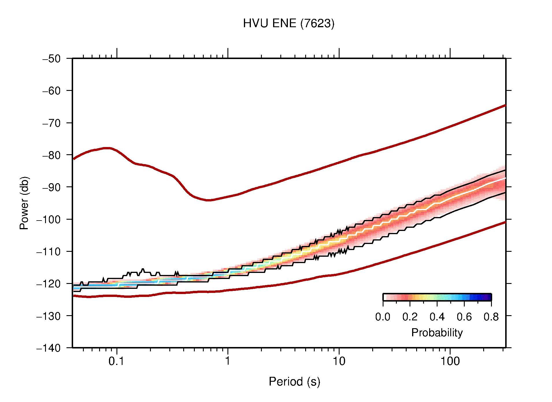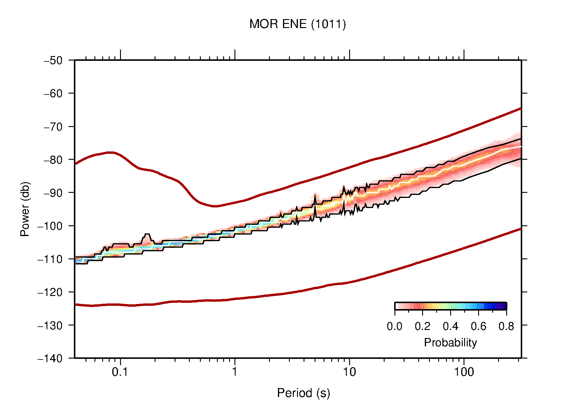 The following figures are full year PDFs for each of the 363 channels processed in this work. The same color scale is used thoughout. The black curves show 0.5 and 99.5 percentiles while the white curve shows the mode. The number of PSDs contributing to the PDF is shown in parentheses next to the station and channel names. The y-axes represent spectral acceleration amplitudes in units of db relative to 1 m/s2 [10log10(m2/s4/Hz)]. The five channels that were not included in the network PDF because of known problems were CCUT ENE,N,Z; HCSU ENE; and HER ENE.